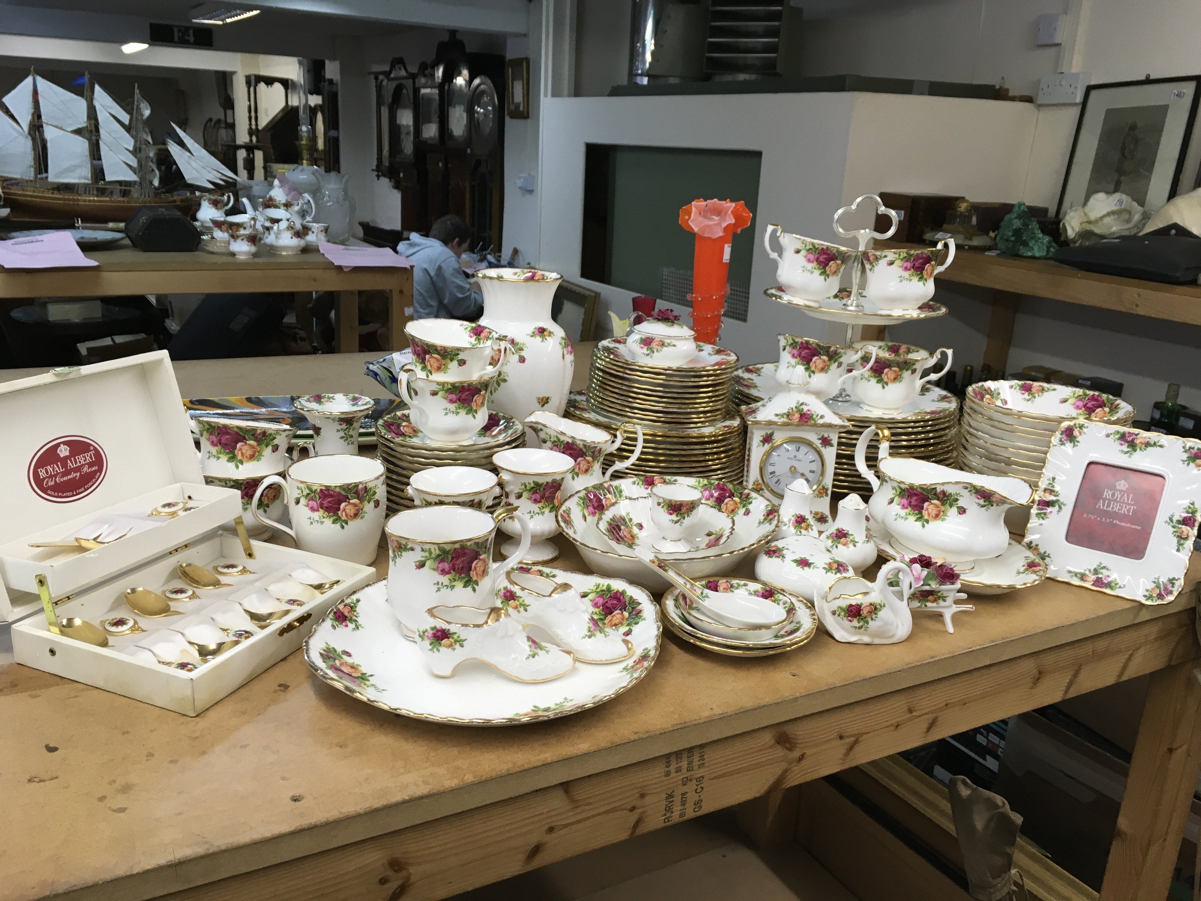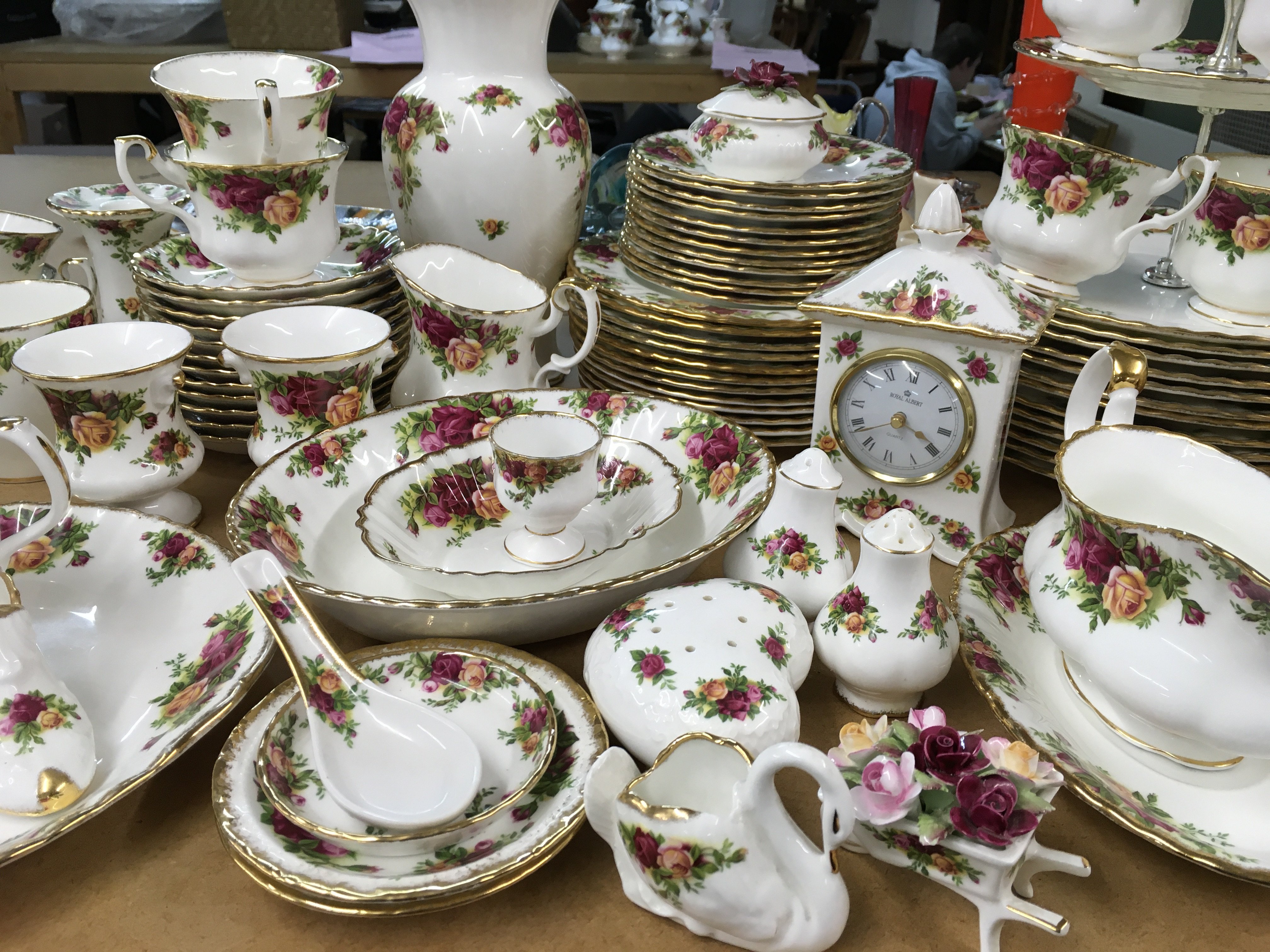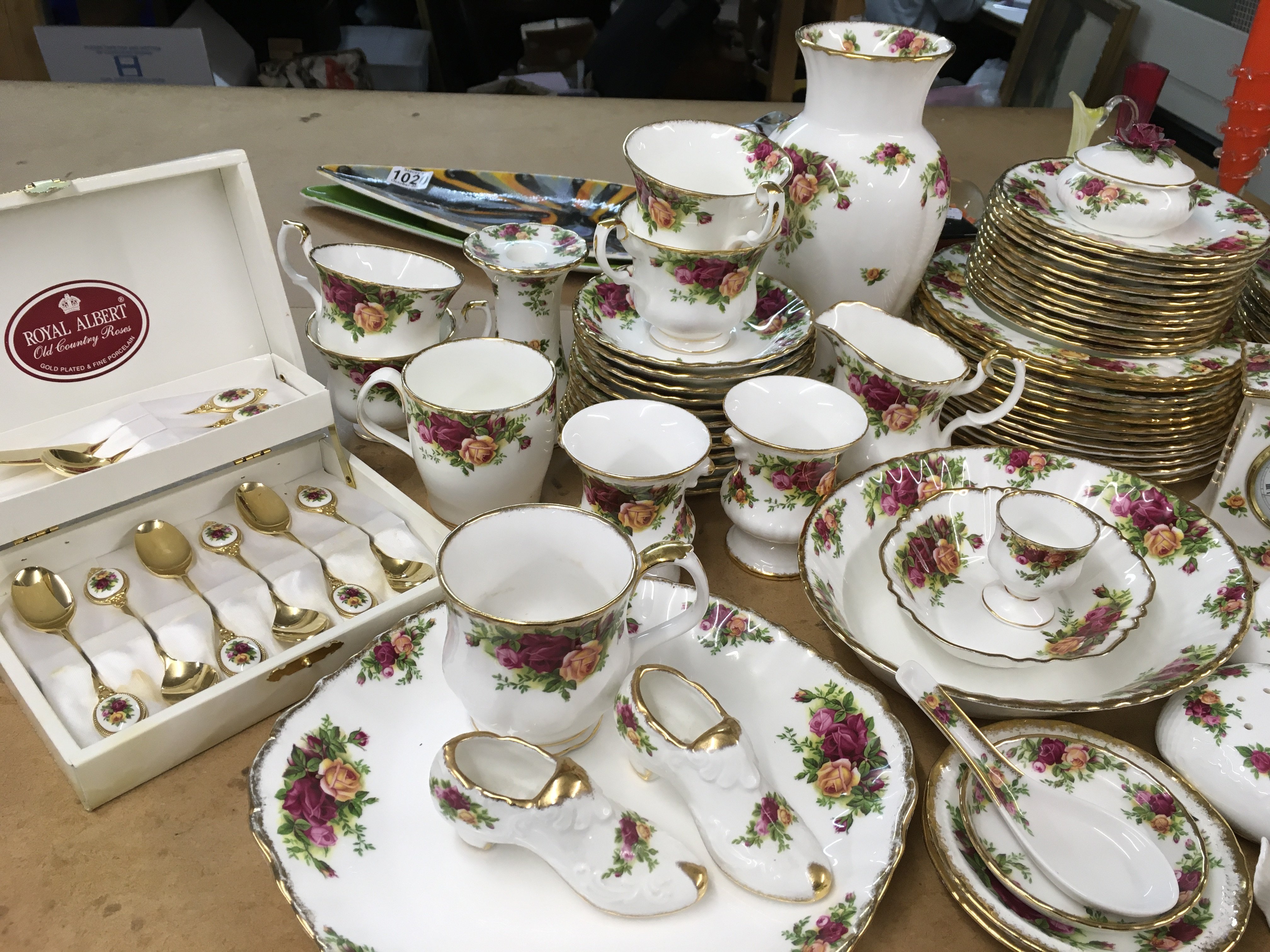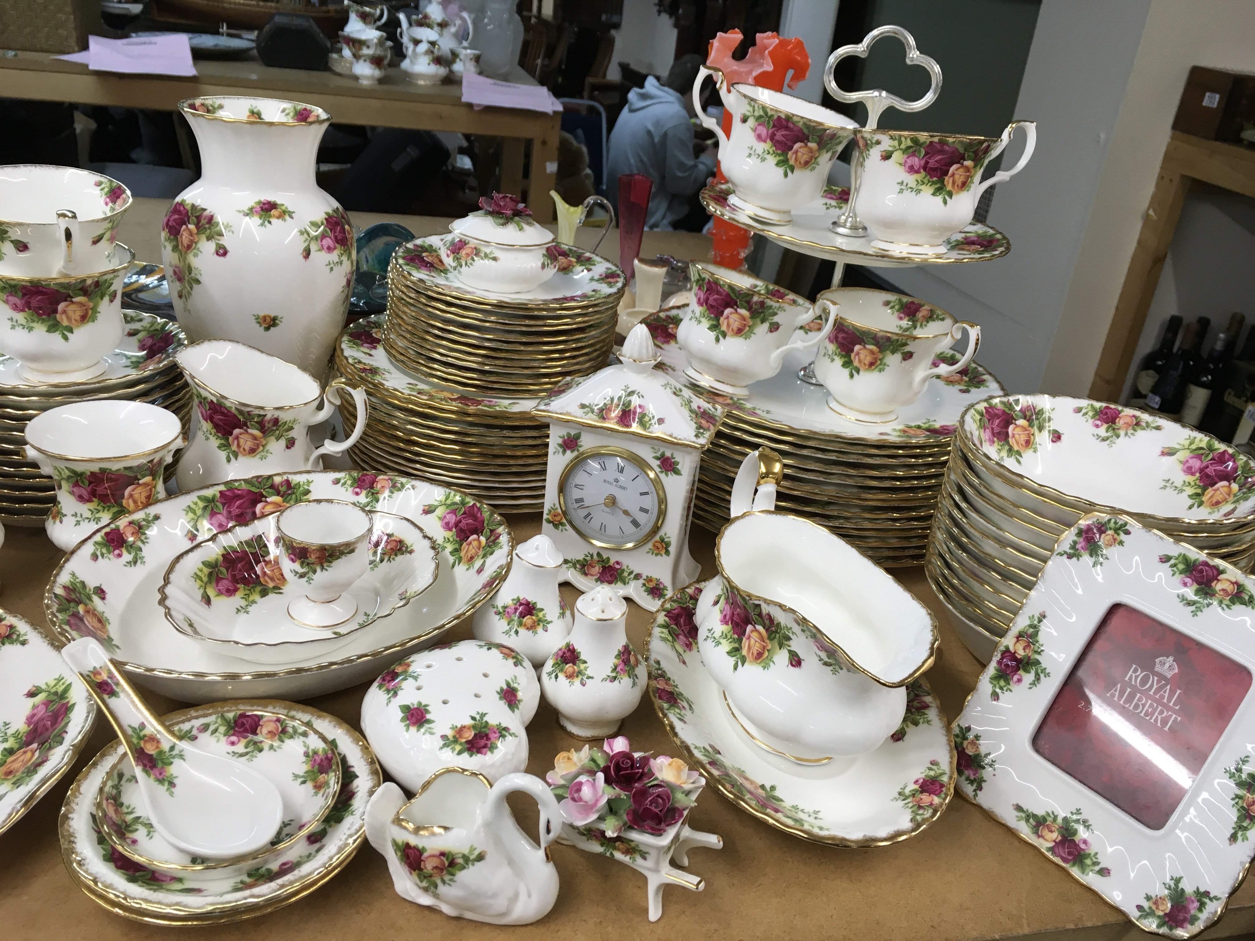 A large collection of Royal Albert Old English Country Roses tea and dinner service set- including heart posy vase, lidded trinket box, candlestick holder, gravy boat, photo frame etc- some with possible second quality. NO RESERVE