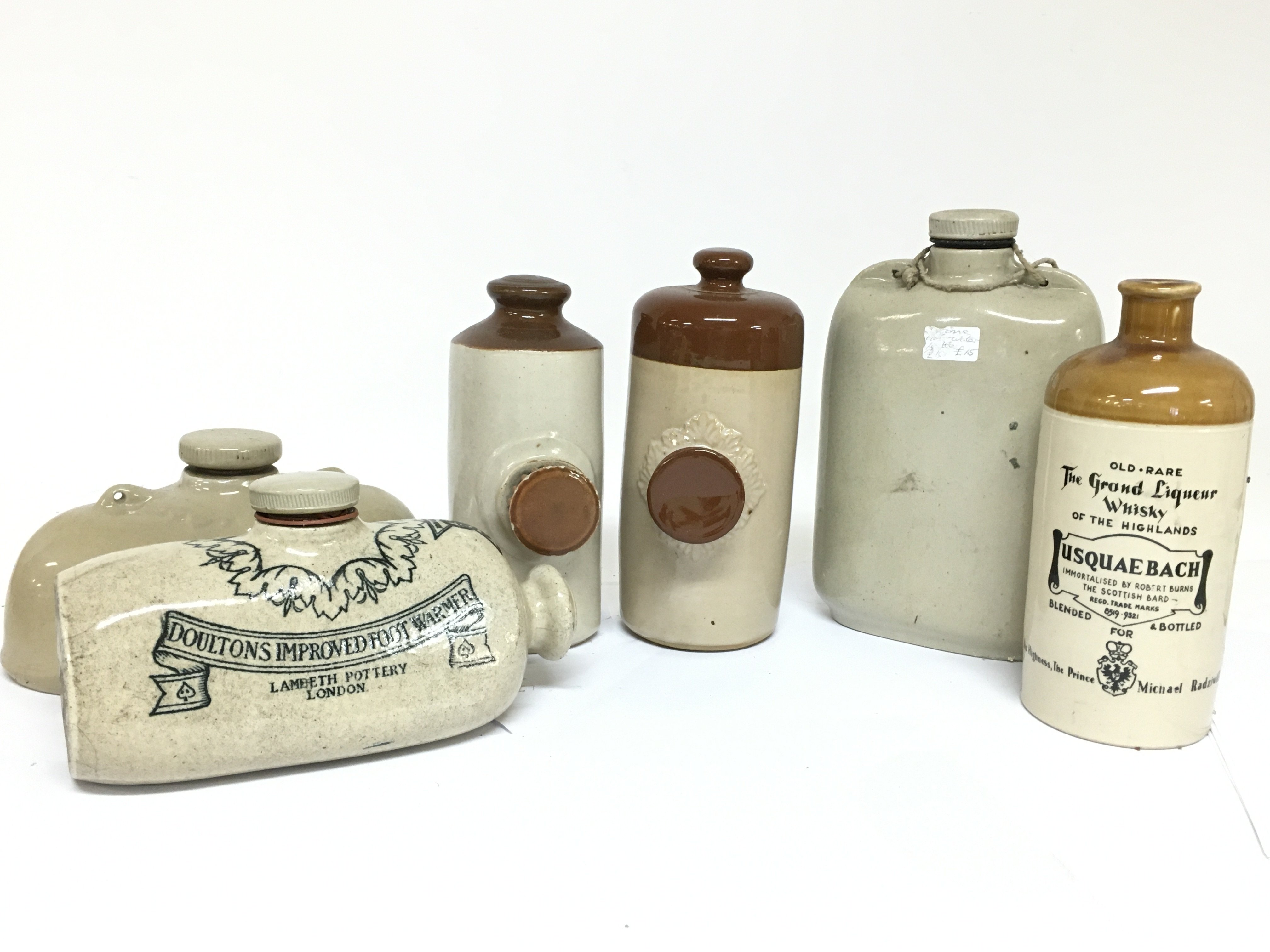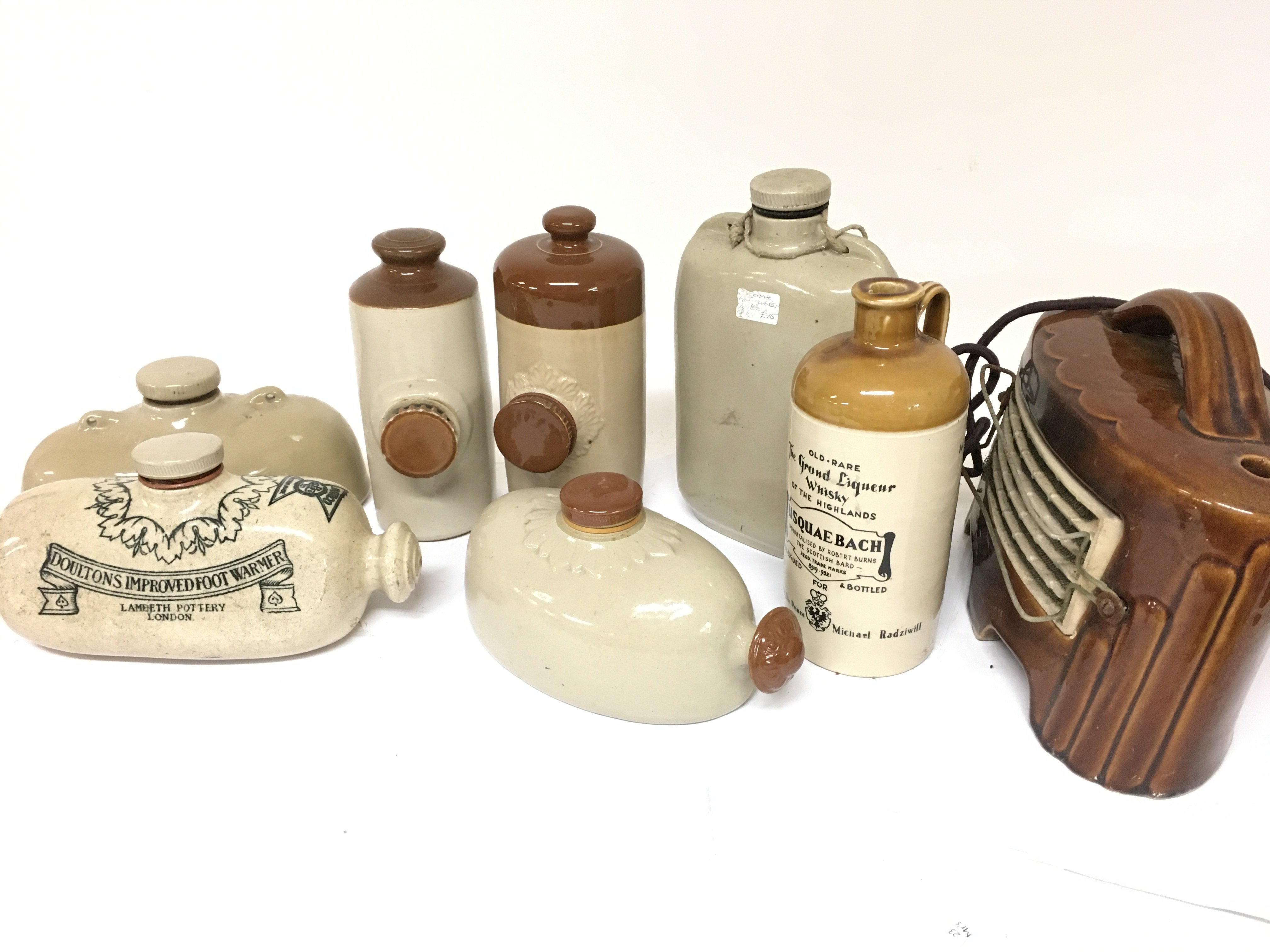 A Collection of stoneware bottles including a Usquaebach Scottish whisky bottle, Doulton Improved foot warmer etc