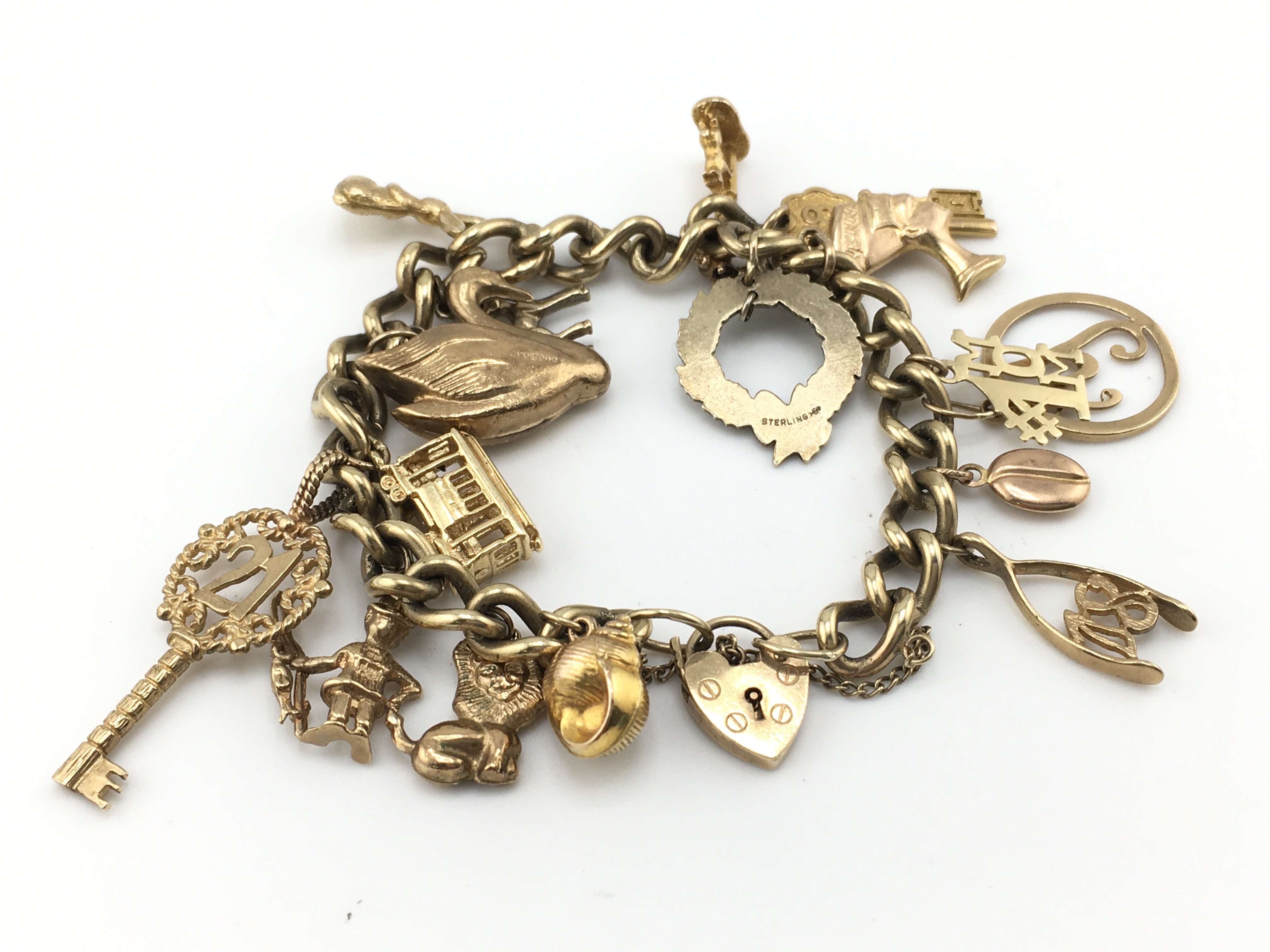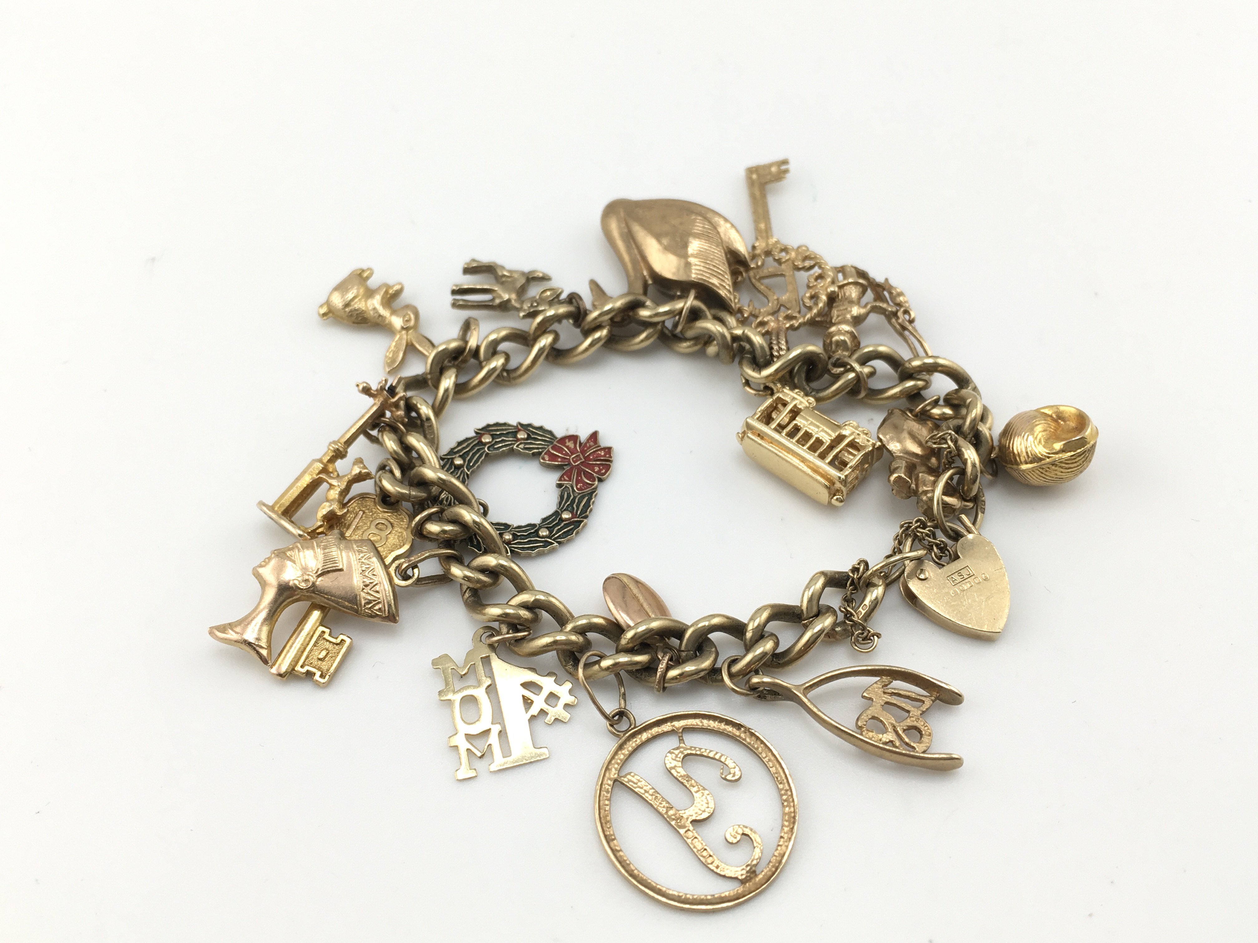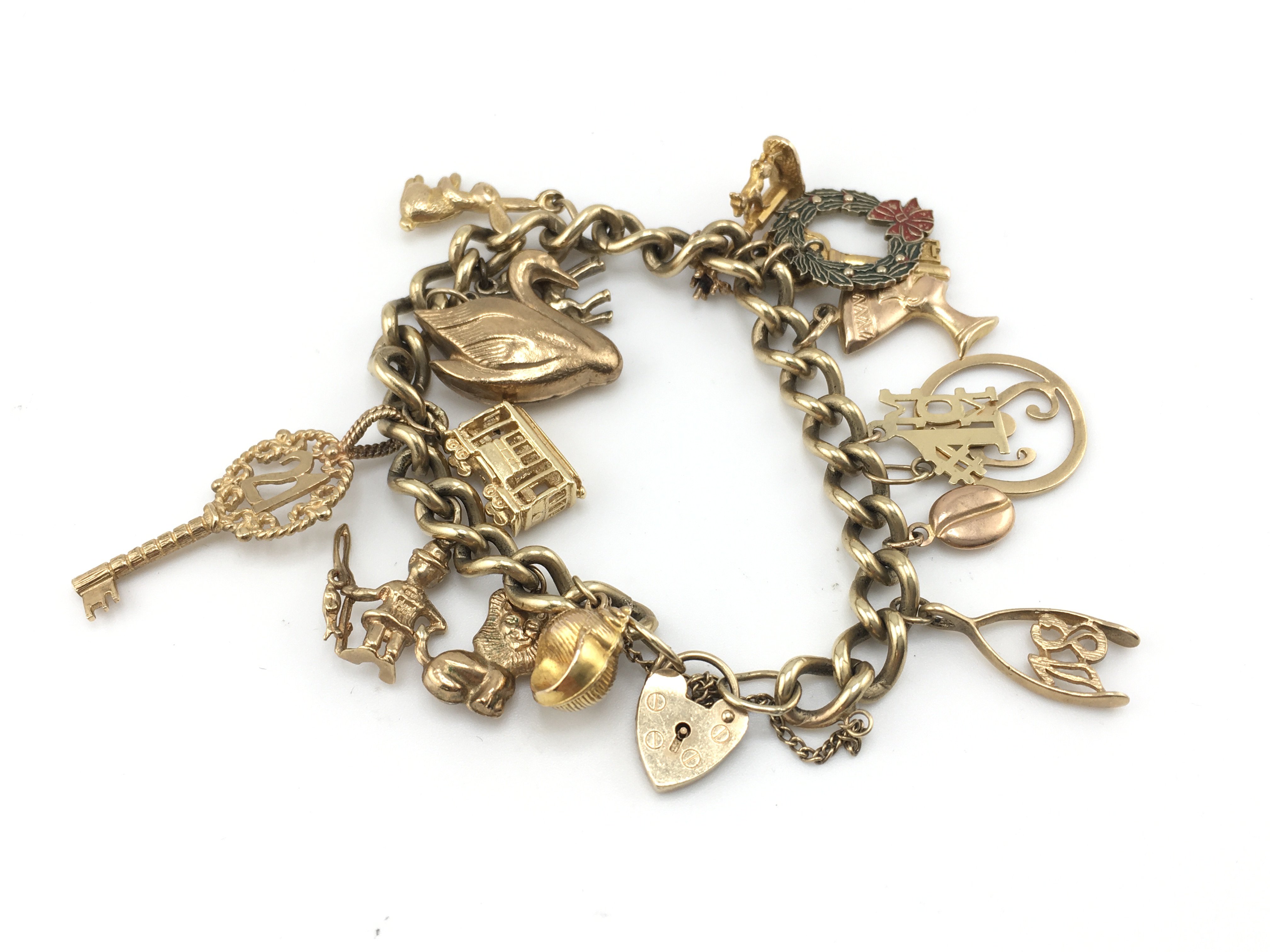 A 9ct gold charm bracelet with multiple charms. 47.40g Postage A