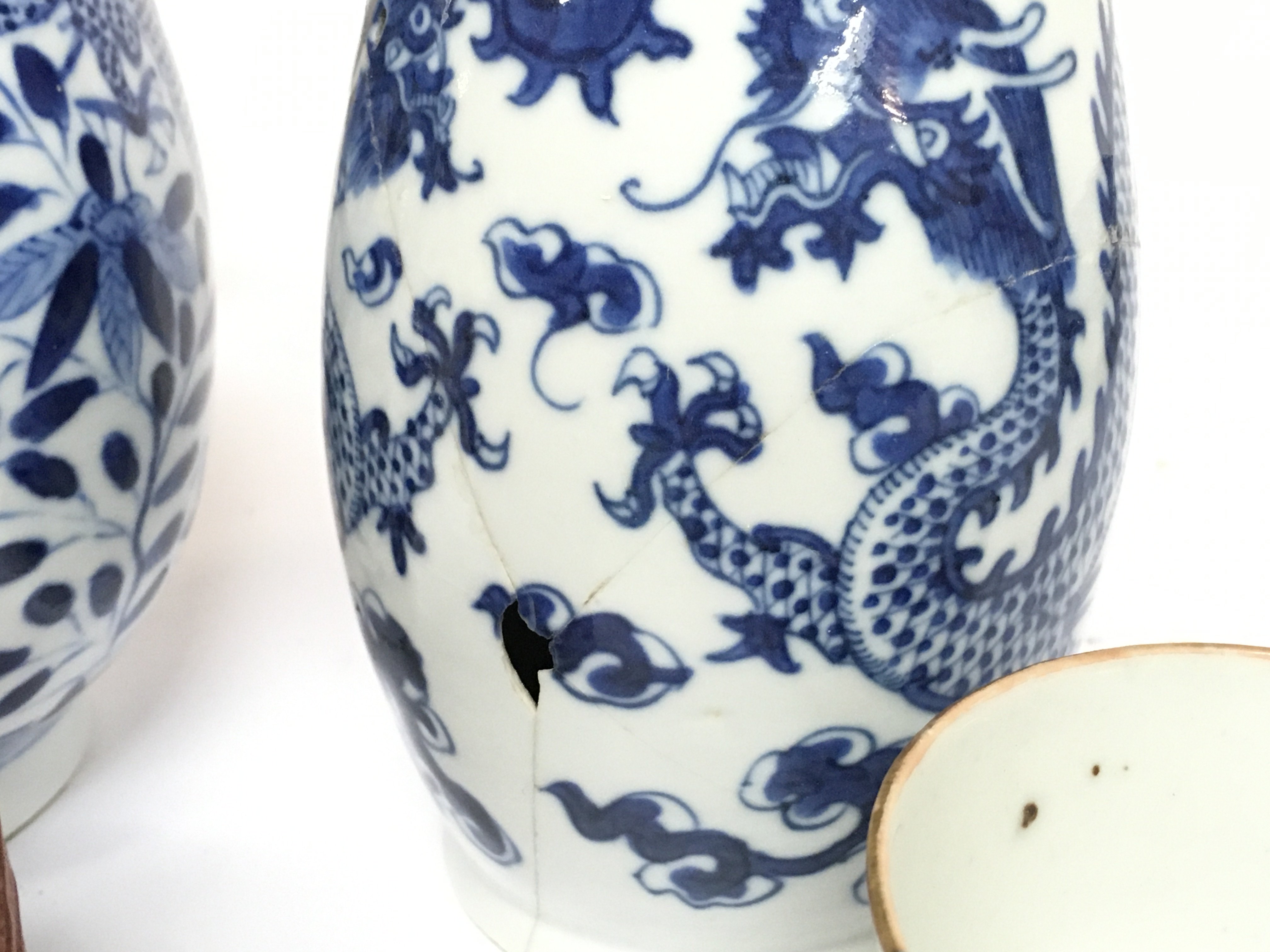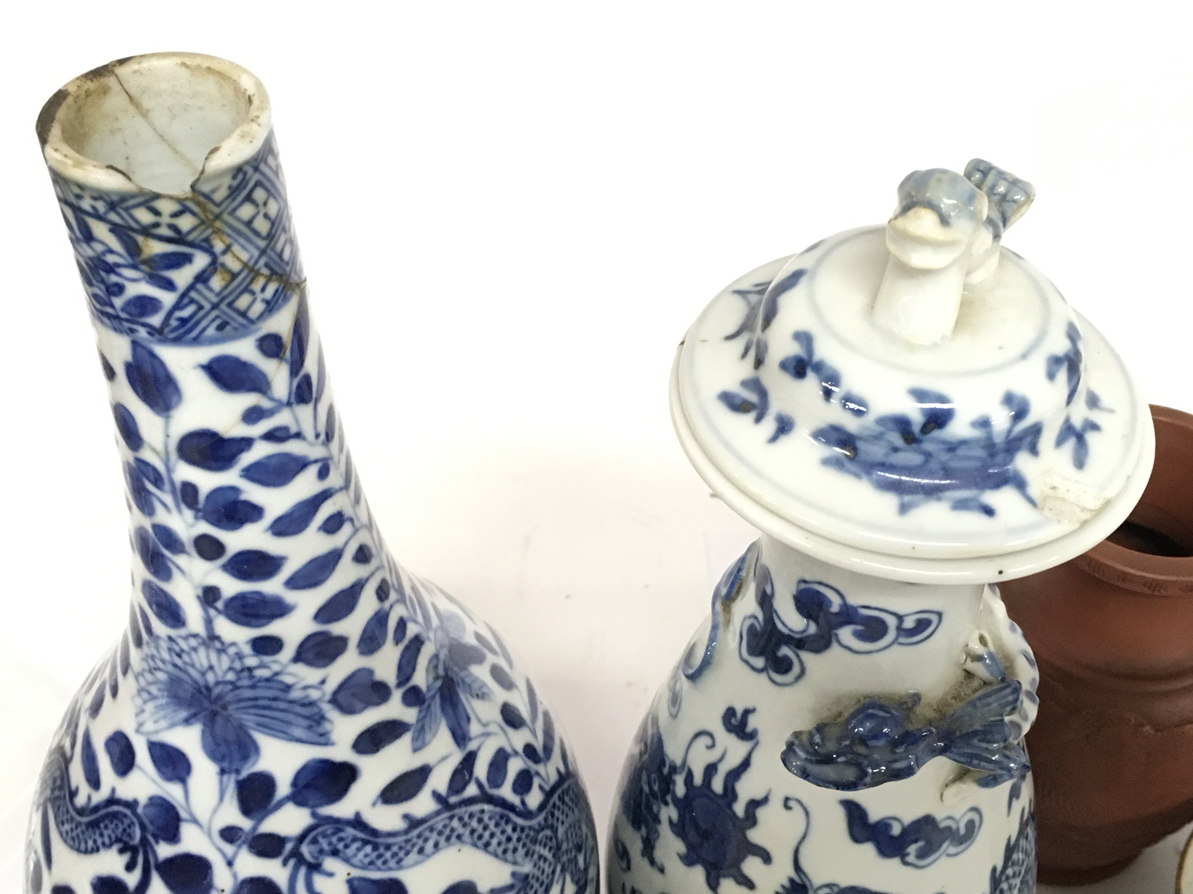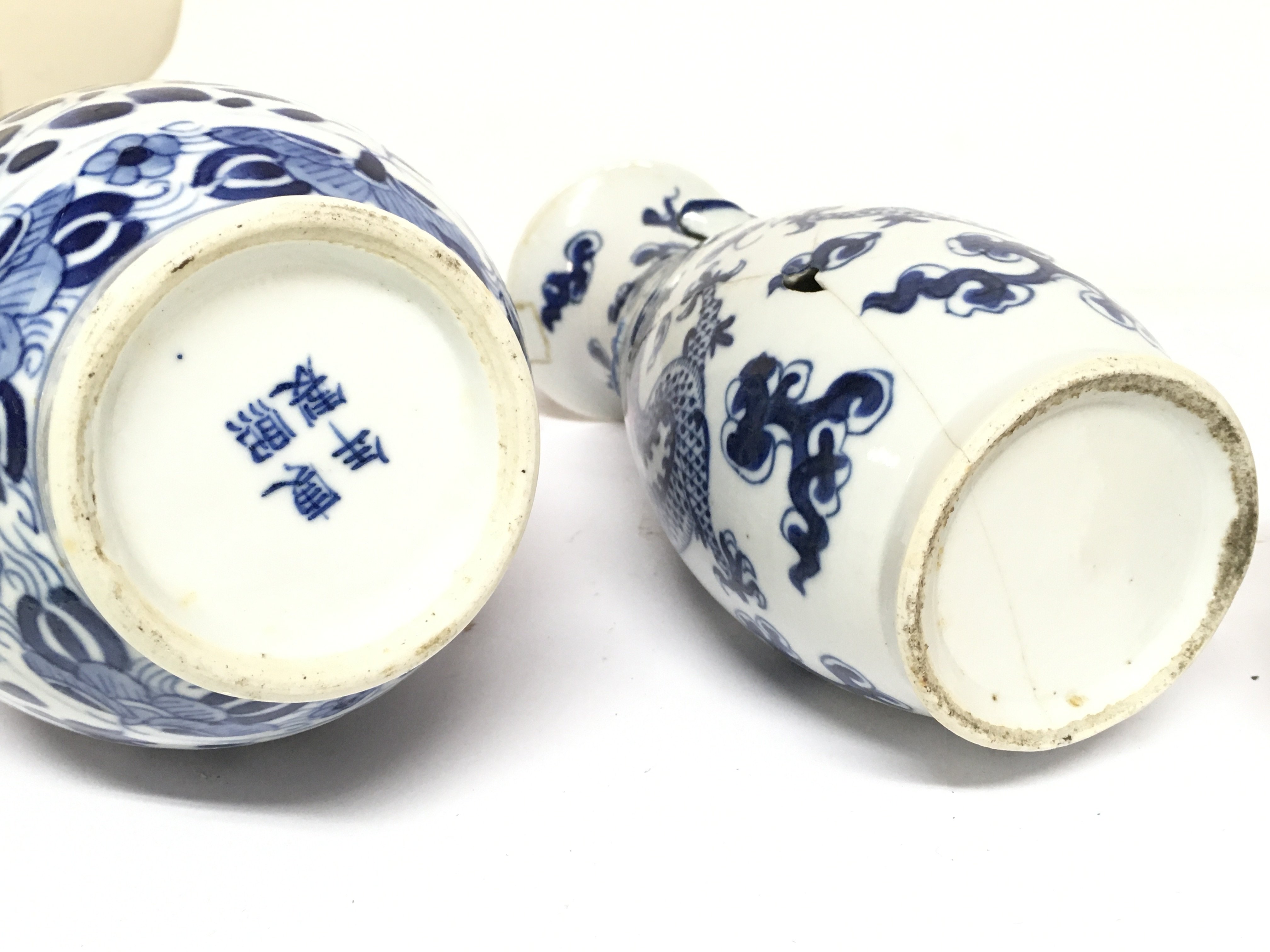 A Collection of Chinese ceramics including blue and white plates and vases with dragon decoration. Damage and restoration seen.