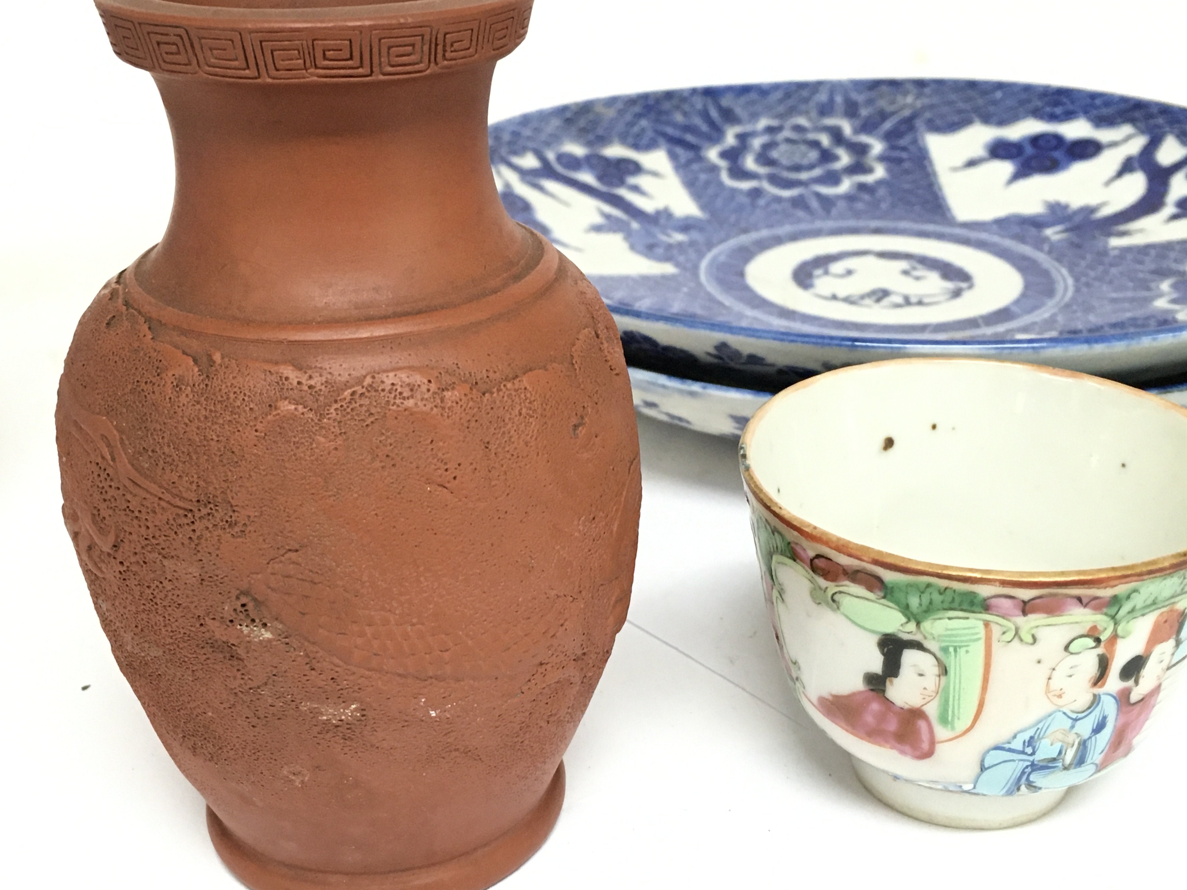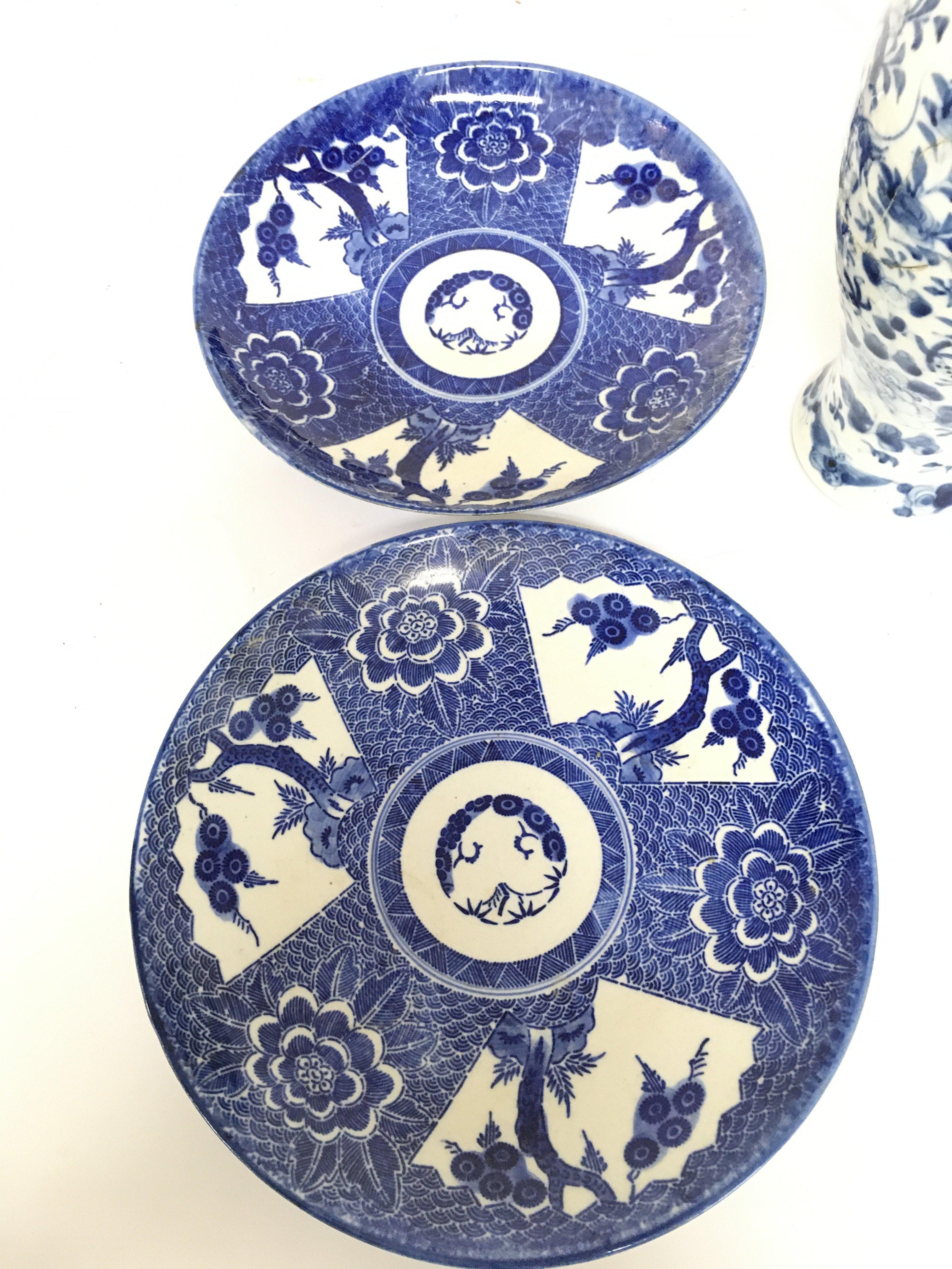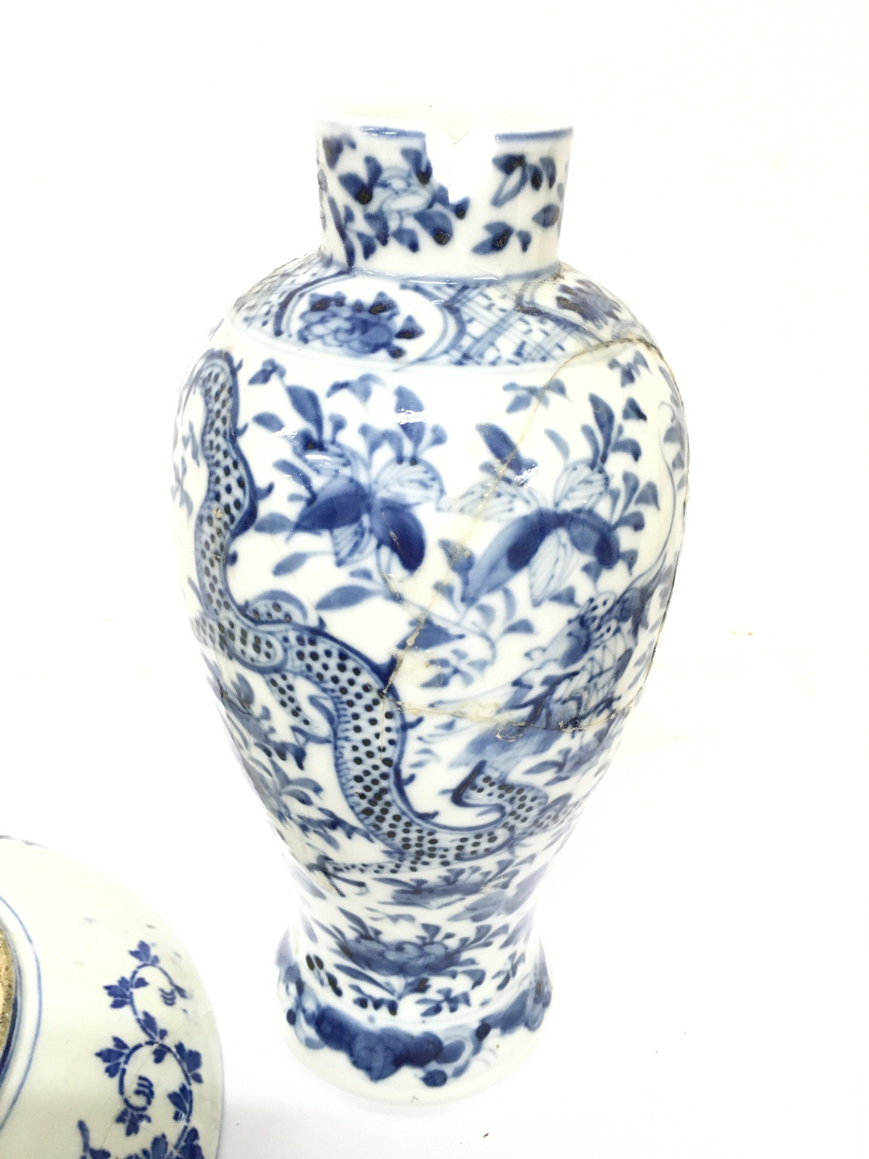 A Collection of Chinese ceramics including blue and white plates and vases with dragon decoration. Damage and restoration seen.