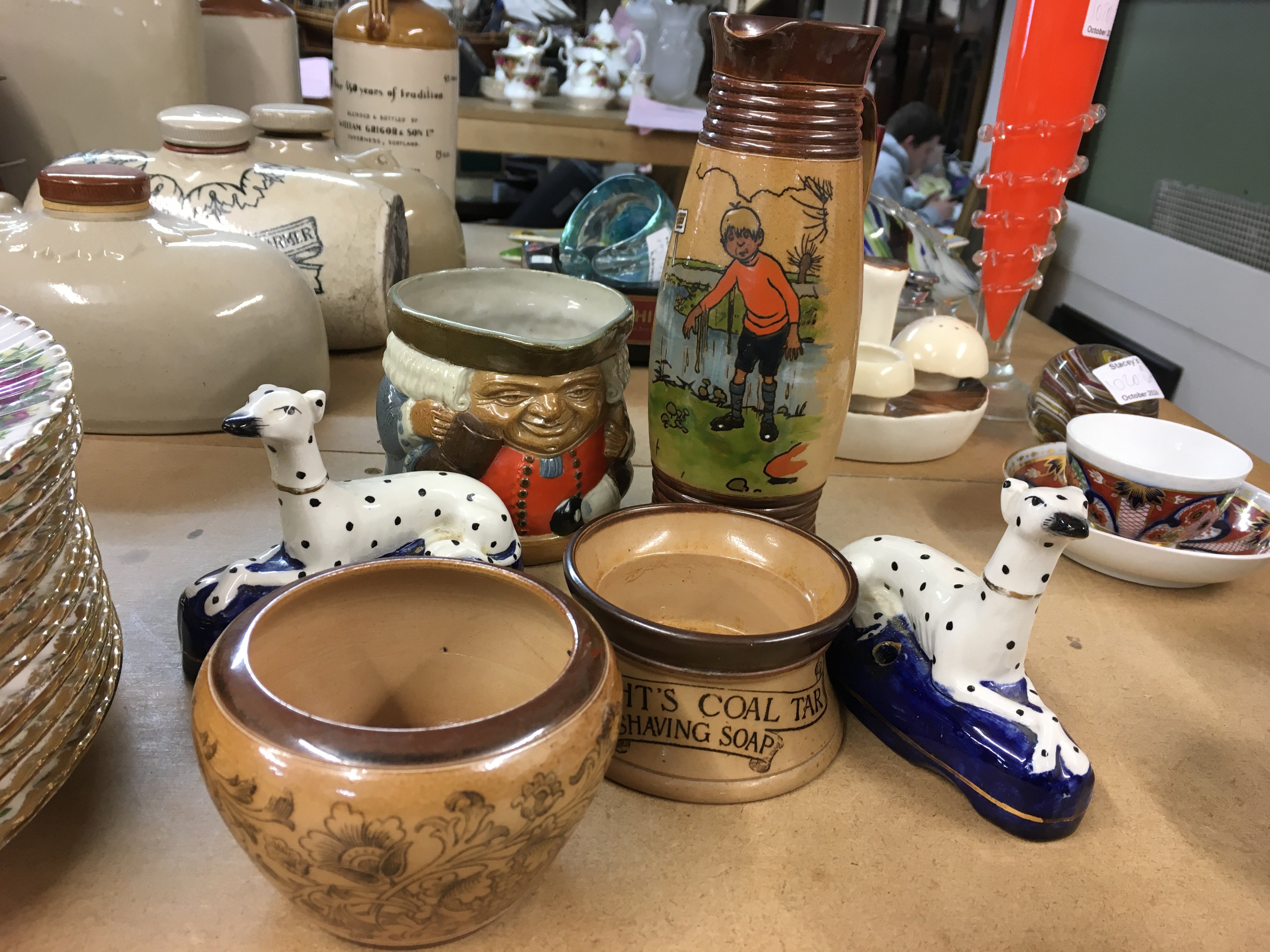 A collection of Doulton Stoneware including Toby Jug, shaving bowl, one other bowl and jug and a pair of Staffordshire dogs