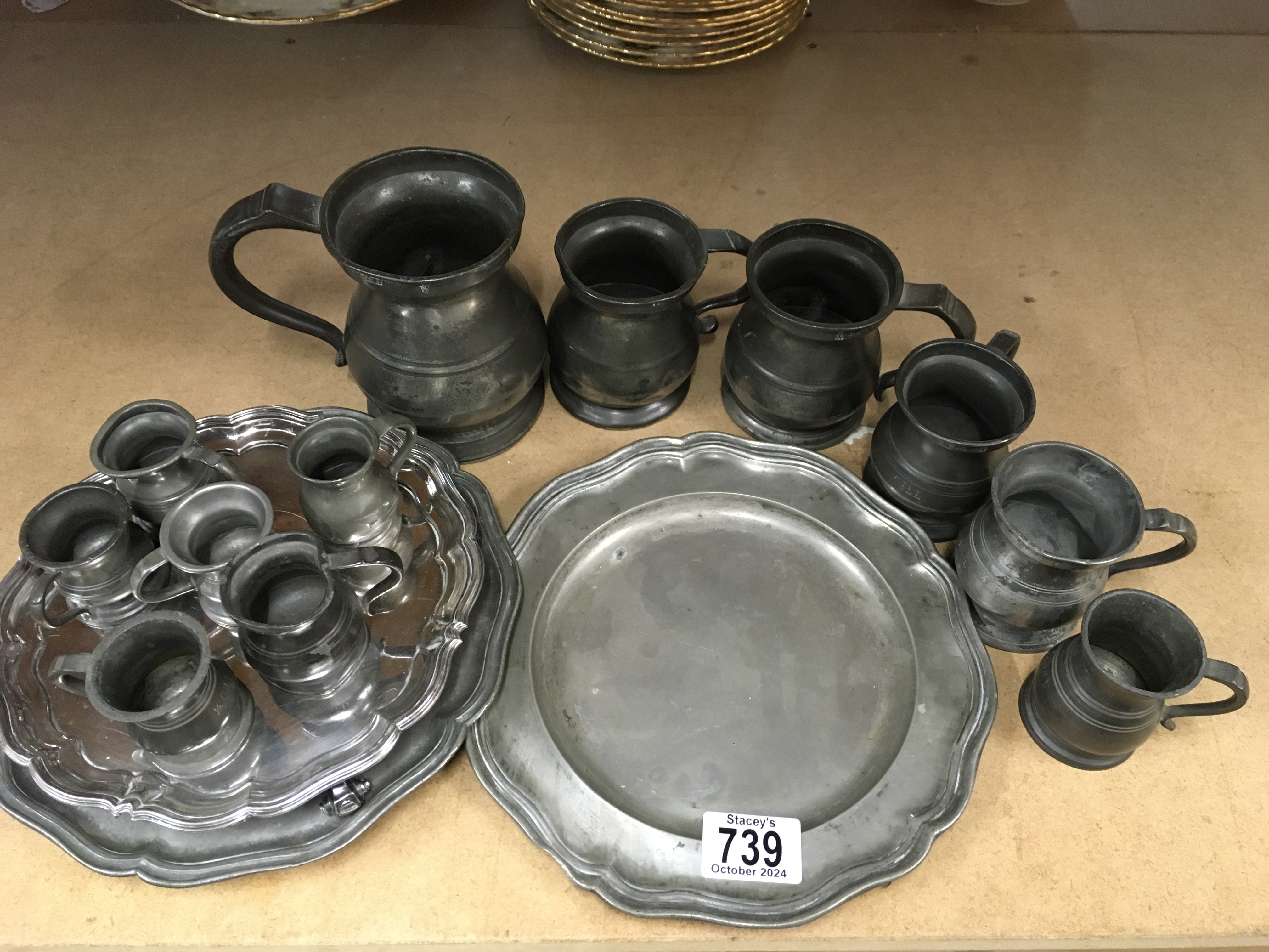 A collection of pewter tankards, two pewter trays and a silver plated dish