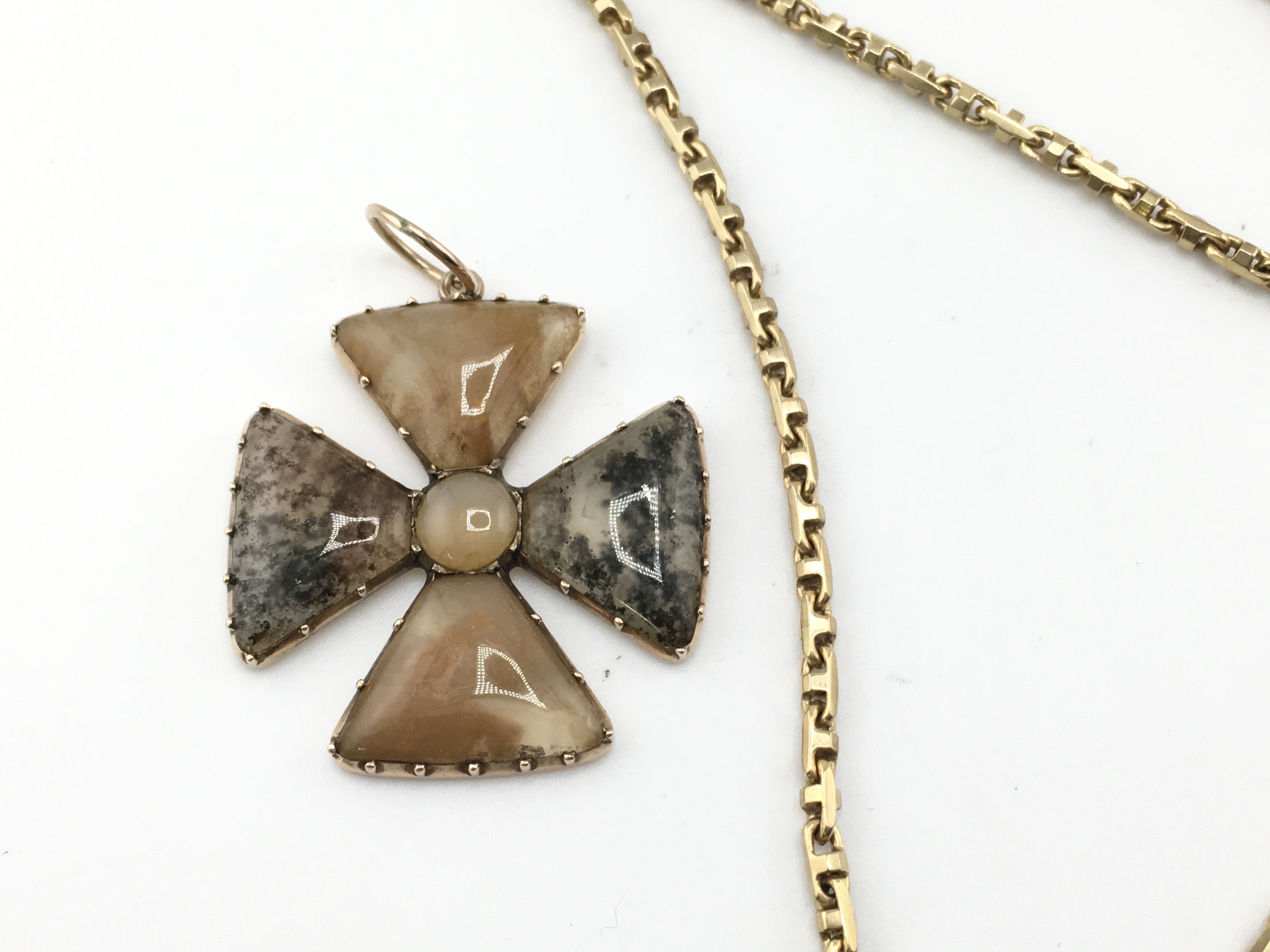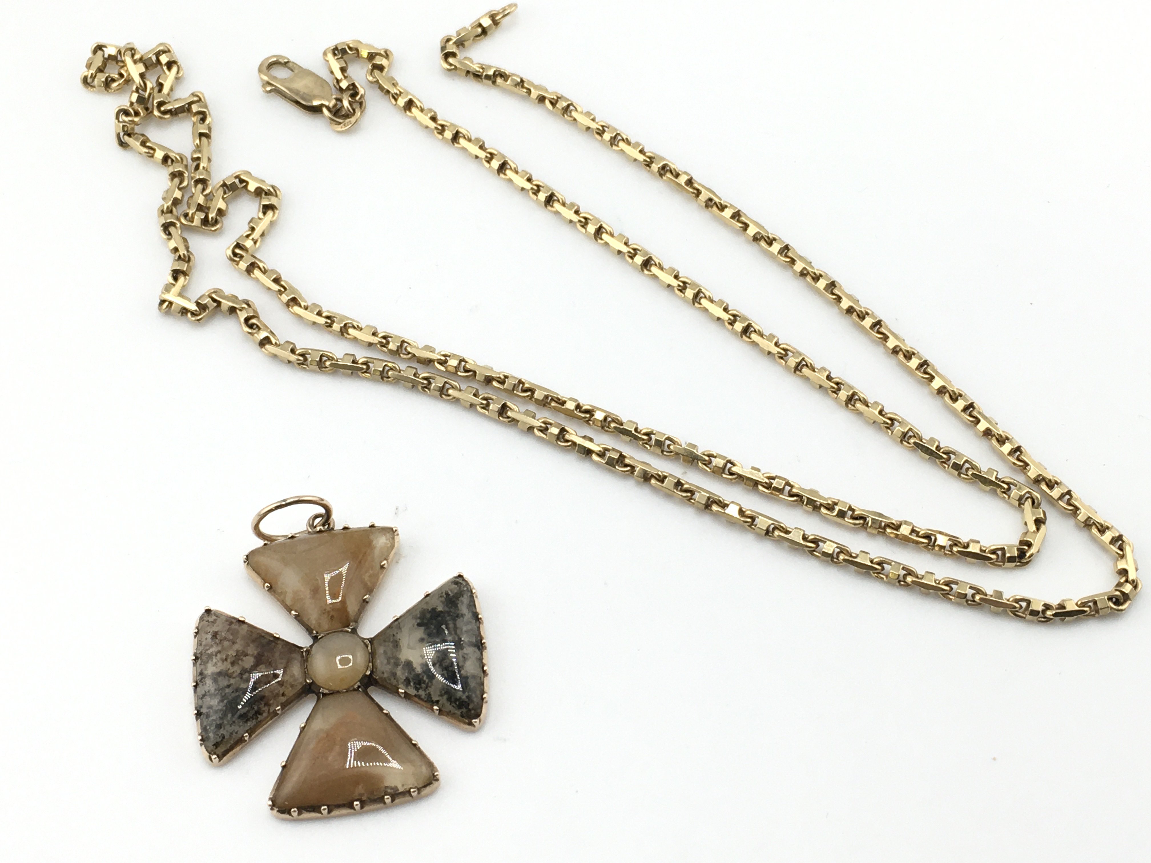 A 9ct gold chain 24.77g & 68cm and a stone pendant. Postage A