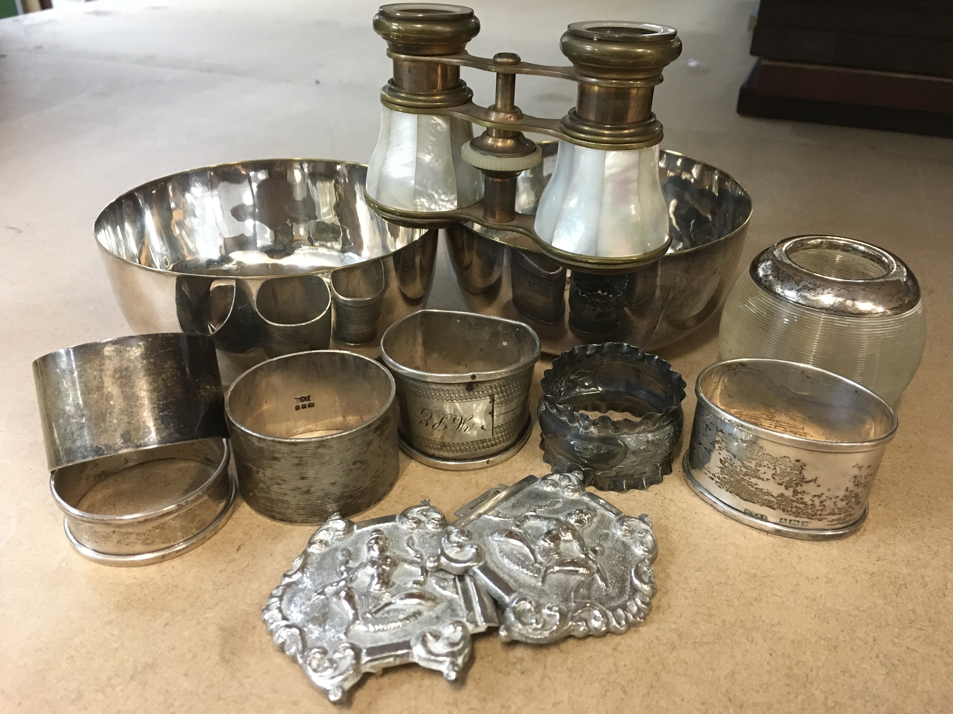 A collection of six napkin rings including silver together with an Indian white metal buckle, a pair of opera glasses, two silver white metal bowls and a glass match holder with silver rim