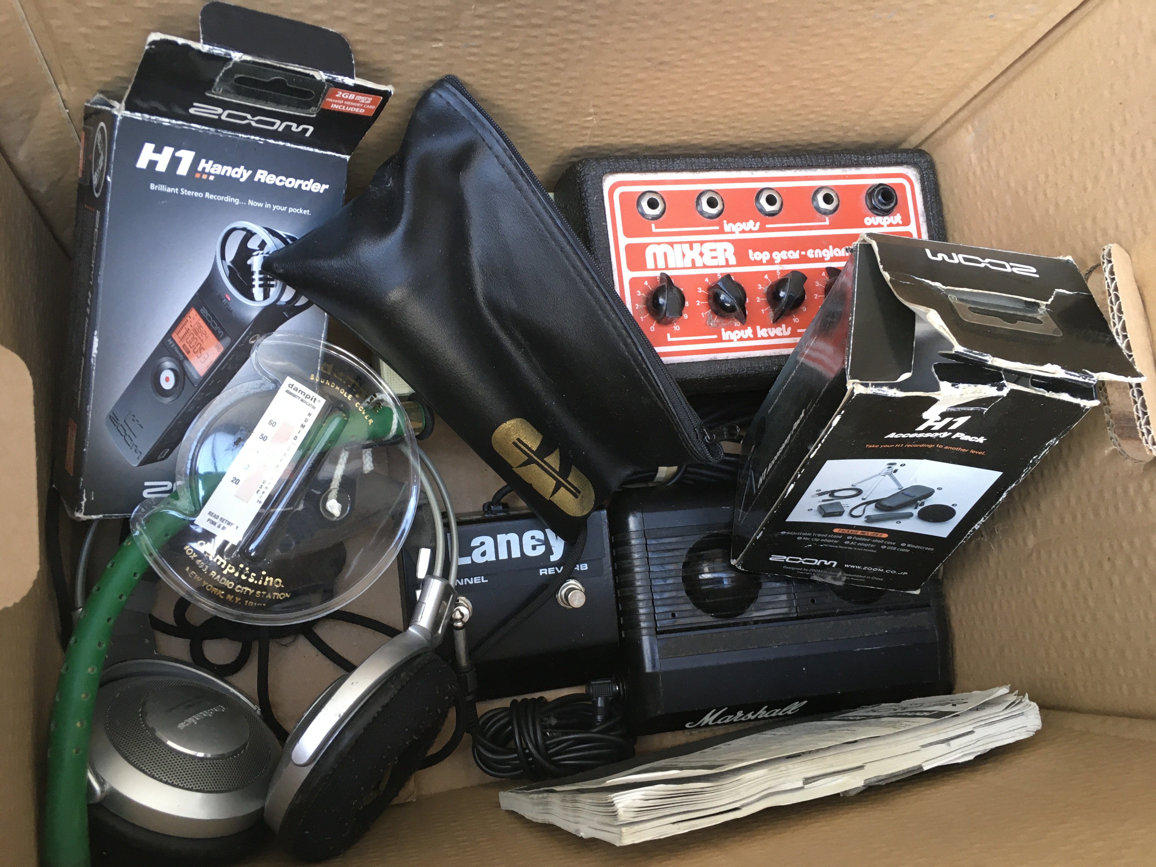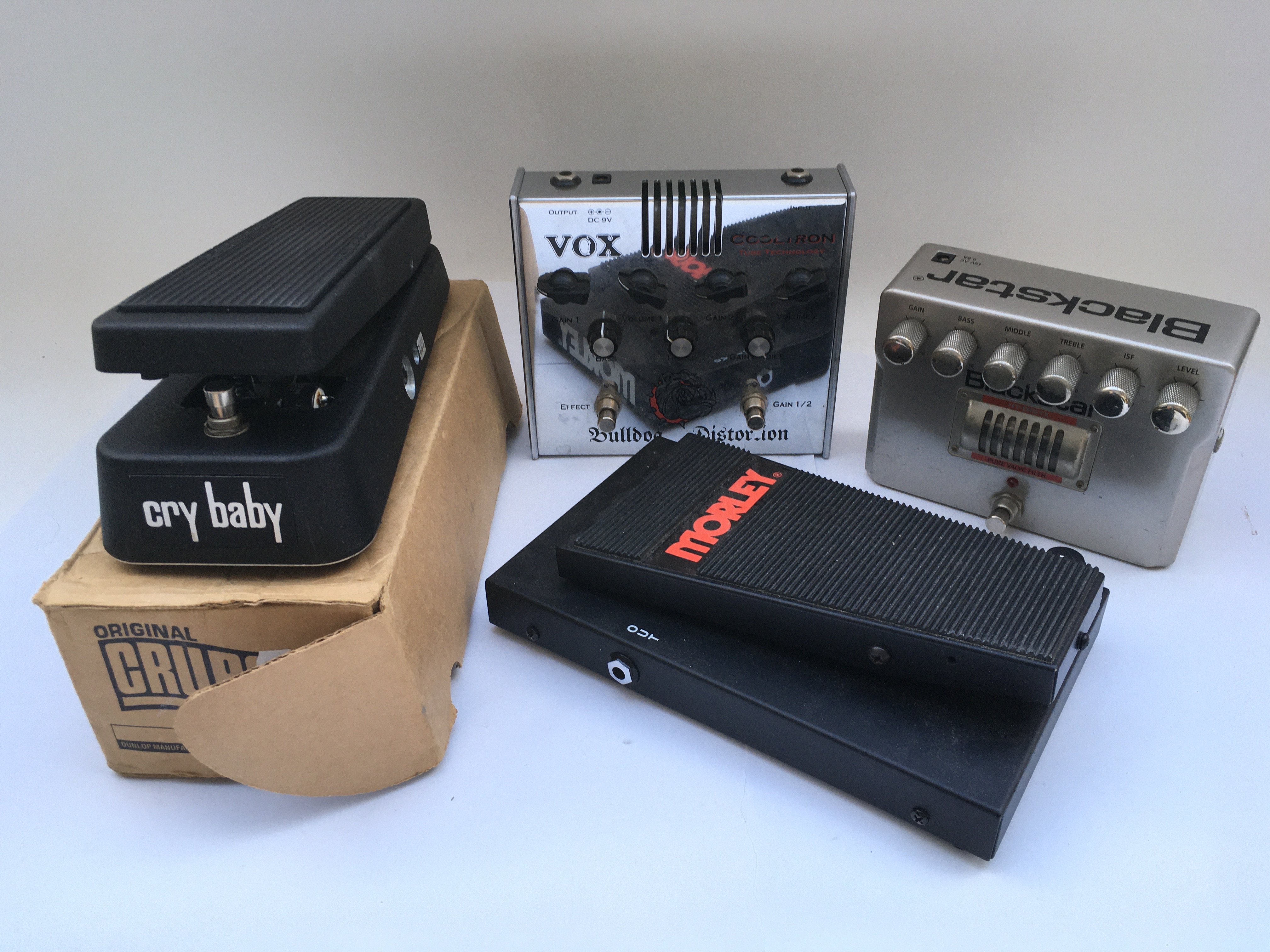 A box of guitar pedals and accessories including a Vox Bulldog distortion, a Blackstar HT-DISTX pedal, a boxed Jim Dunlop Cry Baby wah pedal and others.