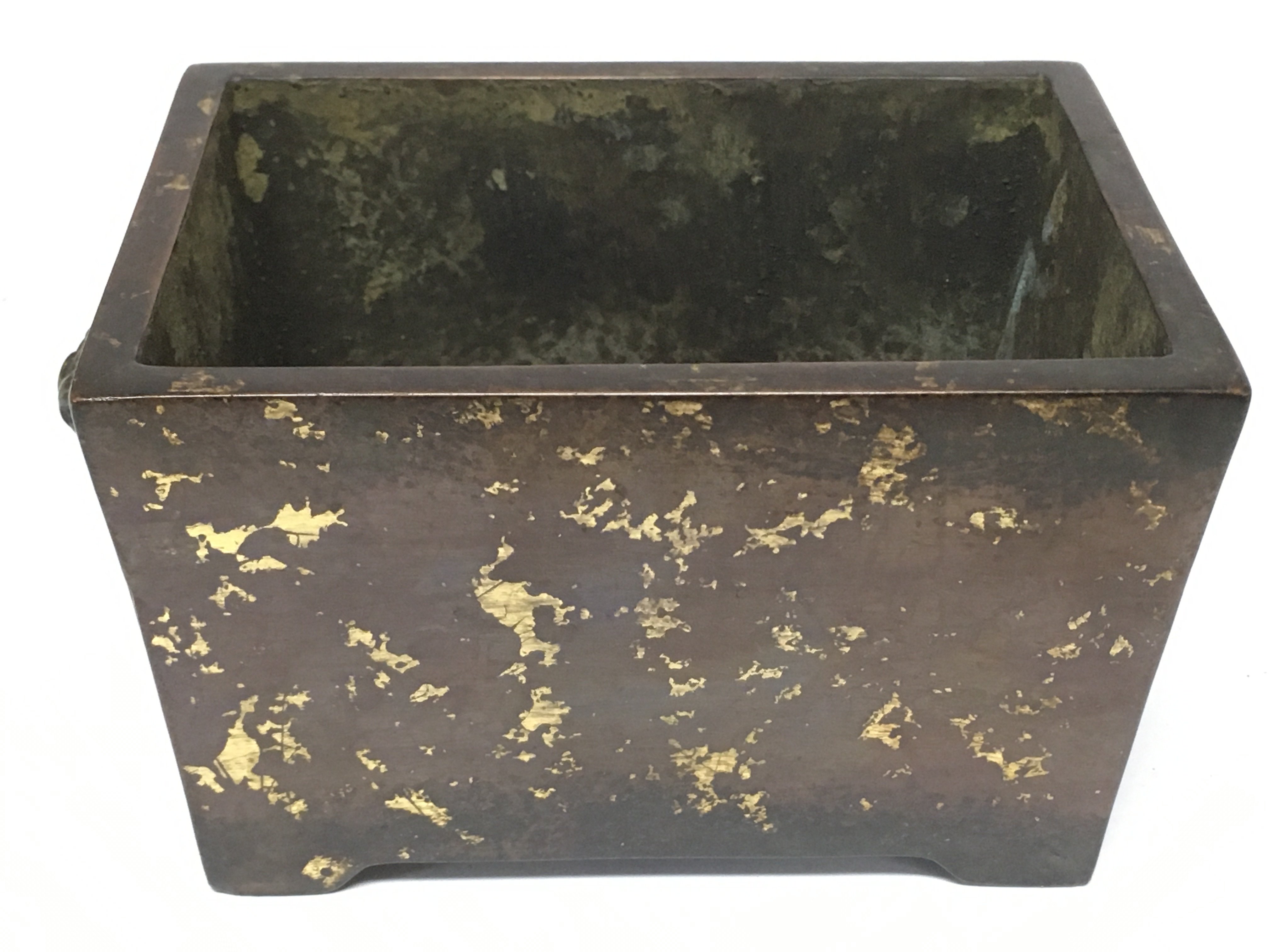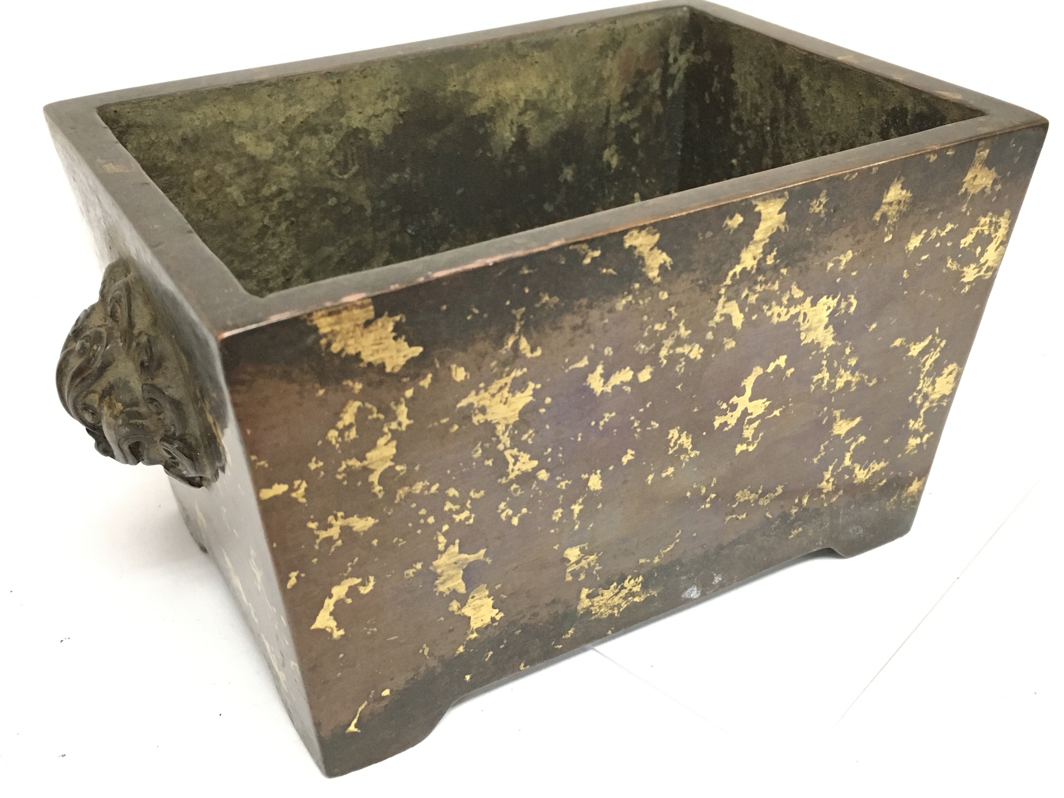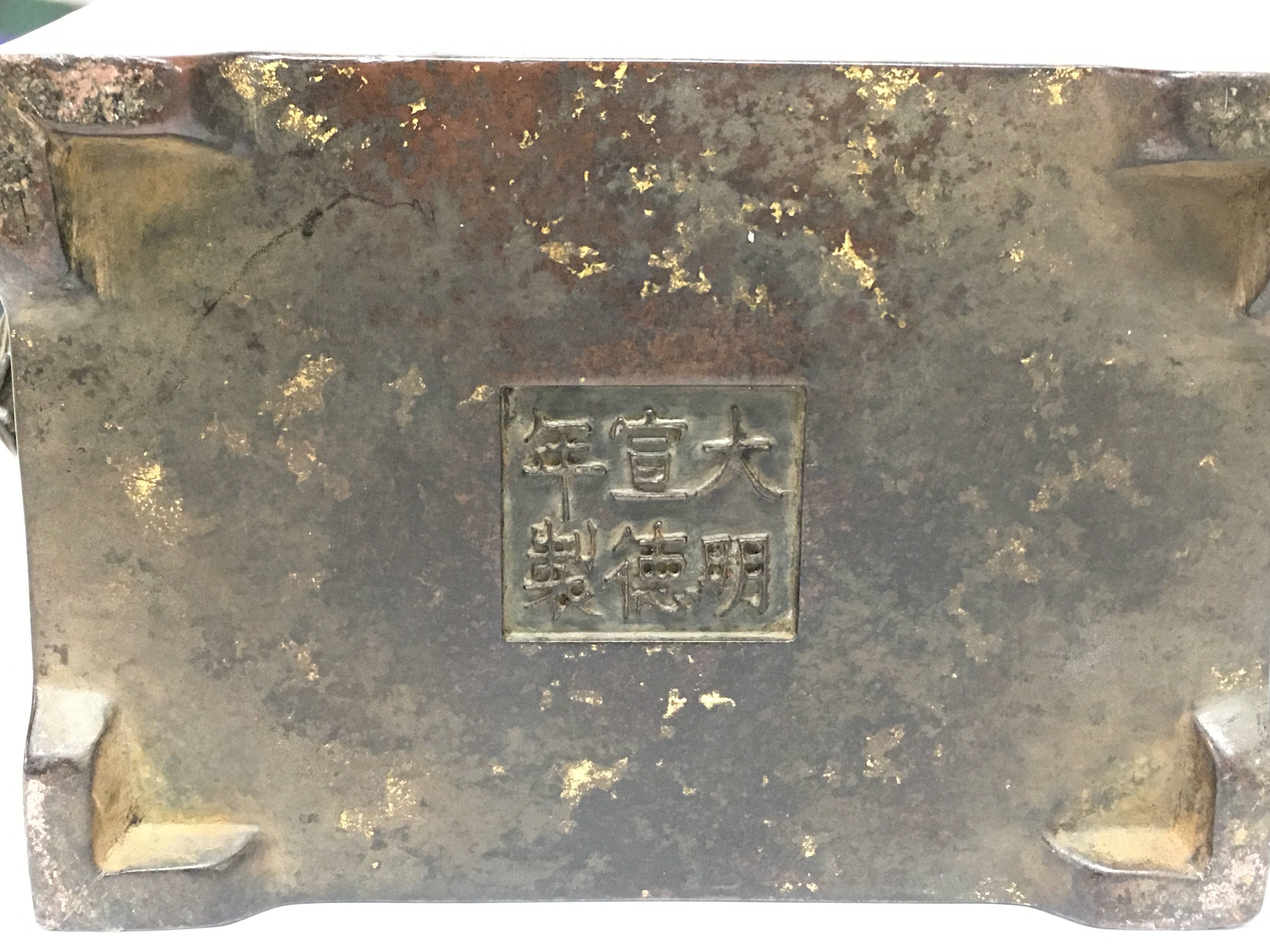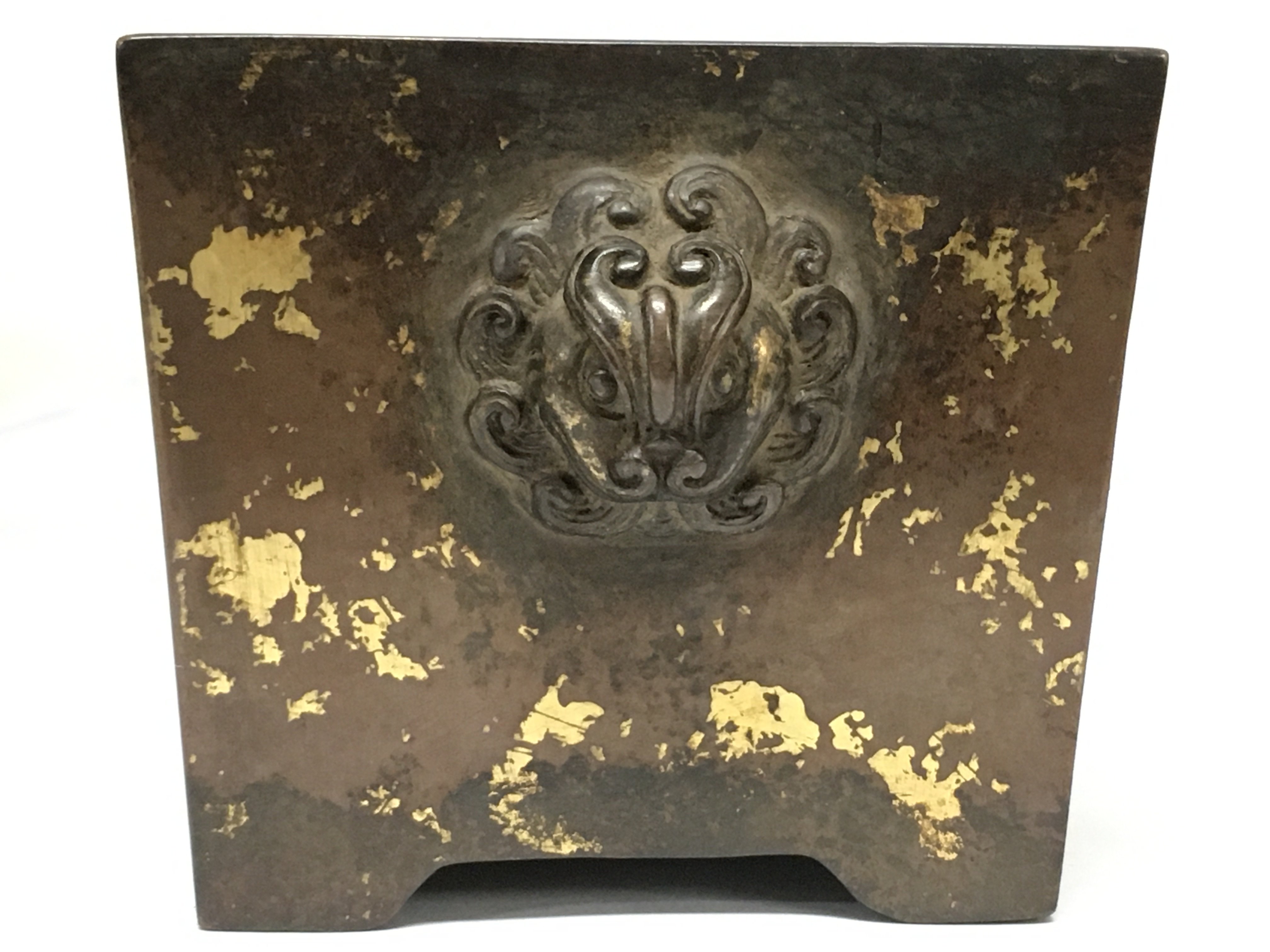 A Chinese gilt splashed bronze rectangular incense burner with six character mark to the base ,dimensions 9x12x8cm. Postage category B