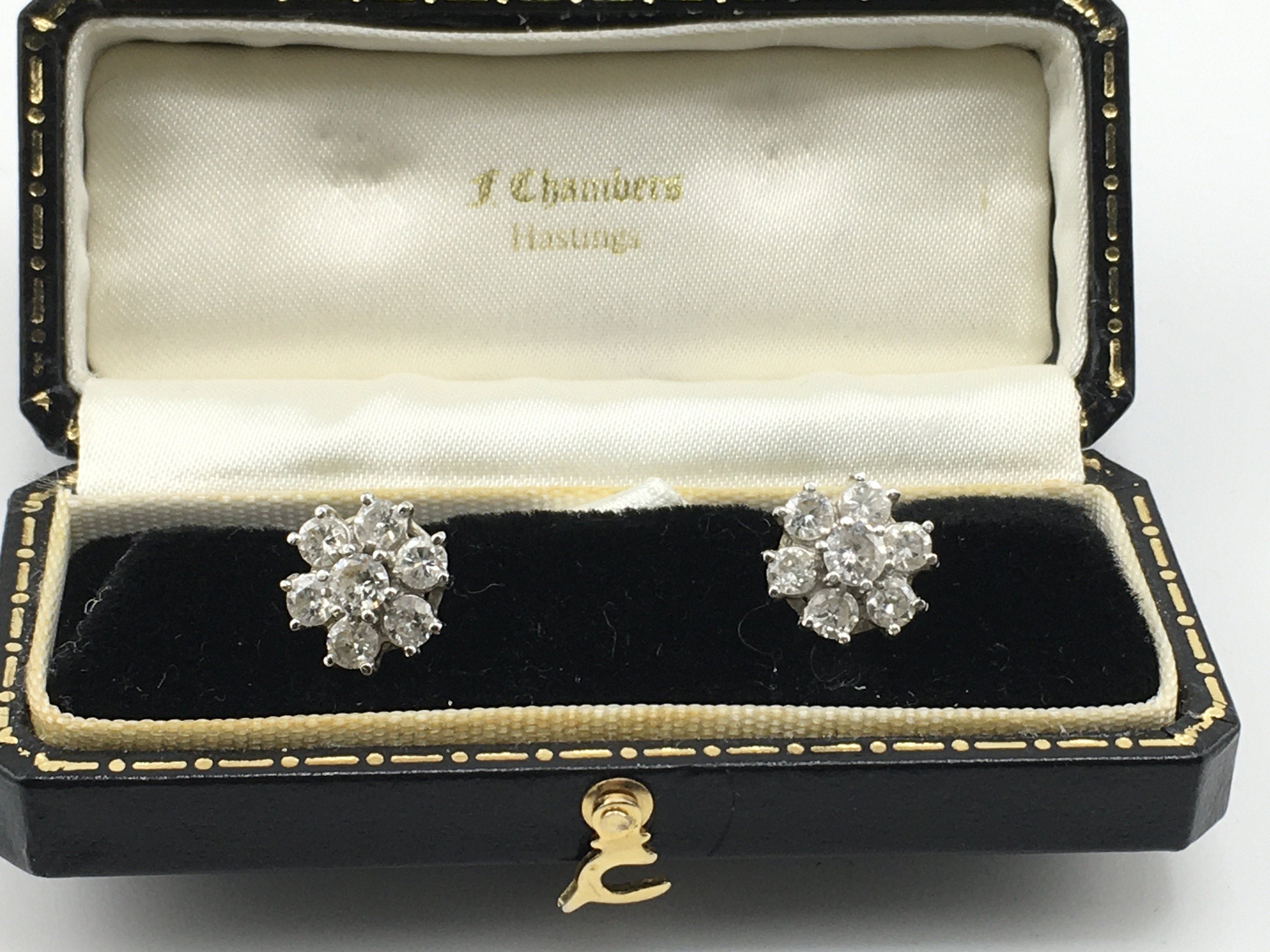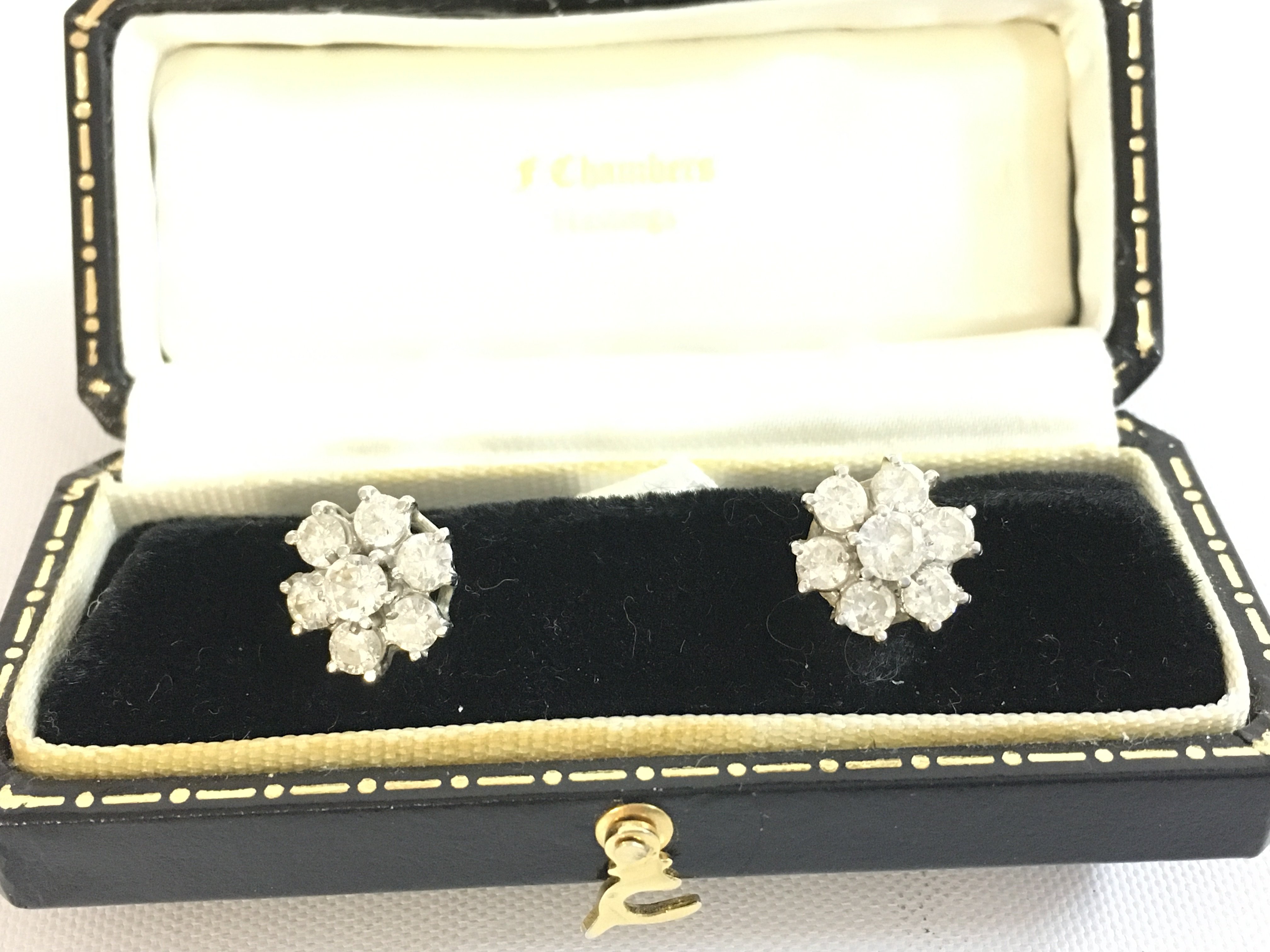 A pair of 18ct white gold cluster earrings. Approximately 11mm diameter. Postage B