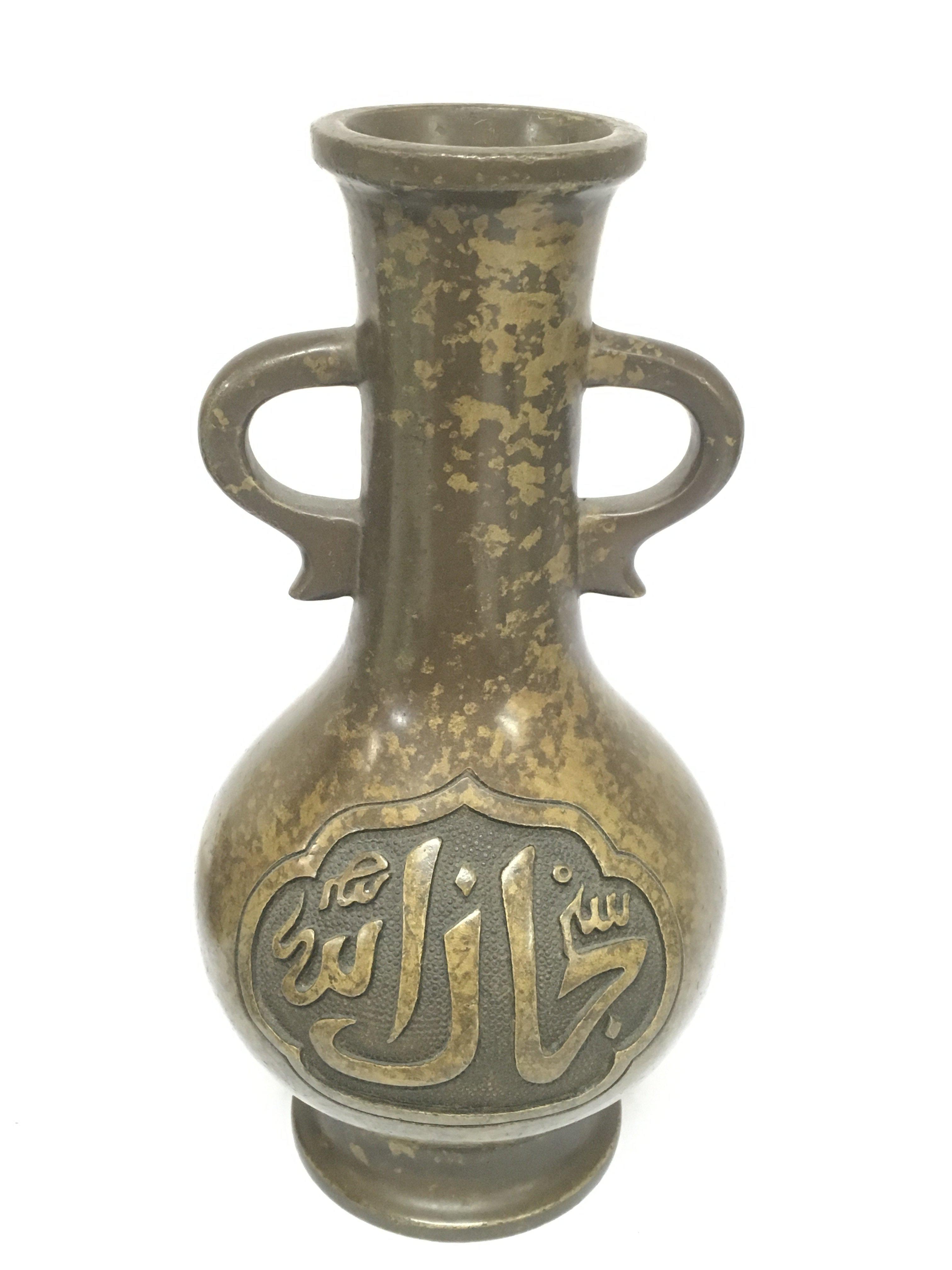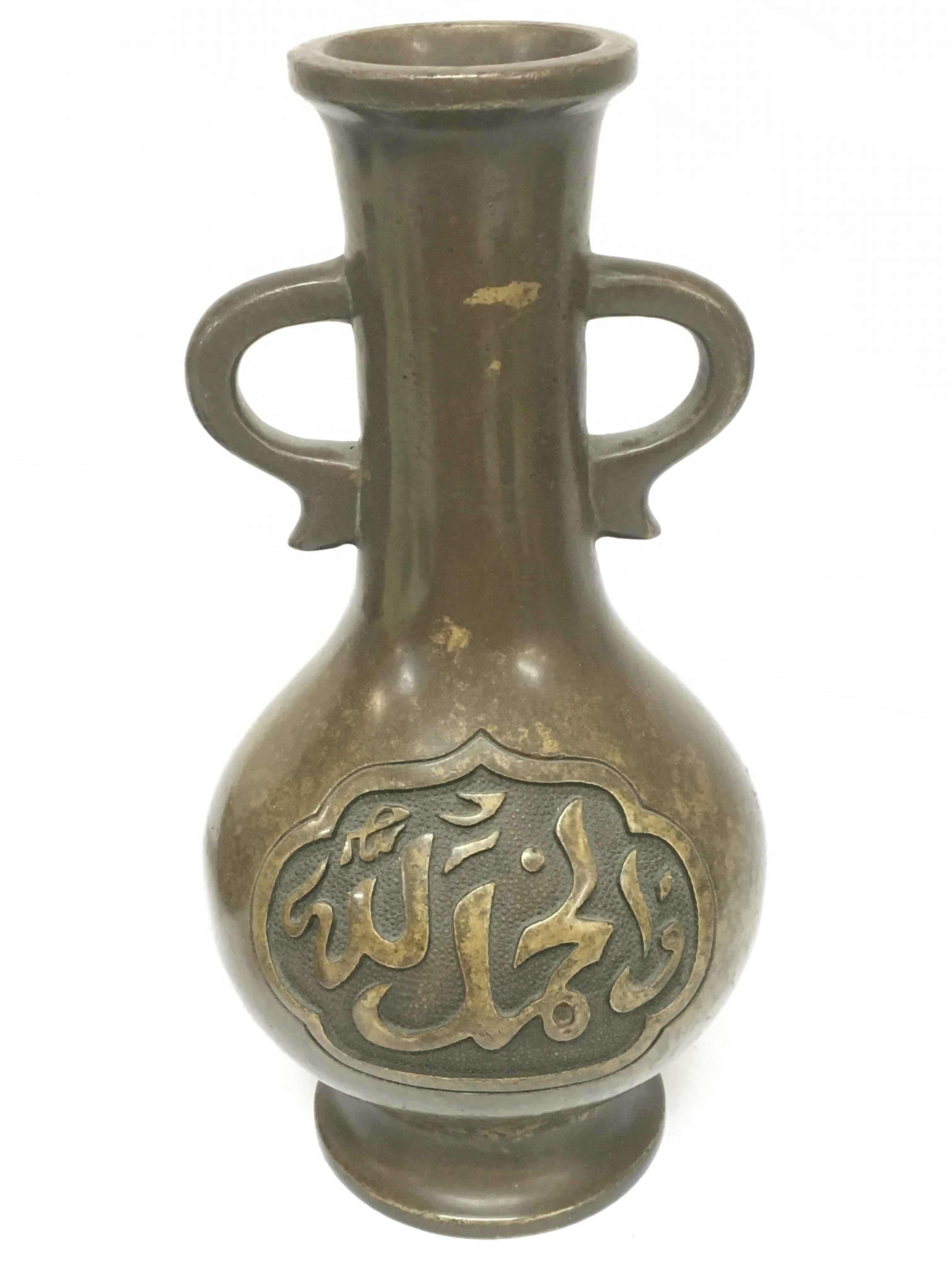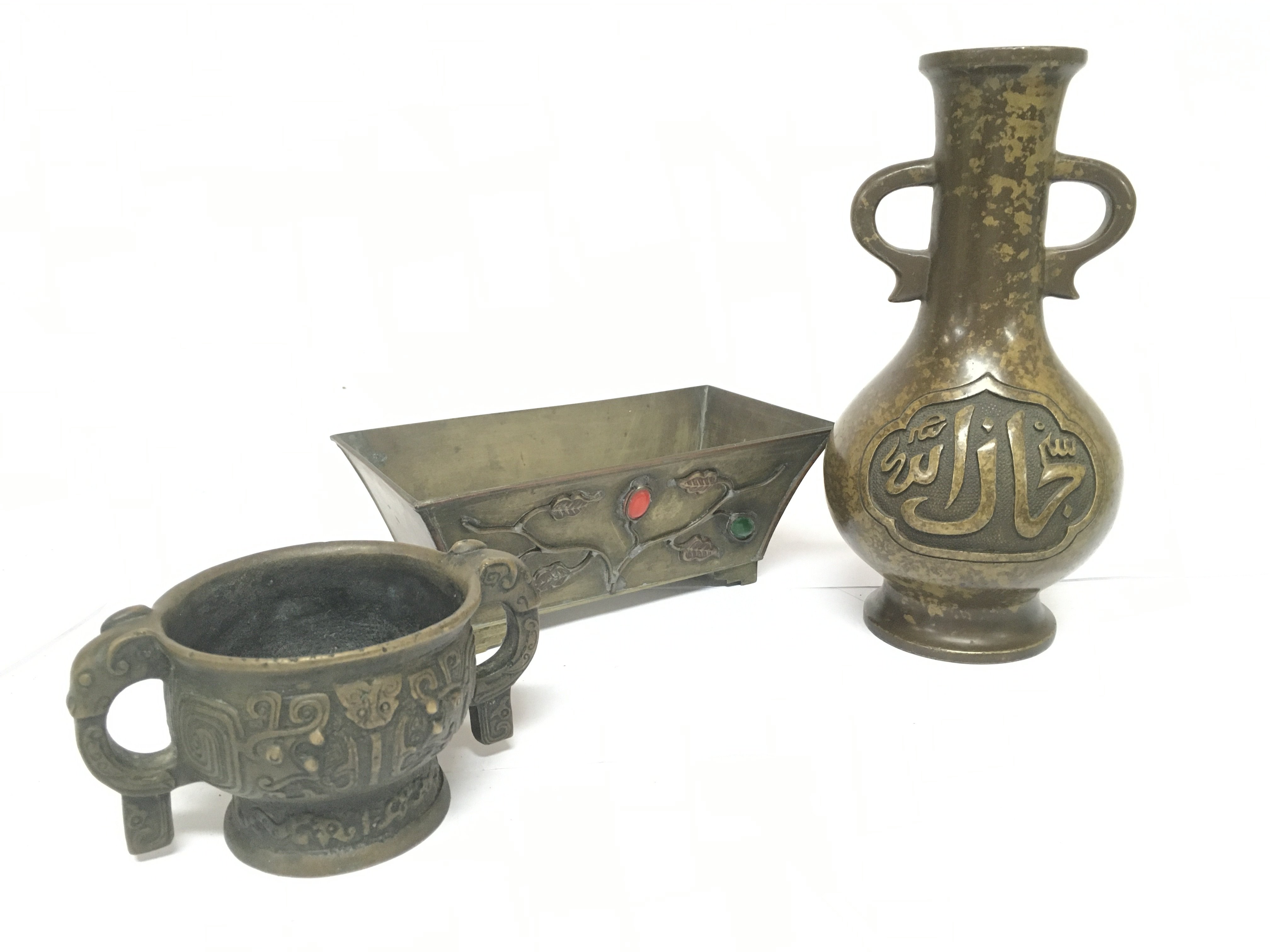 A Collection of Chinese bronze including an altar vase with Islamic inscription (17.5cm tall), an incense burner and a small Cachepot marked China on base. Postage category B