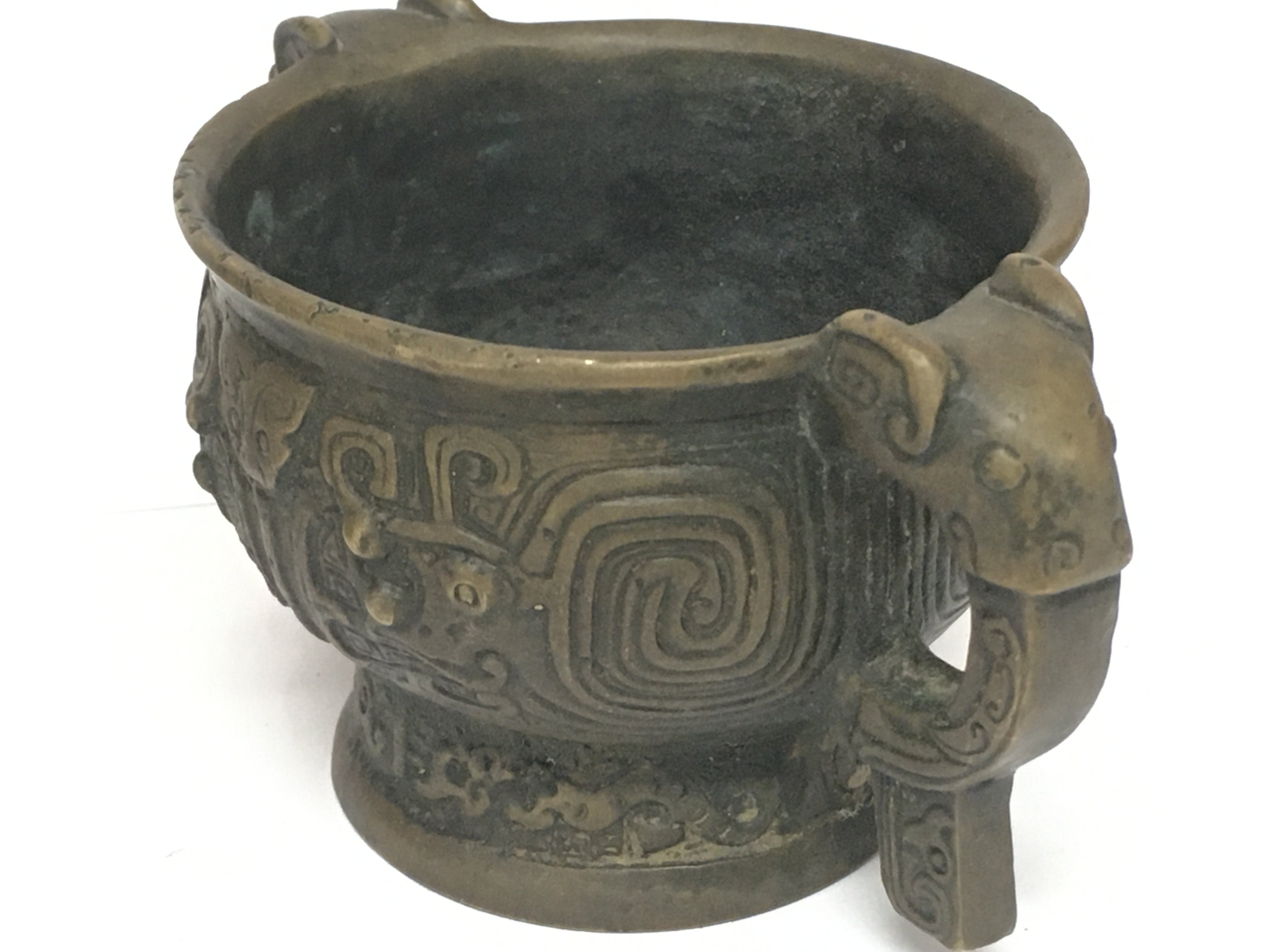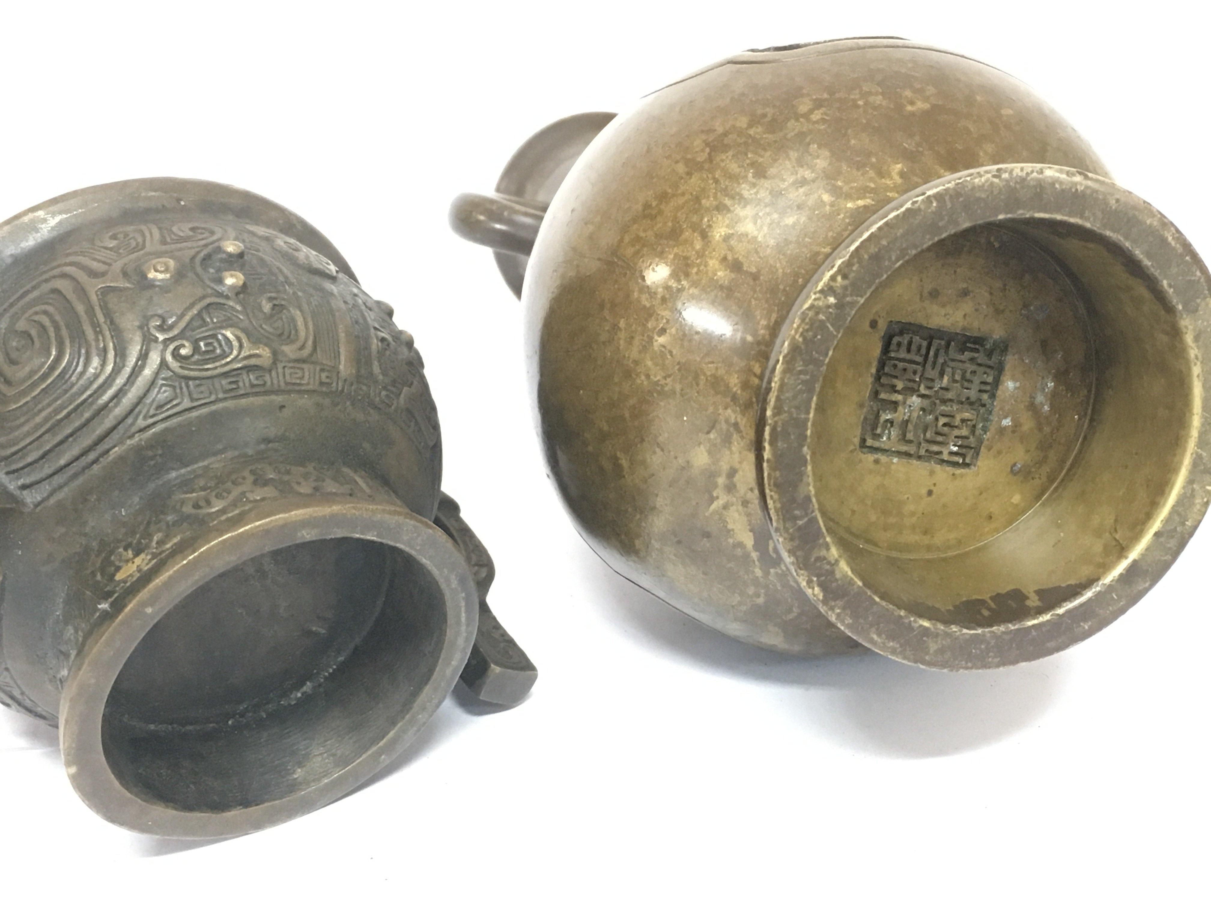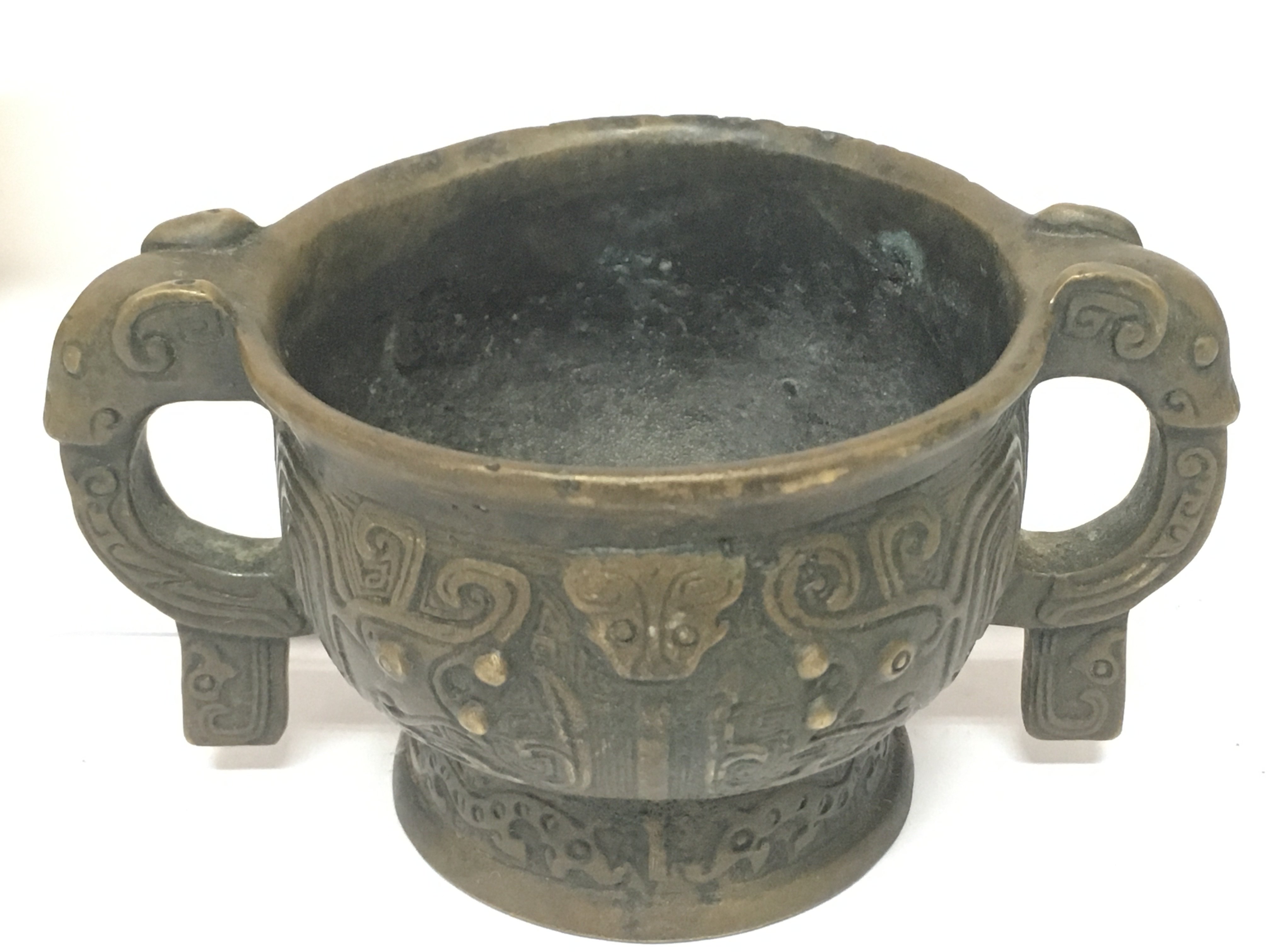 A Collection of Chinese bronze including an altar vase with Islamic inscription (17.5cm tall), an incense burner and a small Cachepot marked China on base. Postage category B