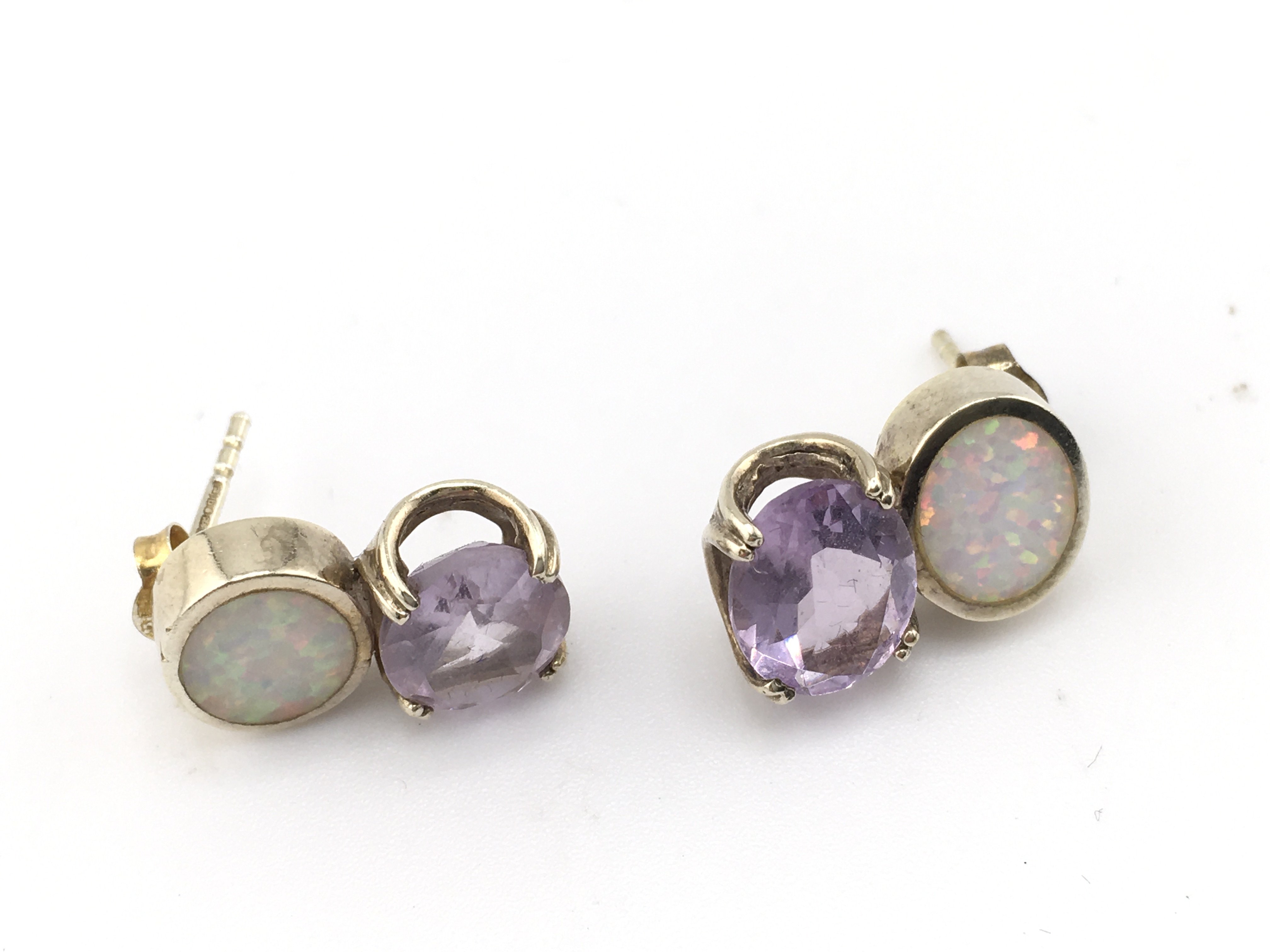 A pair of gold pearl set earrings and a pair of silver earrings set with opal and purple stone. Postage A