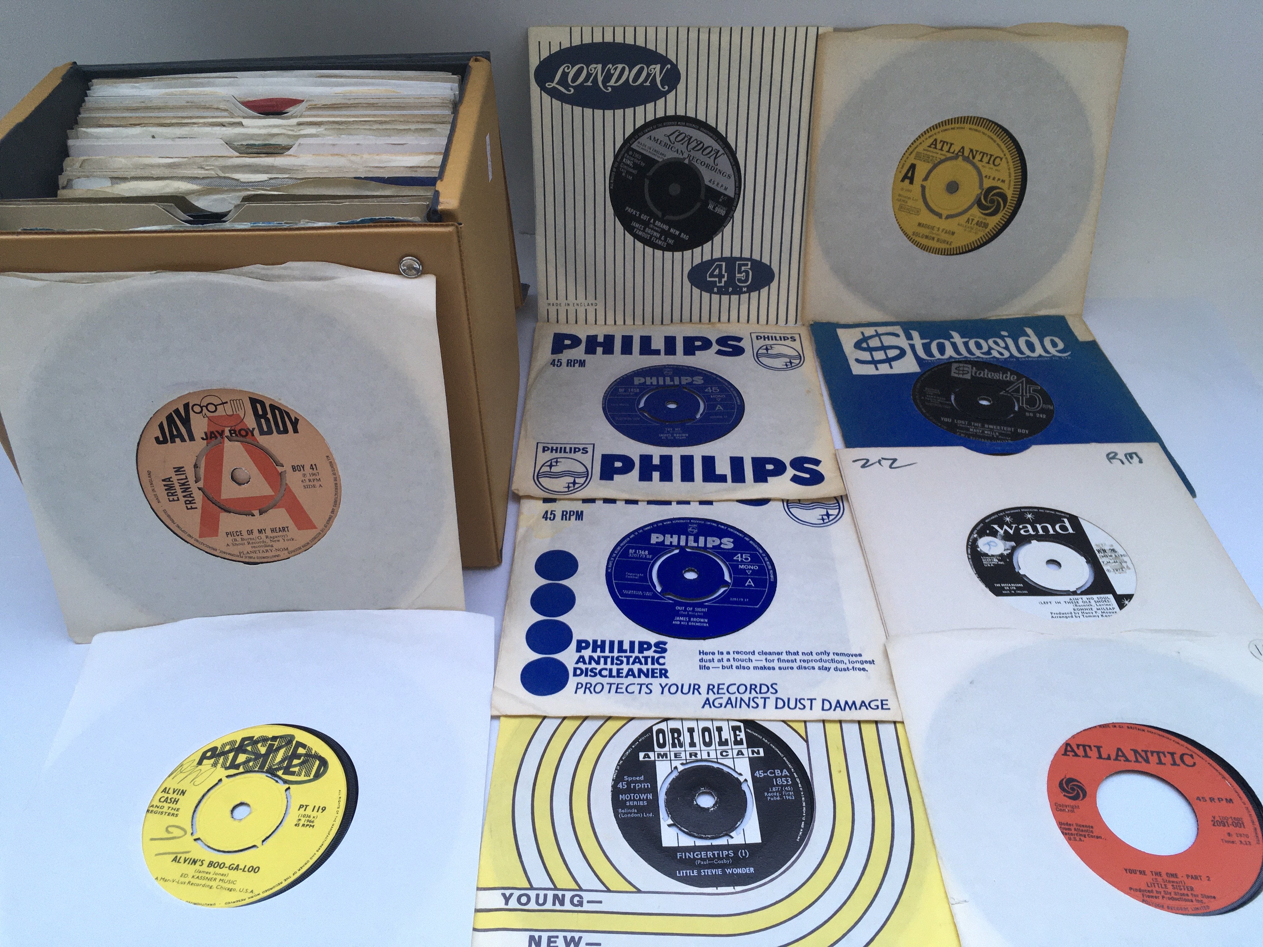 A record case of over 50 soul and Northern soul UK and US 7" singles by various artists including The Miracles, James Brown, Solomon Burke and others. Includes demonstration discs.