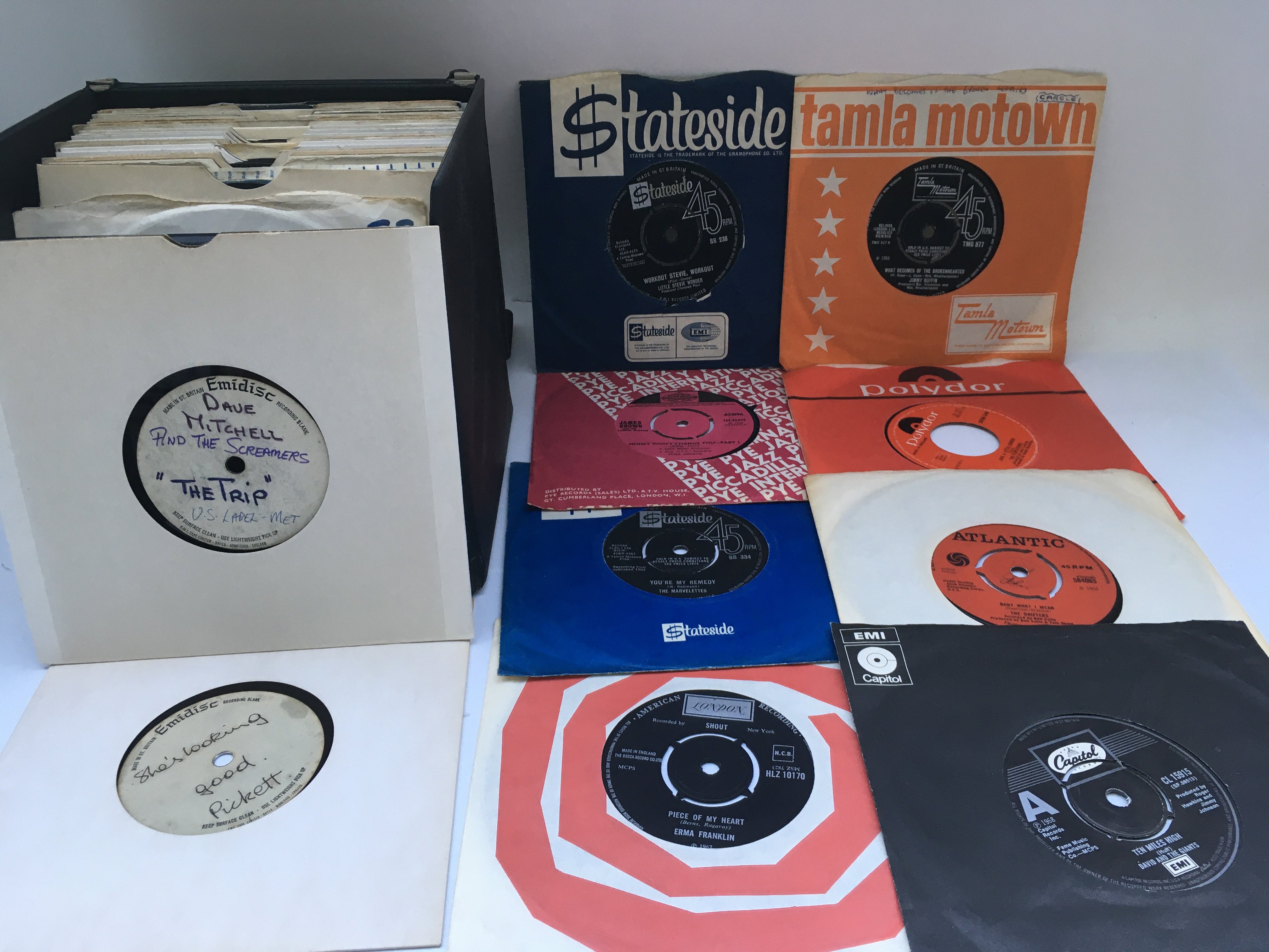 A record case of over 50 soul and Northern soul UK and US 7" singles including The Marvelletes, Dobie Gray, !jimmy Ruffin and others. Includes acetate discs.