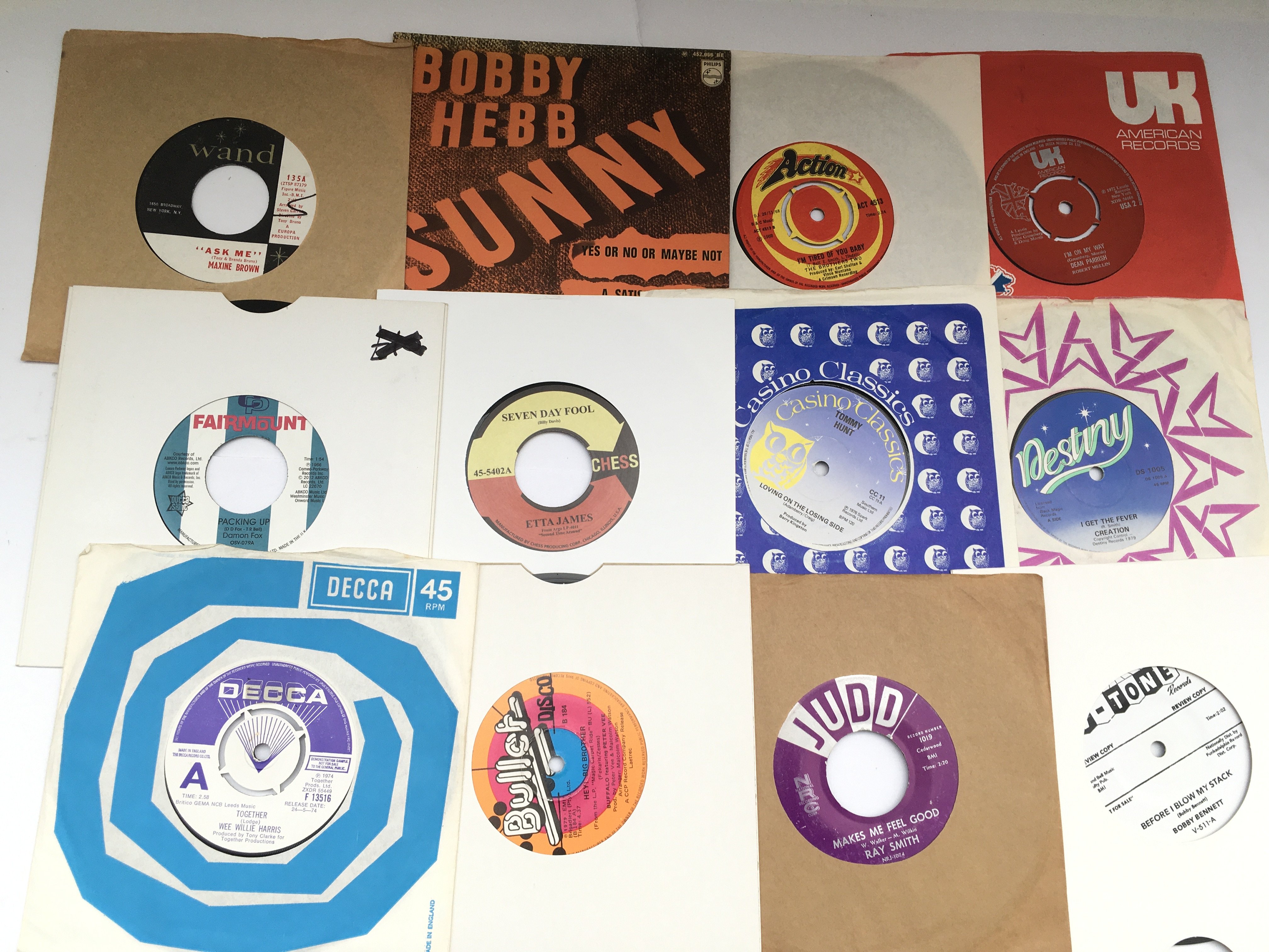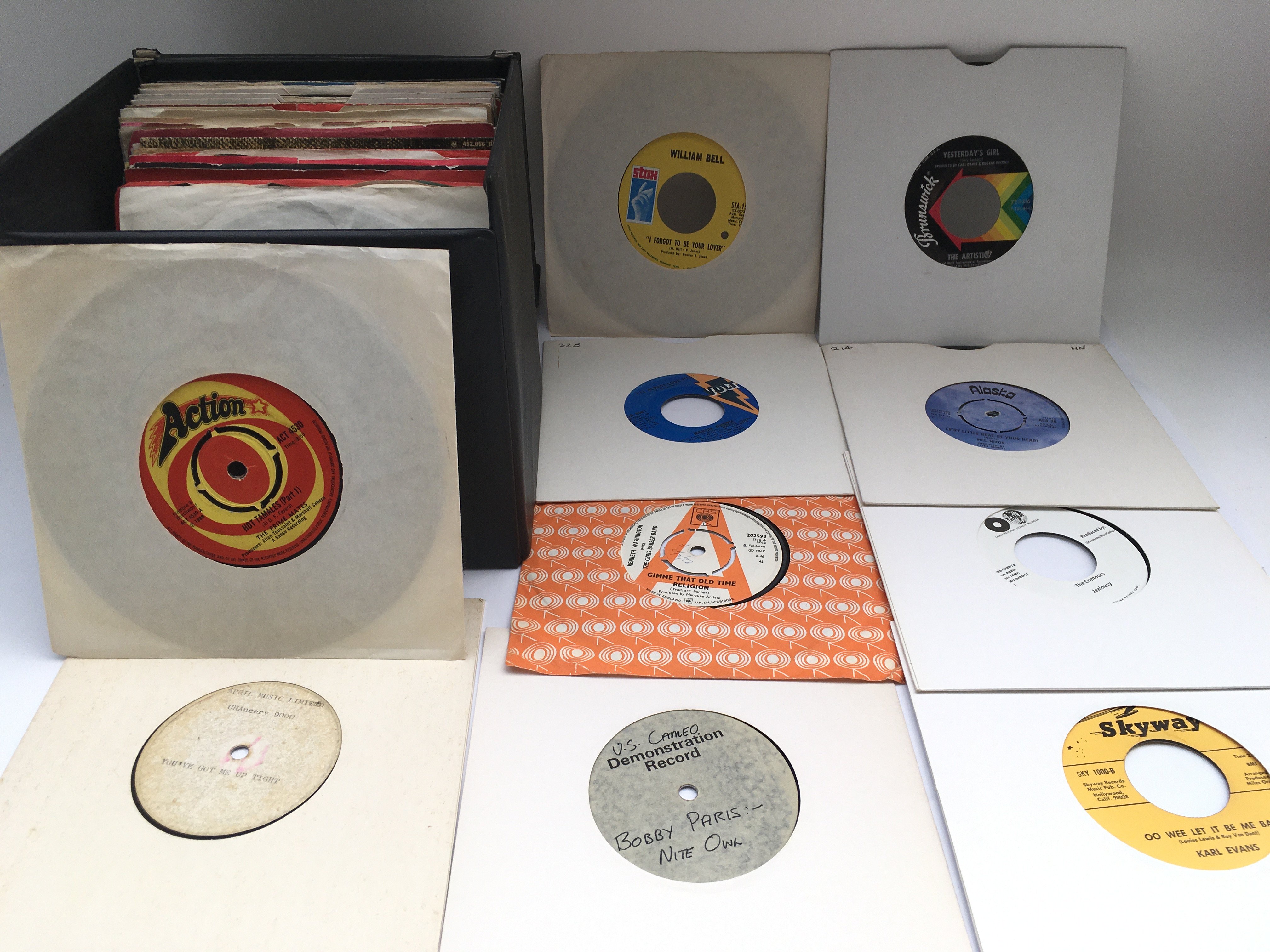 A record case of over 50 soul and a Northern soul UK and US 7" singles by various artists including Dean Parrish, The Prime Mates, Bobby Hebb and others. Includes acetates and promo discs.