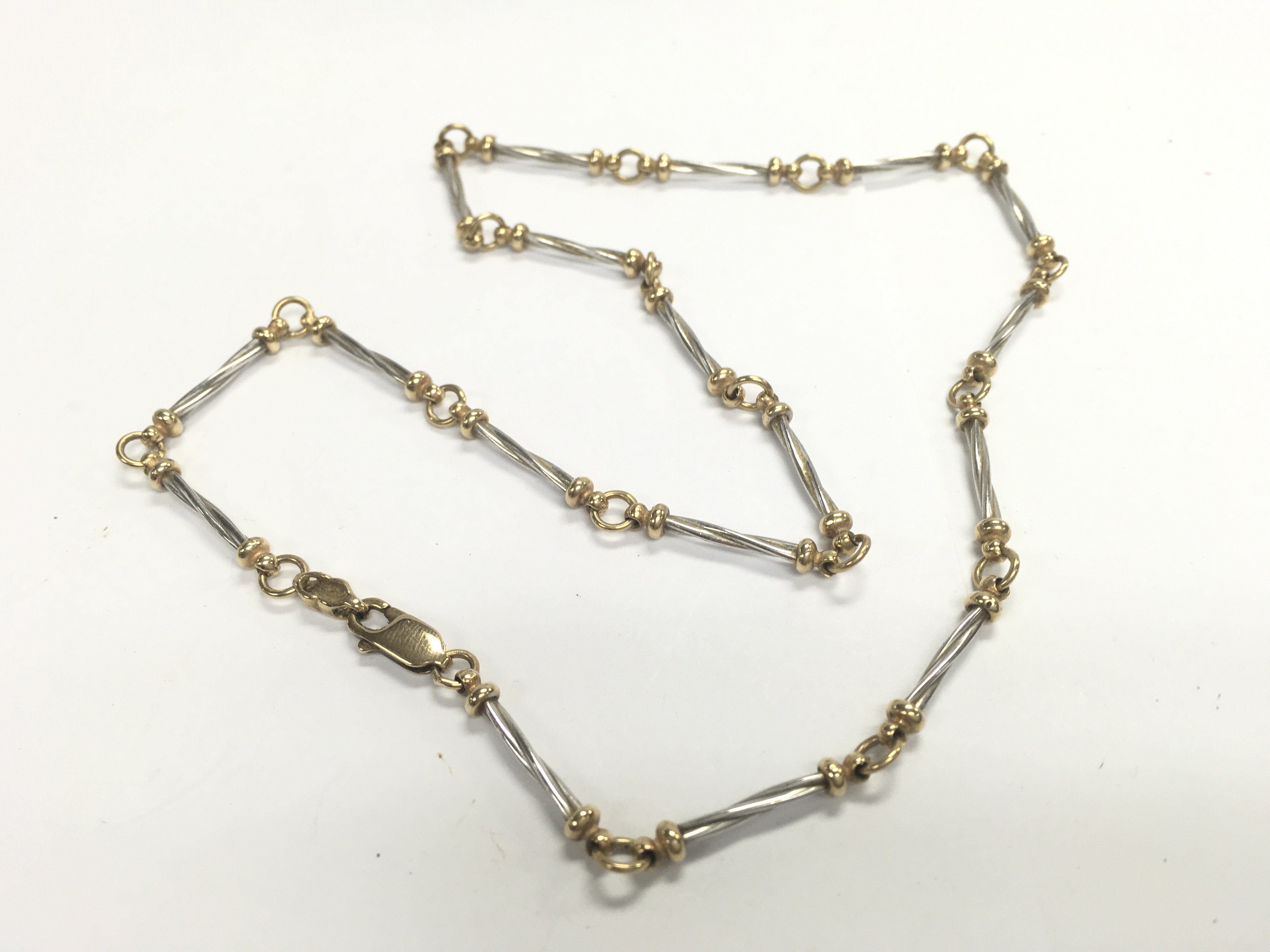 A 9ct gold two tone fancy link necklace. Approx weight 12.24 grams.