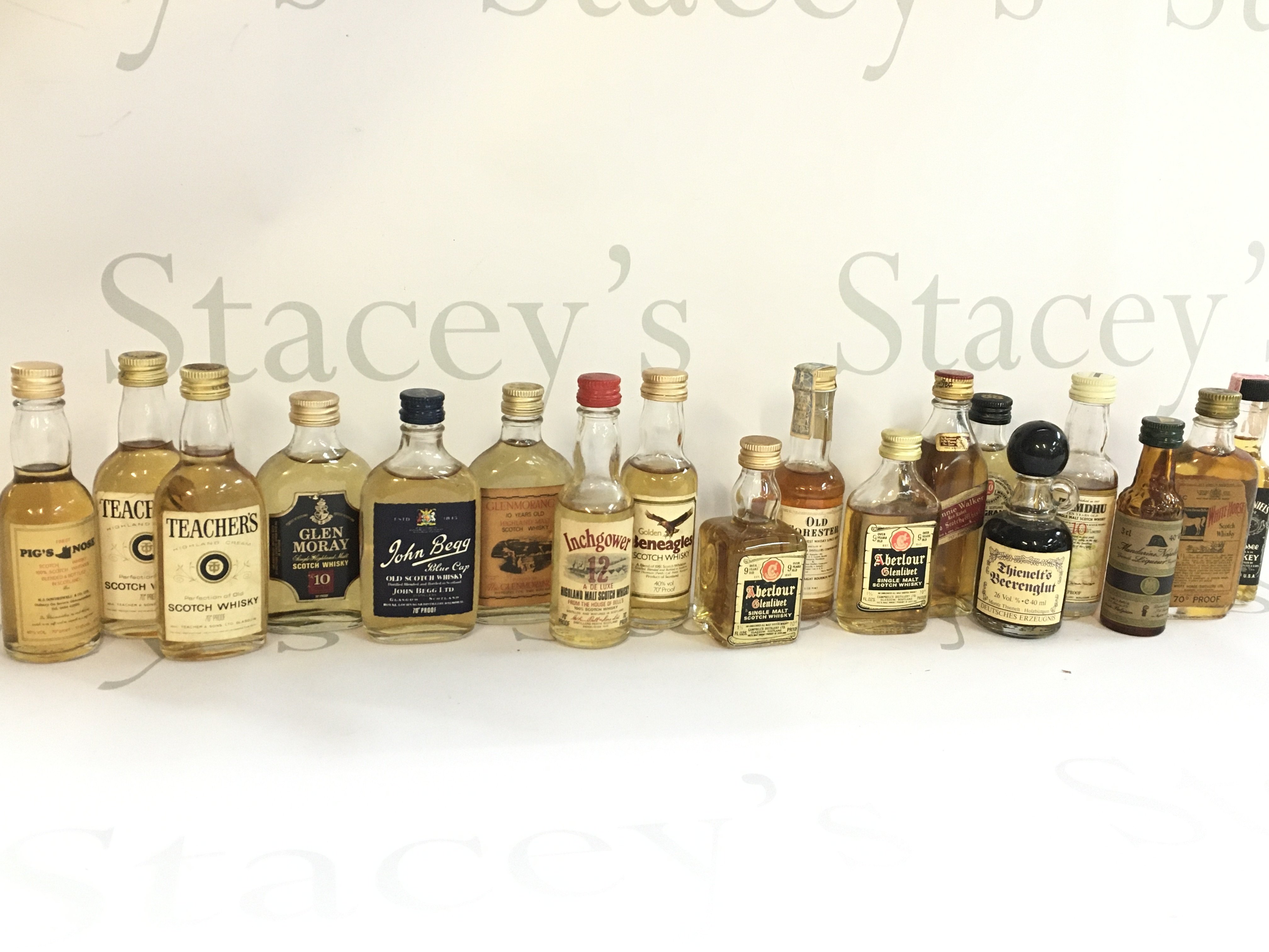 A collection of miniatures including Pigs Nose, Glen Moray, Inchgower, Aberlour, White Horse, Old Forester. This lot cannot be posted
