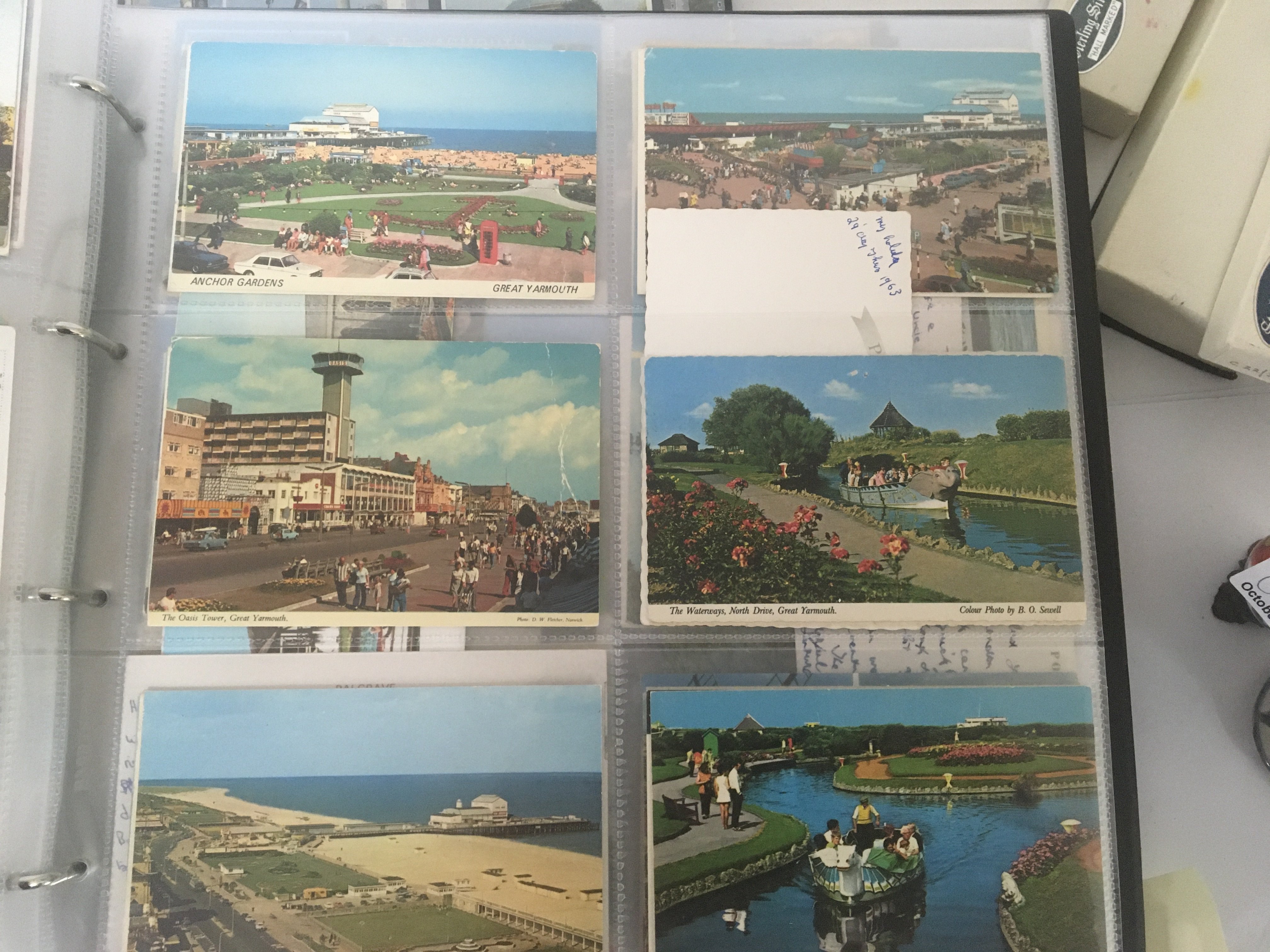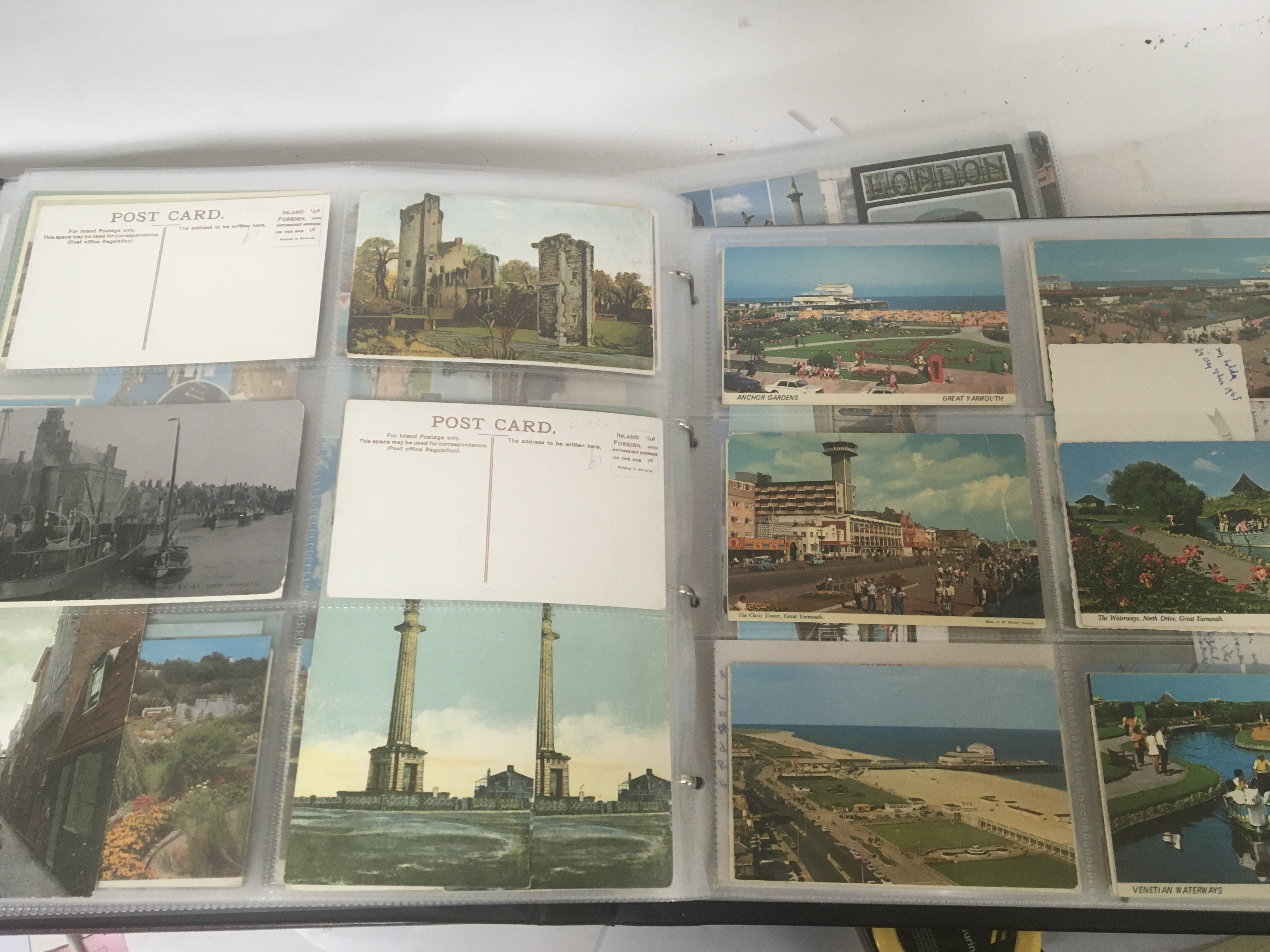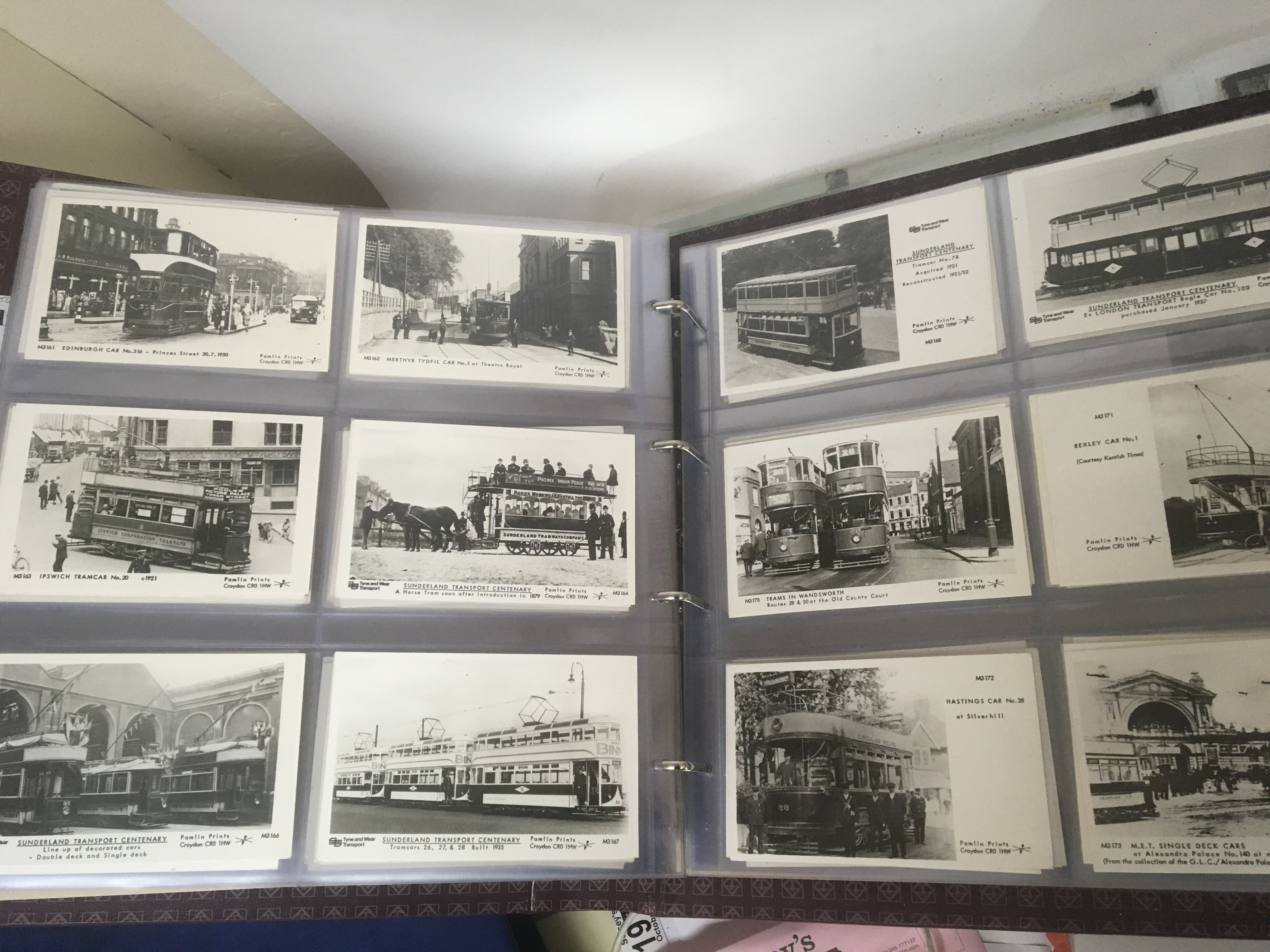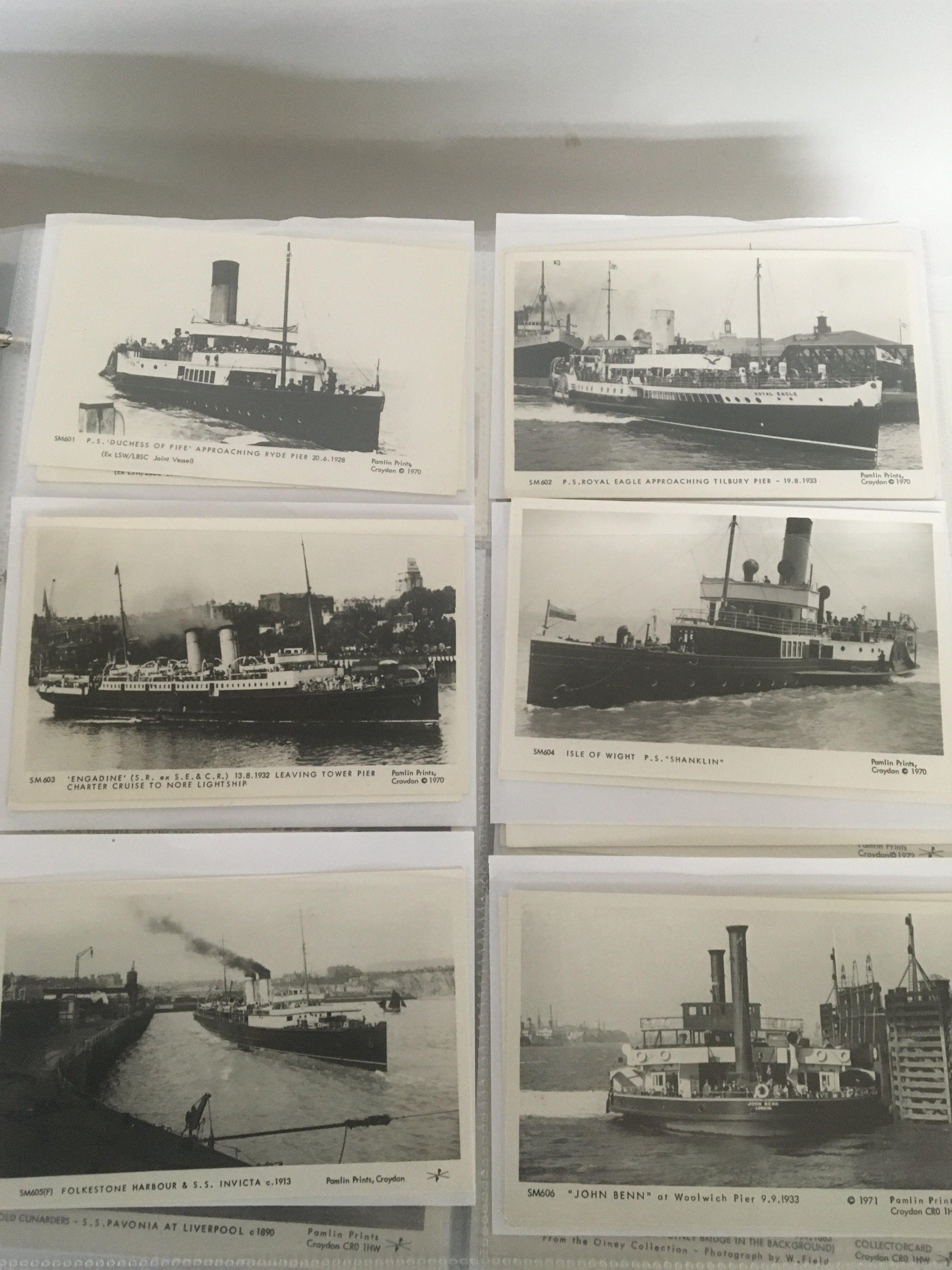 A large collection of well presented postcards an album containing Suffolk and Norfolk views both black and white and colour. An album of London postcards and albums of Pamlin Prints retrospective postcards Shipping busses trains and many others in five albums.