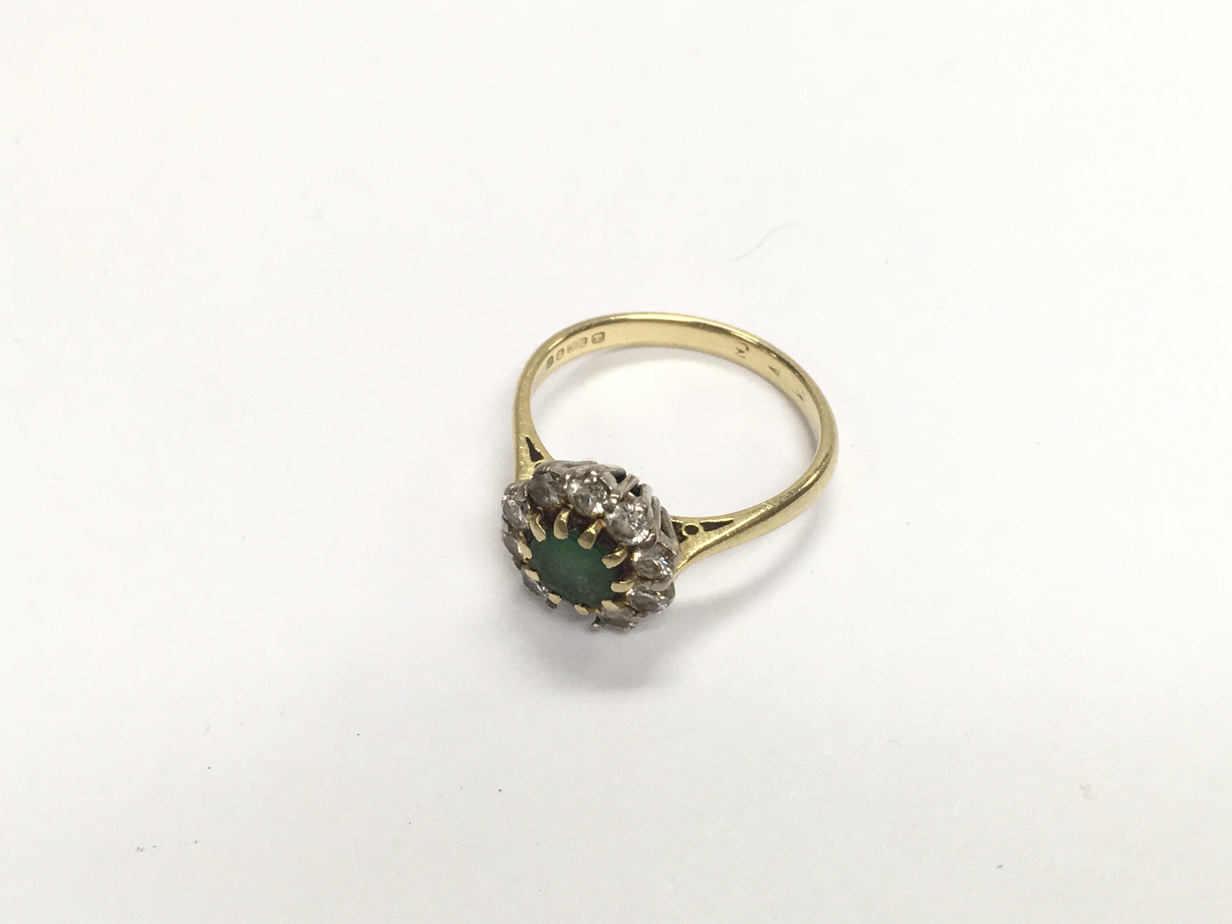 An 18ct gold ring set with diamonds and a green central stone. Approx weight 3.73 grams, size M1/2.
