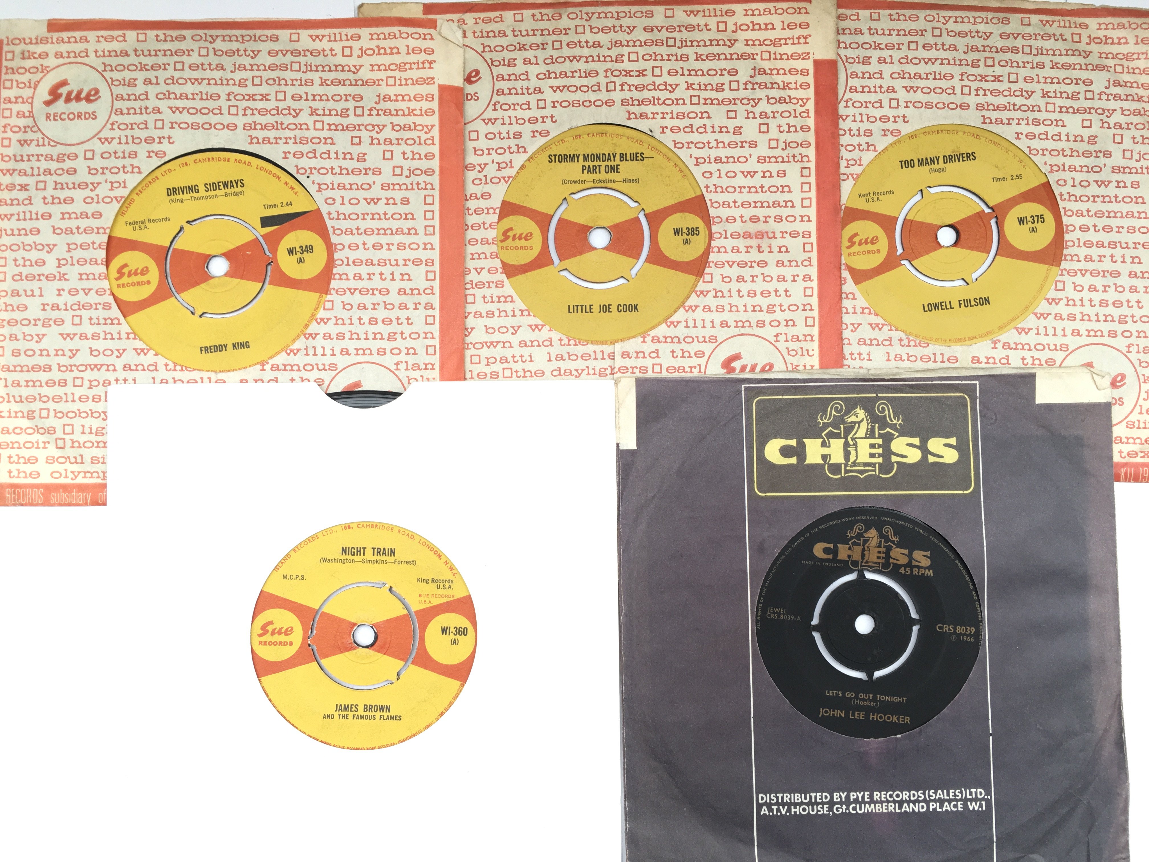 Five rare blues and soul UK 7" singles including five on the Sue label comprising Lowell Fulson WI 375, Little Joe Cook WI 385, Freddy King WI 349, James Brown WI 360 and John Lee Hooker on the Chess label CRS 8039.