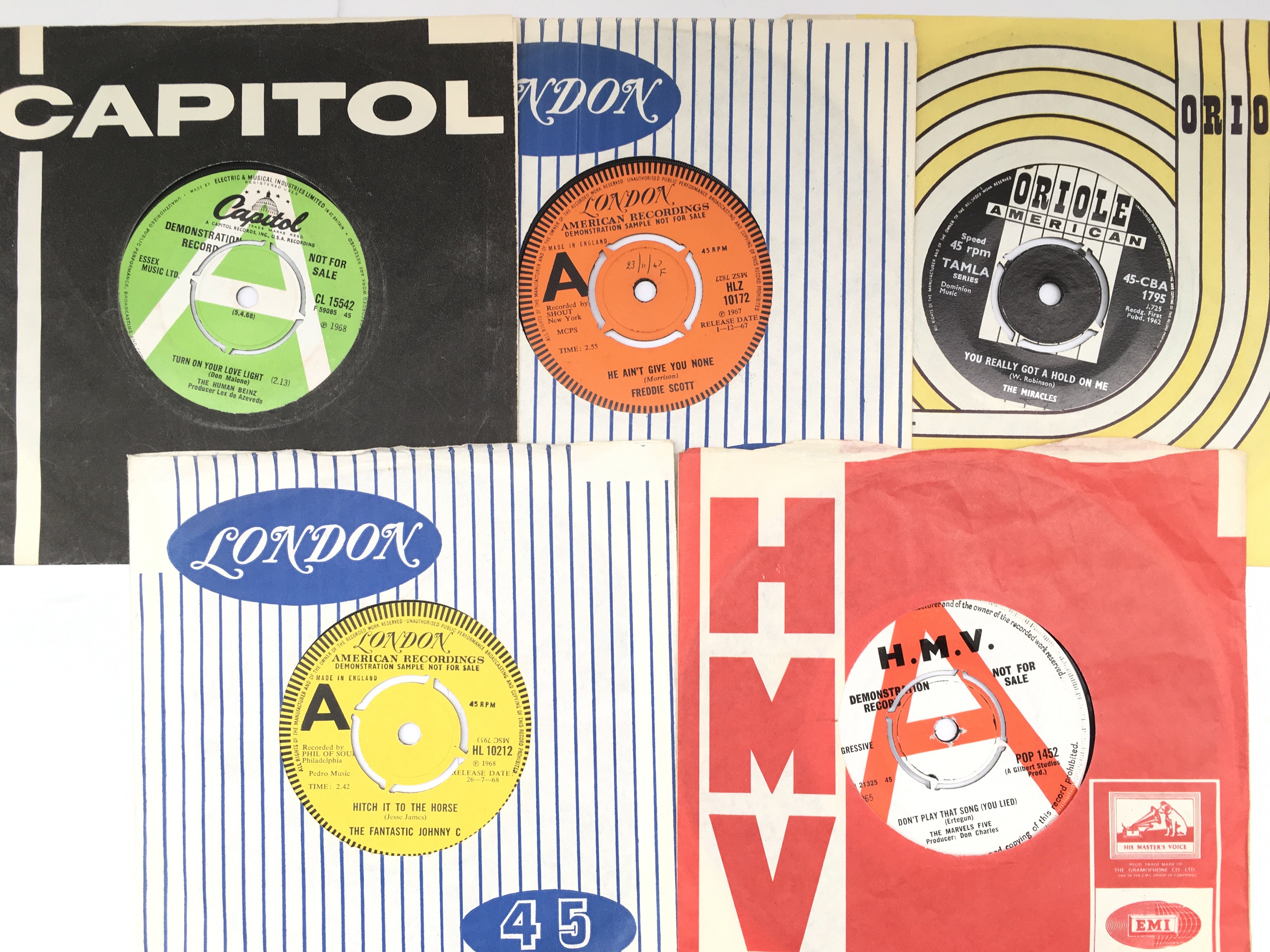 Five rare soul and beat UK 7" singles comprising 'You Really Got A Hold On Me' by The Miracles on the Oriole label CBA 1795 and four demonstration discs comprising Freddie Scott on London HLZ 10172, The Human Beinz on Capitol CL 15542, The Marvels Five on HMV POP 1452 and The Fantastic Johnny C on London HL 10212.