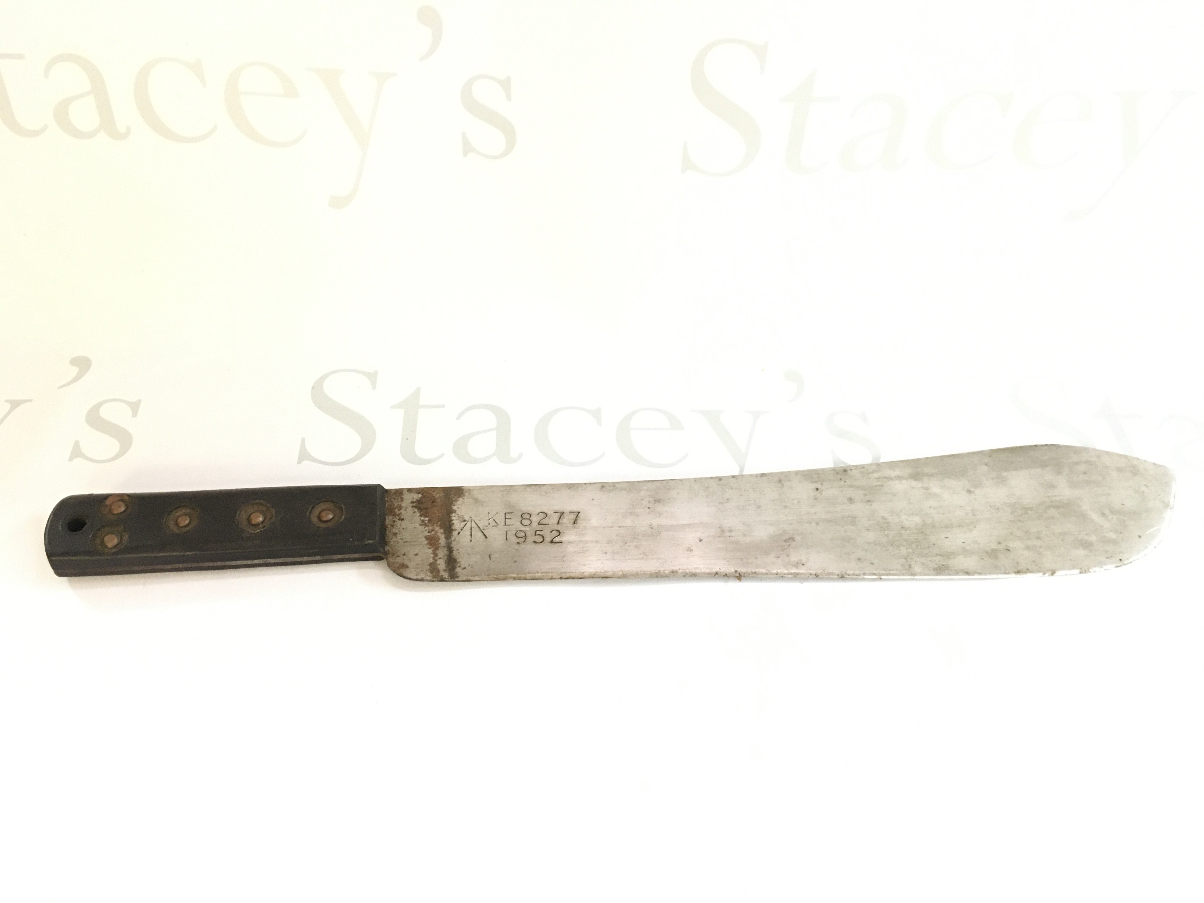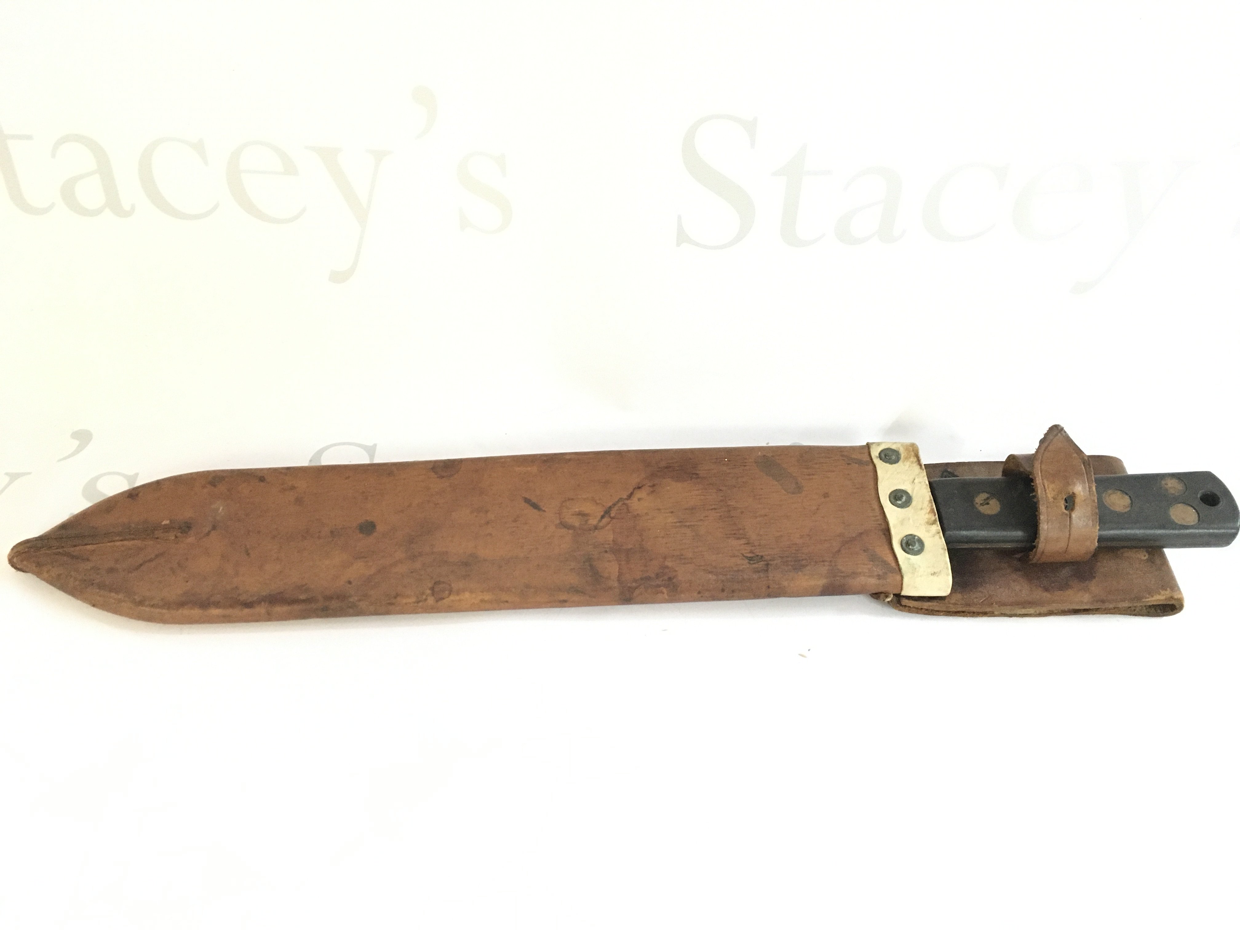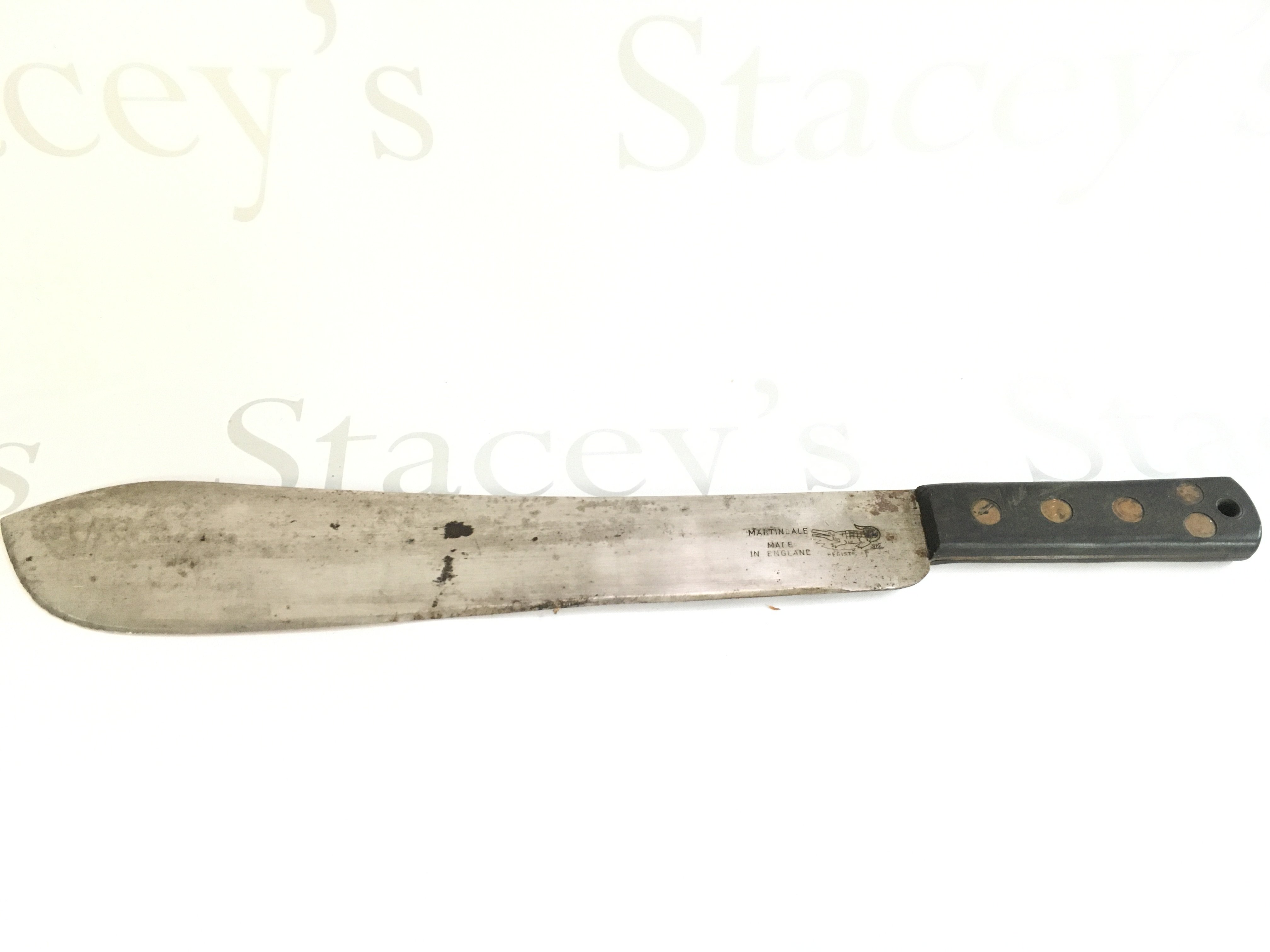 A British Army Martindale Crocodile machete with leather sheath, 52cm long. This lot cannot be posted