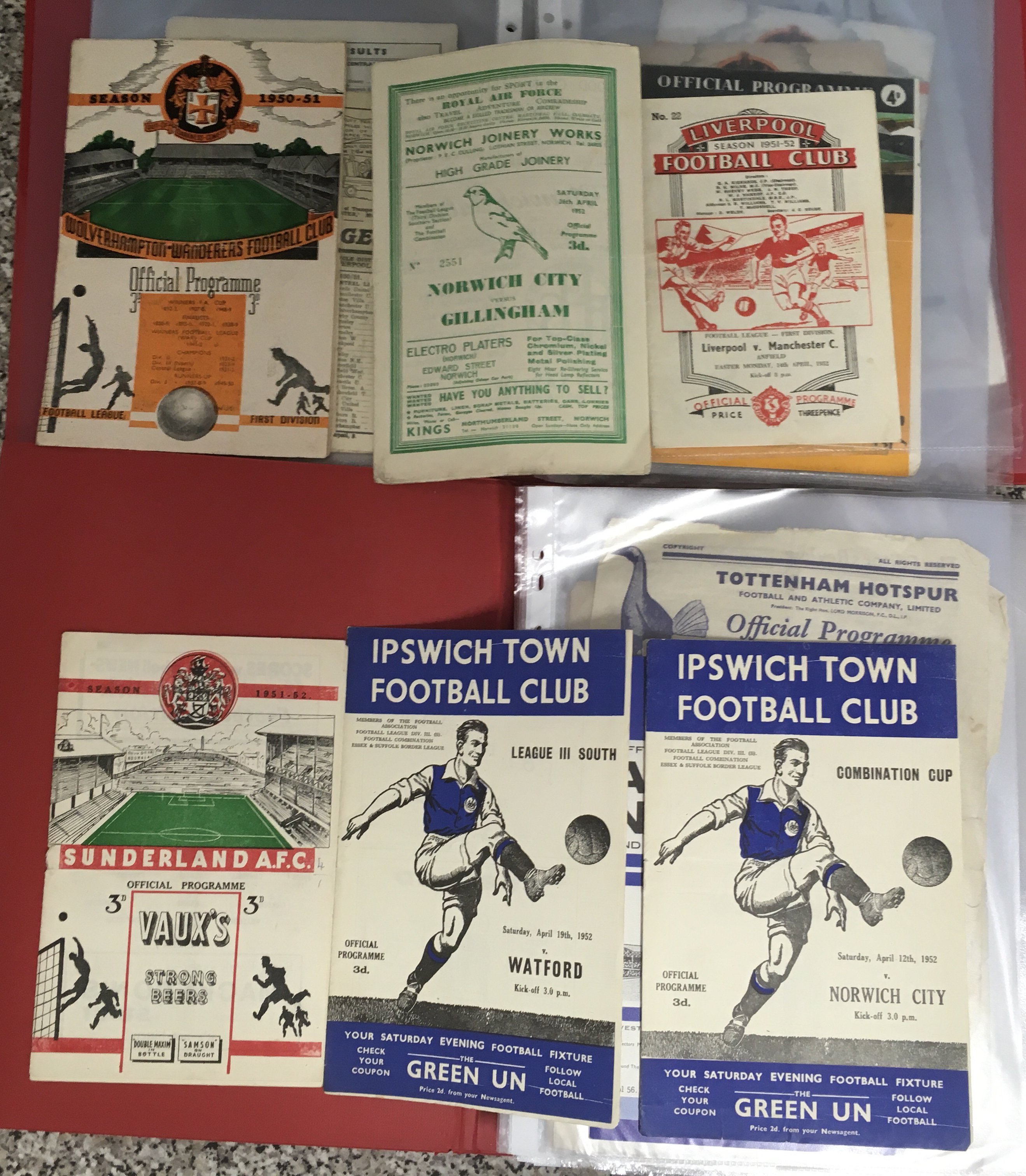 1950s + 1960s Football Programme Folders: Includes 49/50 QPR Reserves v Luton, 50/51 Liverpool v Sunderland, Wolves v Huddersfield FA Cup, 51/52 Man City v Bolton, Norwich v Gillingham, Liverpool v Manchester City, Wolves v Fulham, Sunderland v Chelsea, Cardiff v Blackpool friendly, Southend v Millwall, Ipswich Reserves v Norwich + Watford, Newcastle v Blackpool, Aston Villa v Chelsea, 1967 Celtic v Racing Final. C/W some cards and more. Good condition. ( 2 folders )