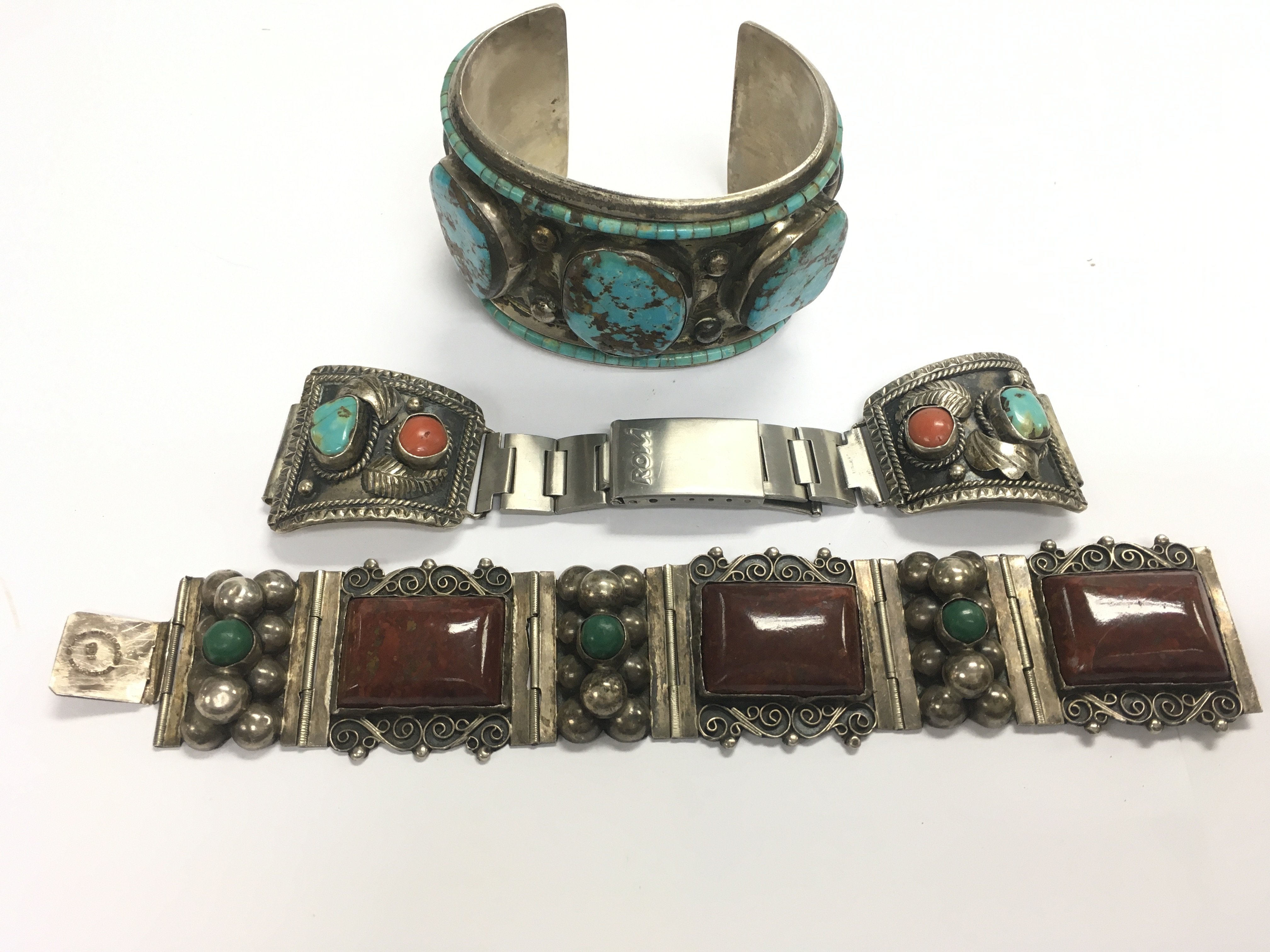 Two silver bracelets and one heavy silver bangle. Approx weight 273.07 grams.