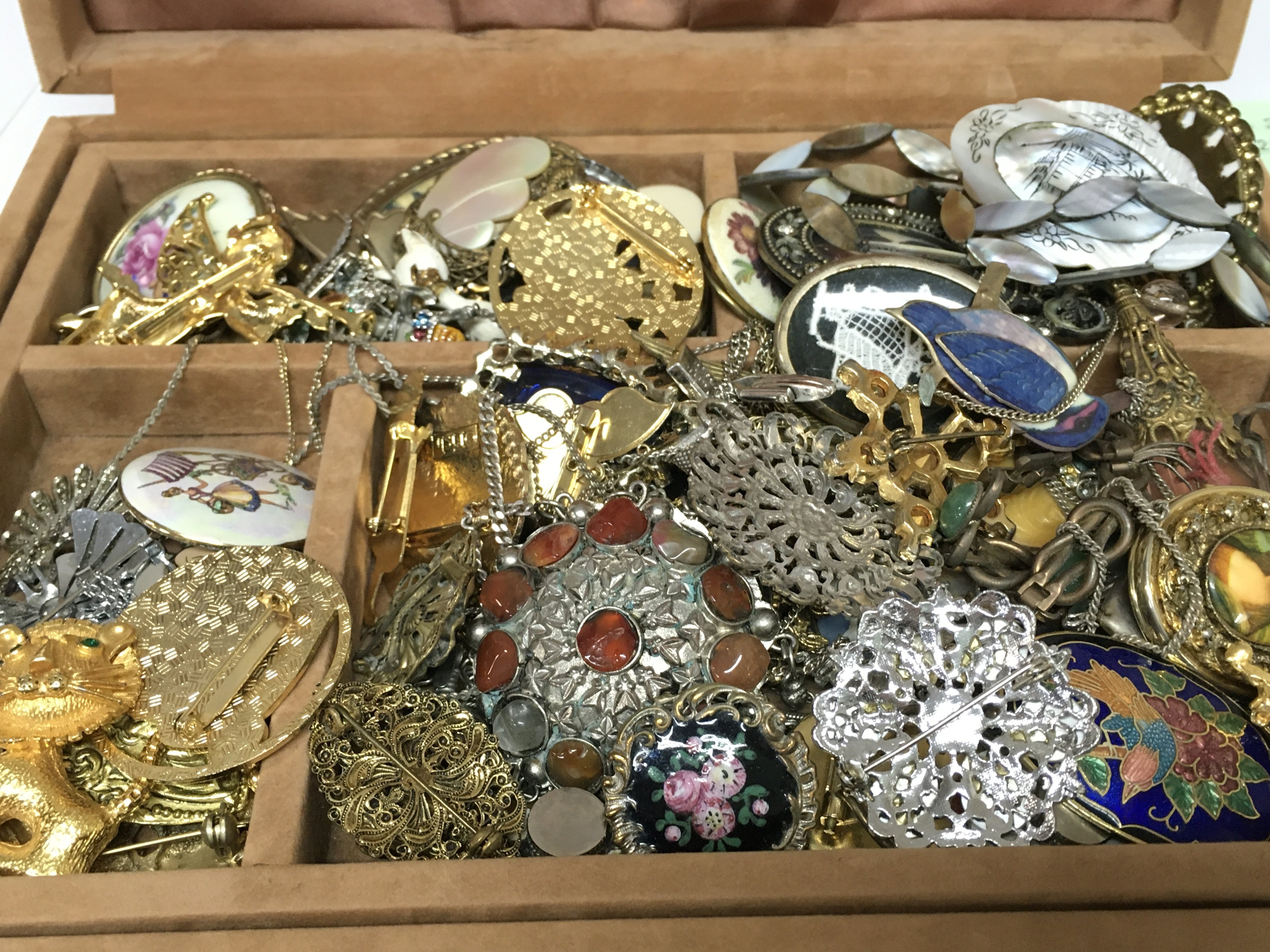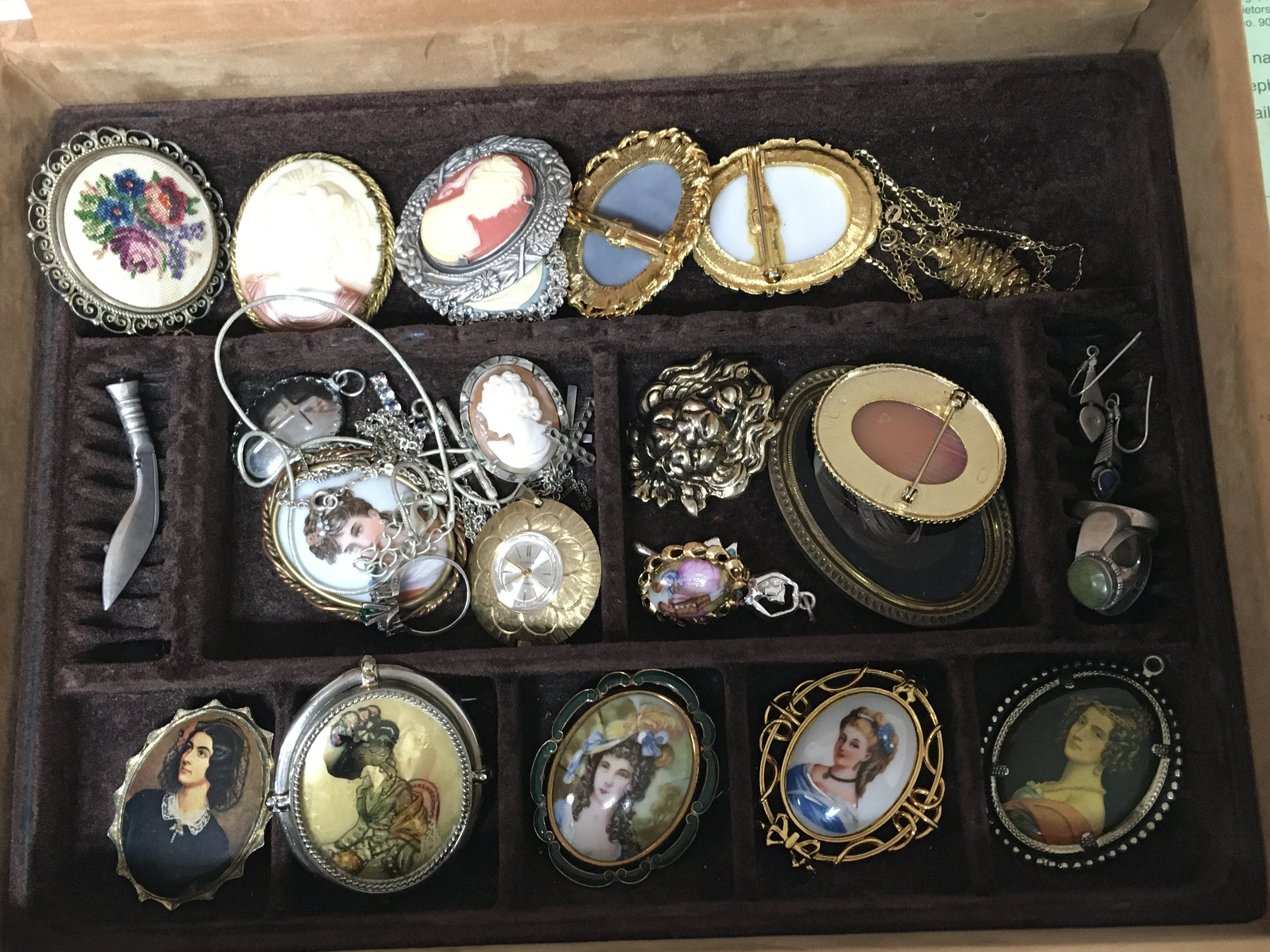 A box of various brooches and costume jewellery including silver rings, small 9ct gold necklace