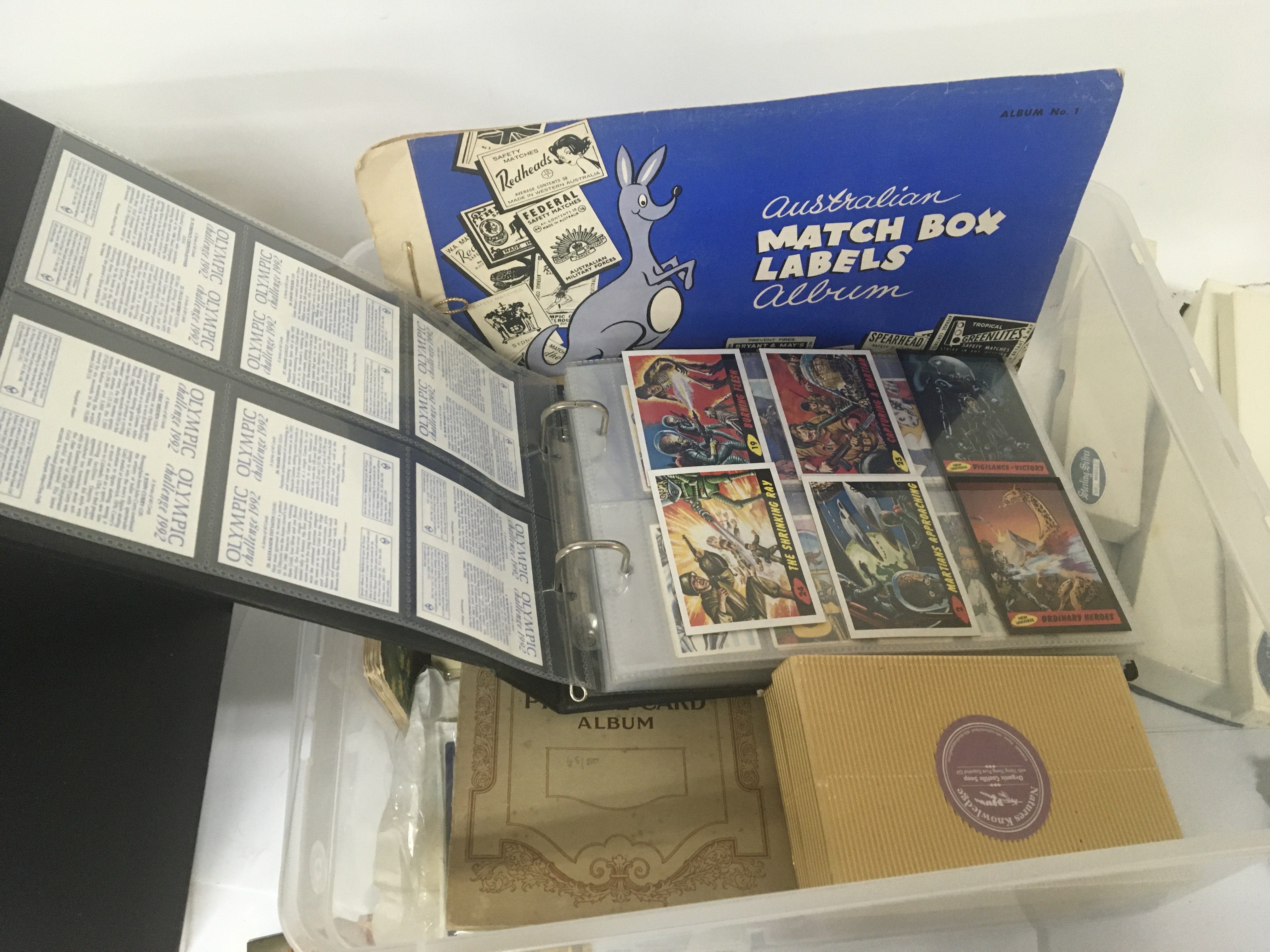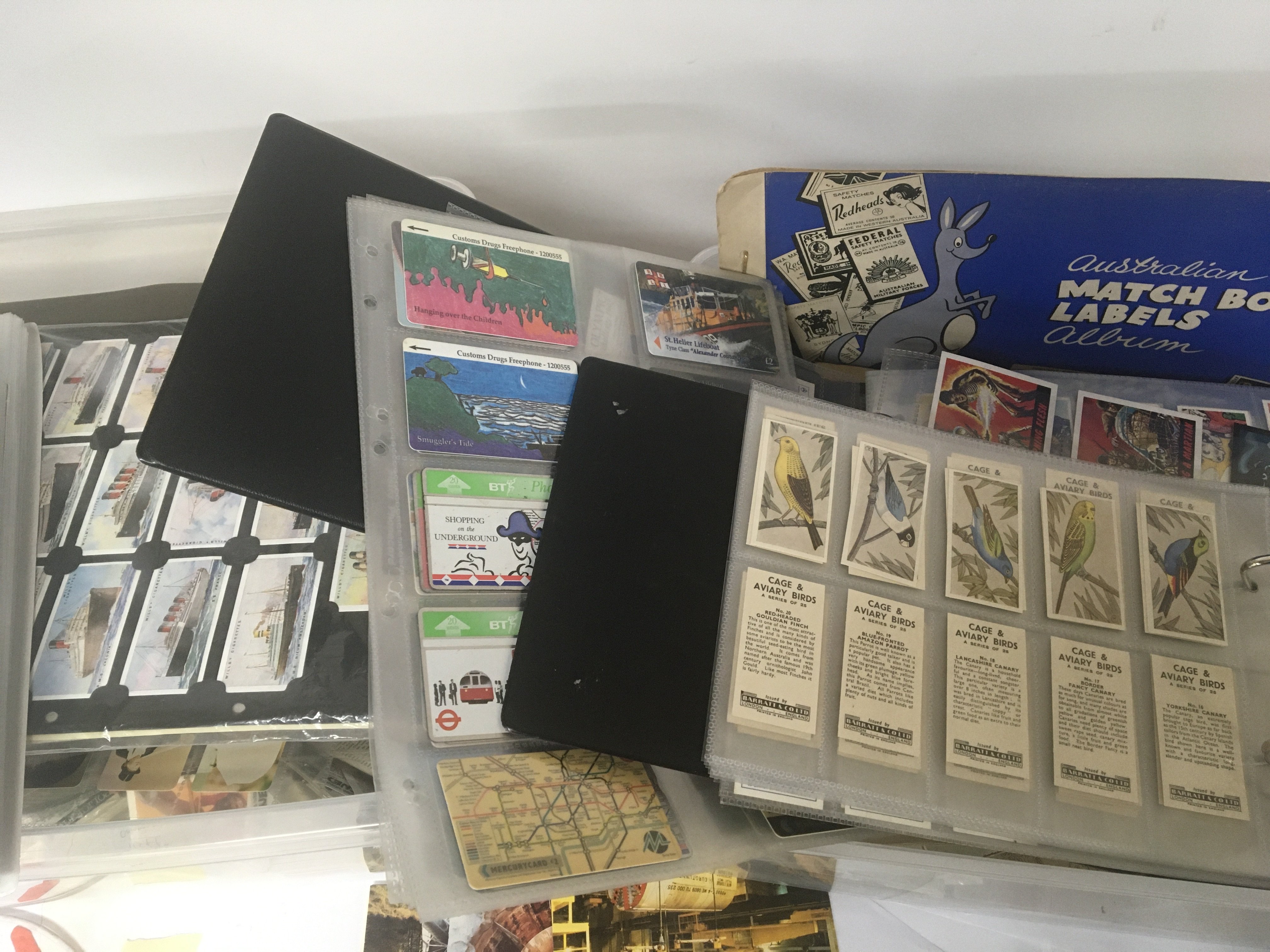 Two boxes containing an extensive collection of cigarette cards including Barratt & Co Players Poultry Phone cards tea Cards Vintage IDW topps cards and many others in albums and loose (2)