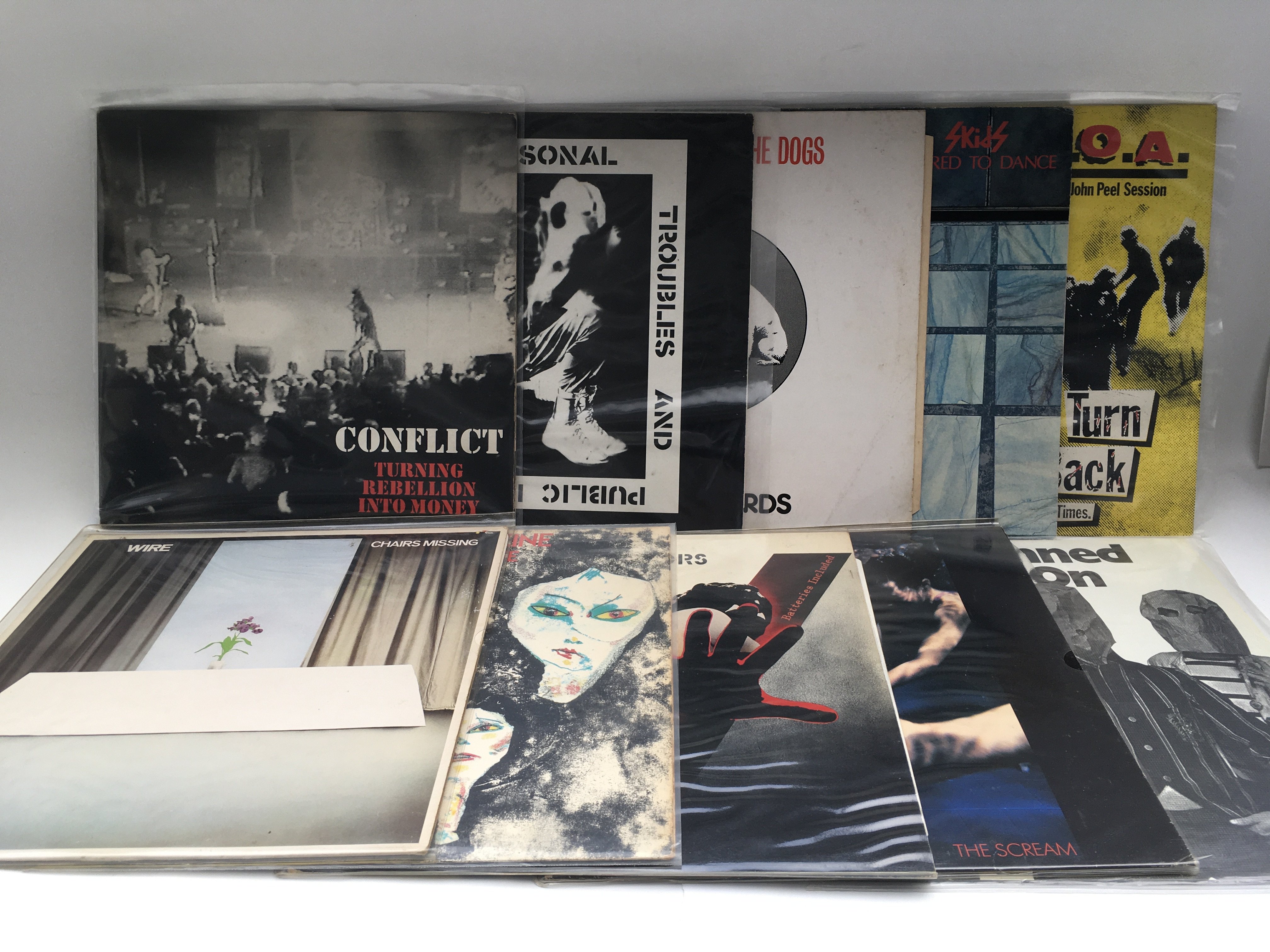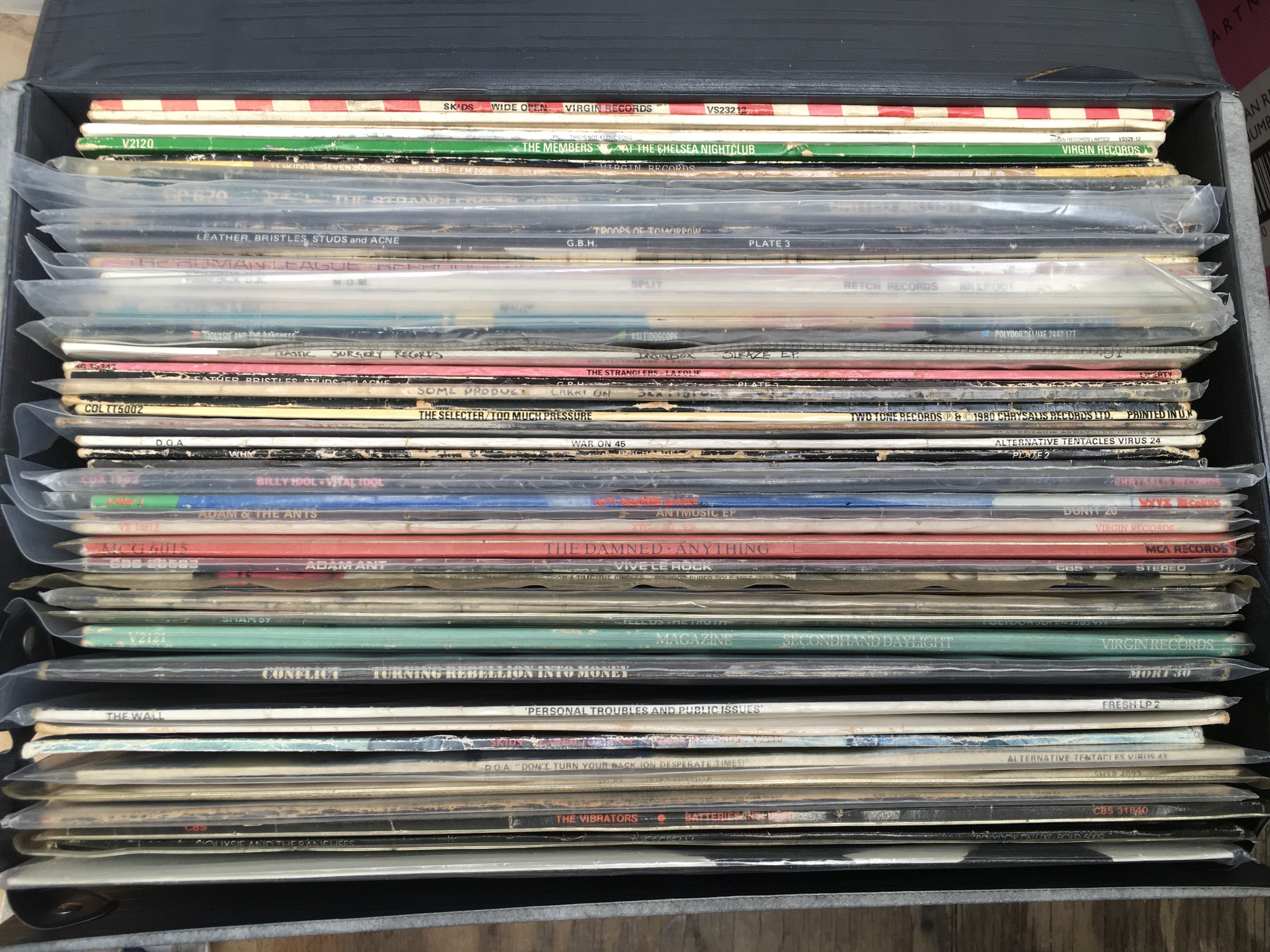 A record case of over 50 punk rock LPs and 12" singles by various artists including Sex Pistols, Wire, Magazine, Crass and others.
