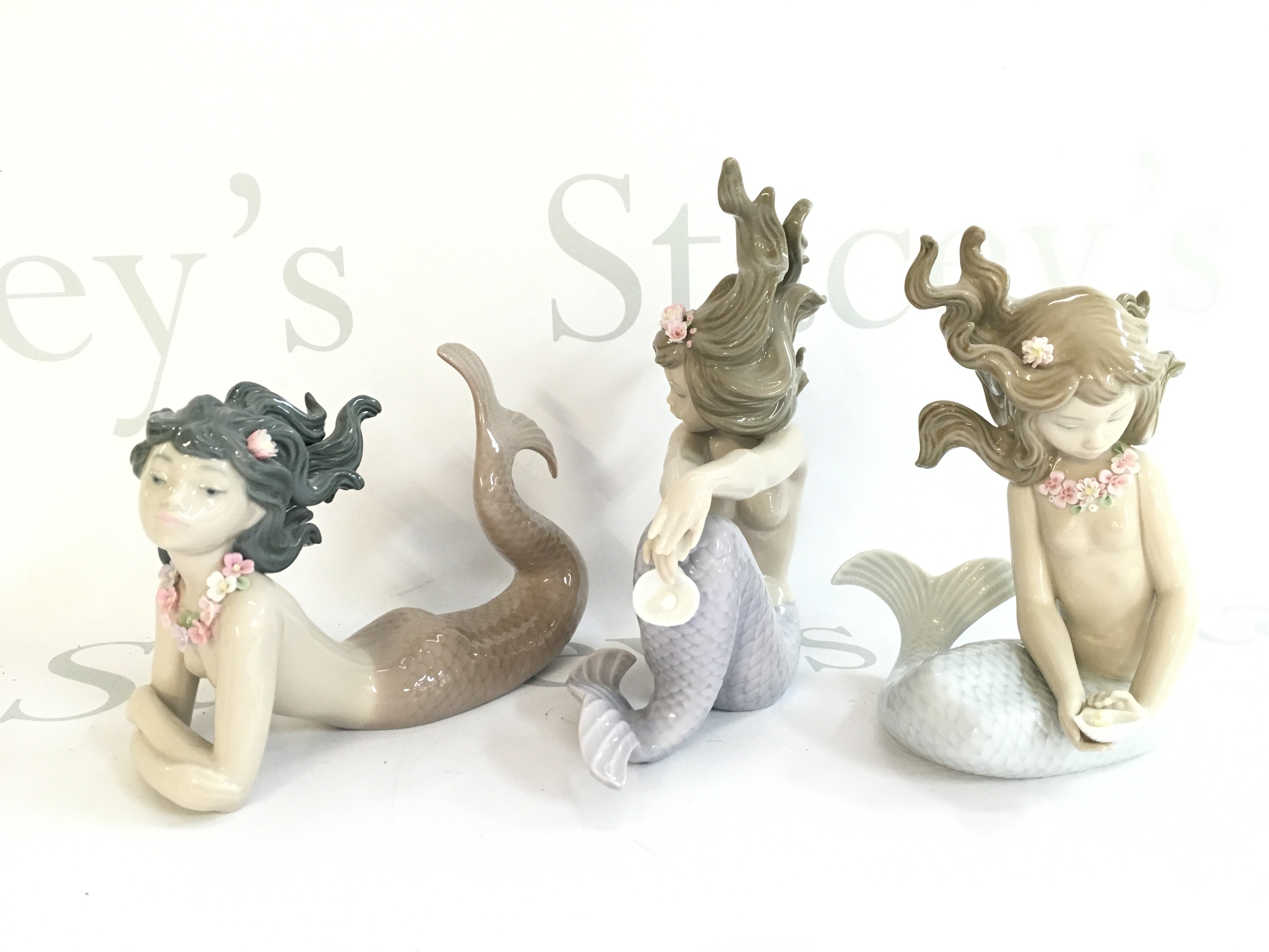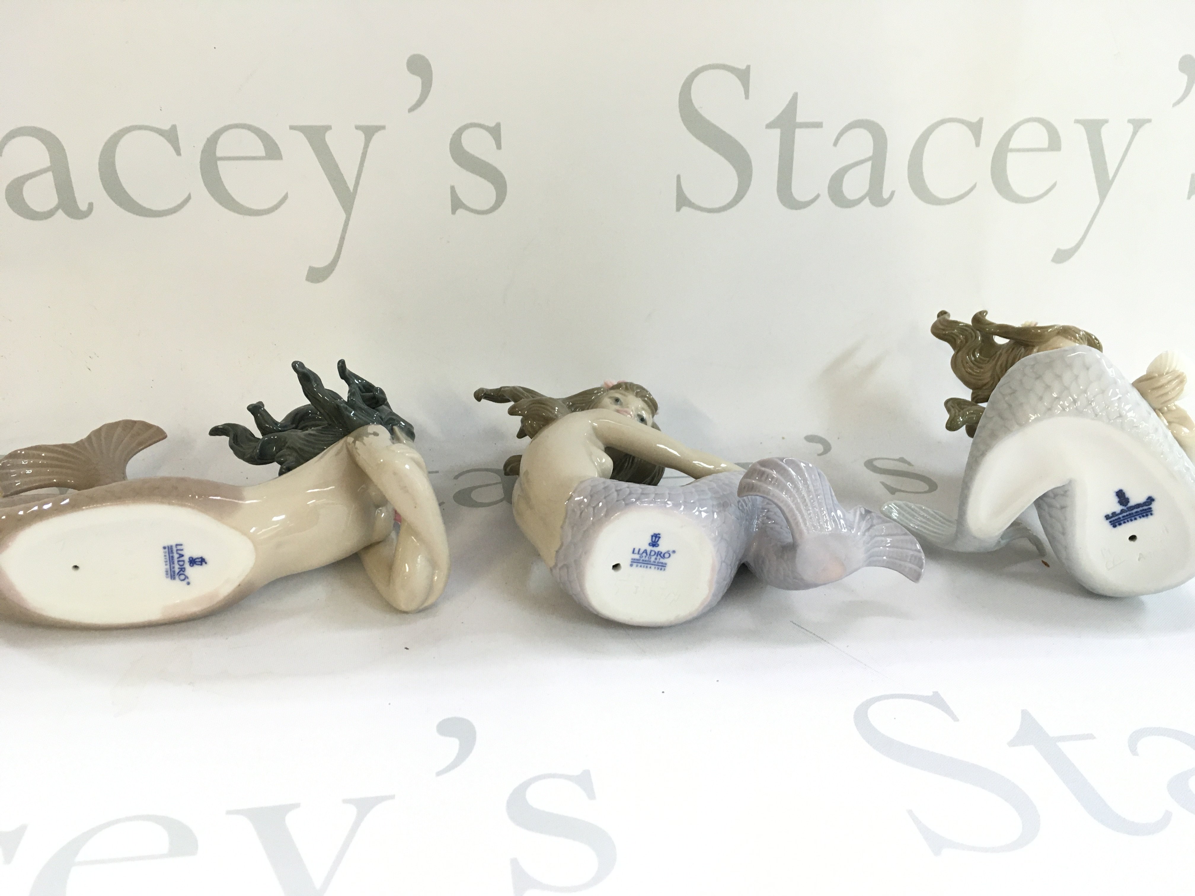 Three Lladro mermaid porcelain figures. 11 to 17cm tall. No obvious large damage or restoration