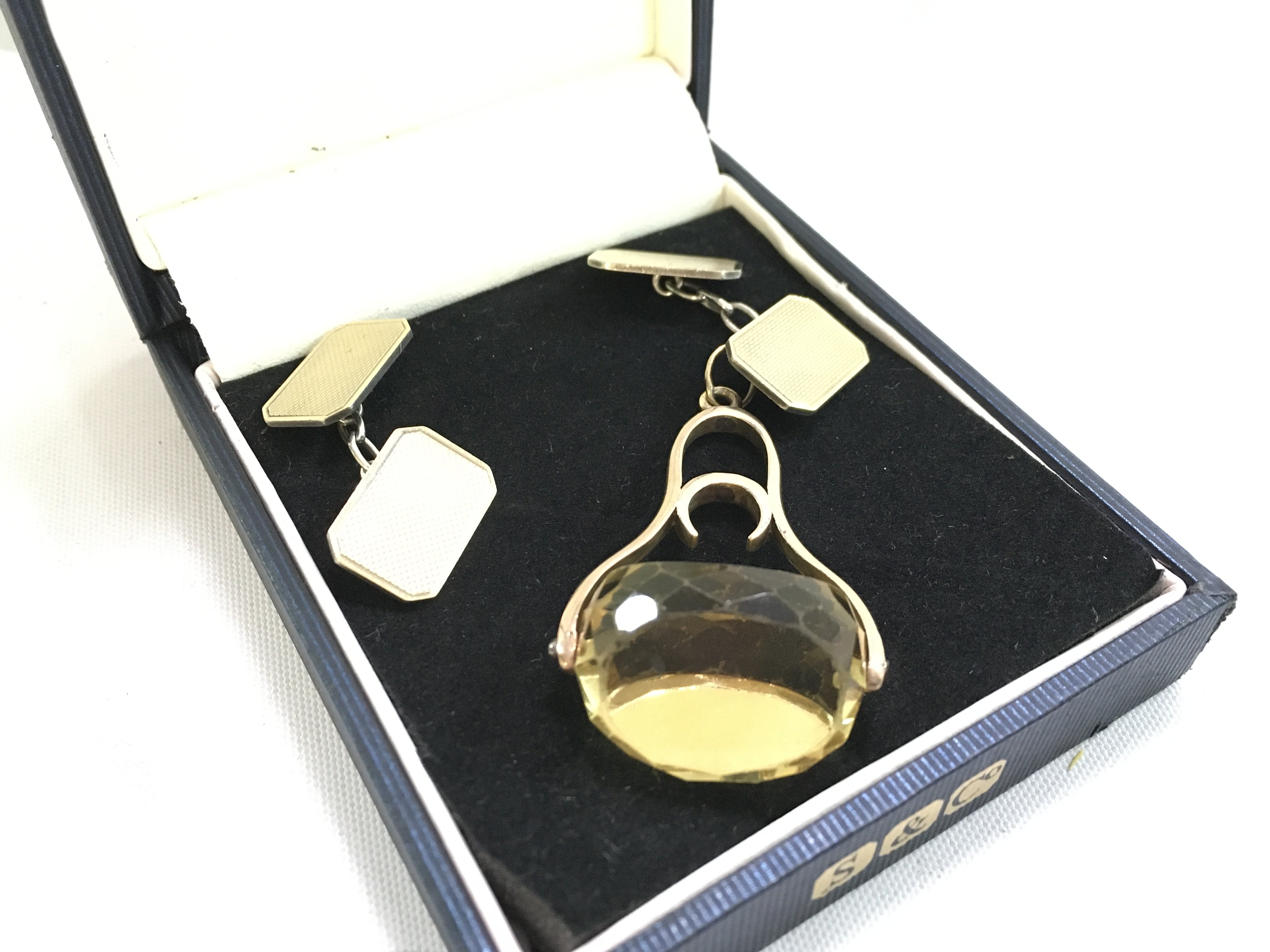 A yellow metal and citrine fob and a pair of silver cufflinks. Postage category A