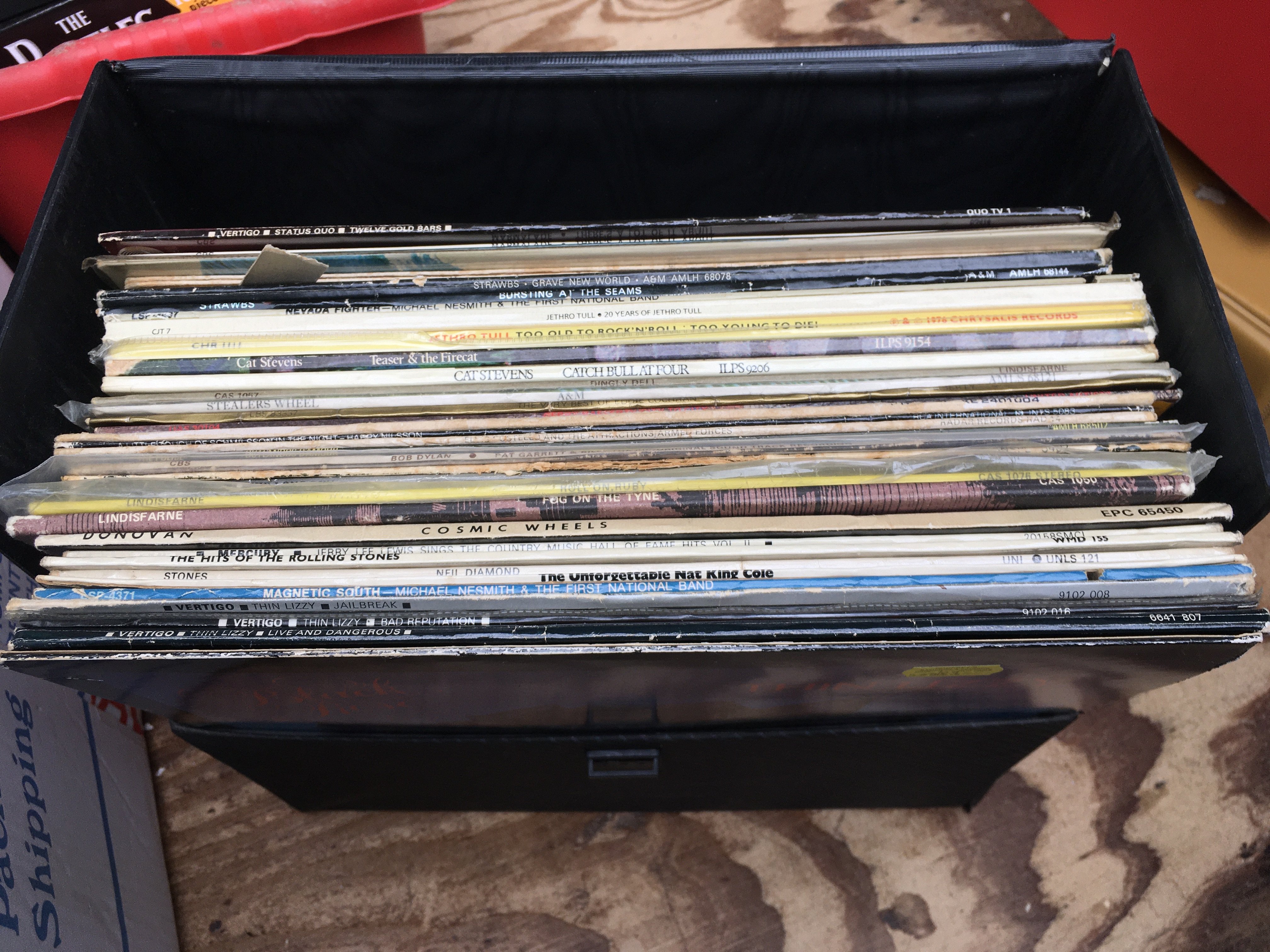 A record case of LPs by various artists including Thin Lizzy, Jethro Tull and others.