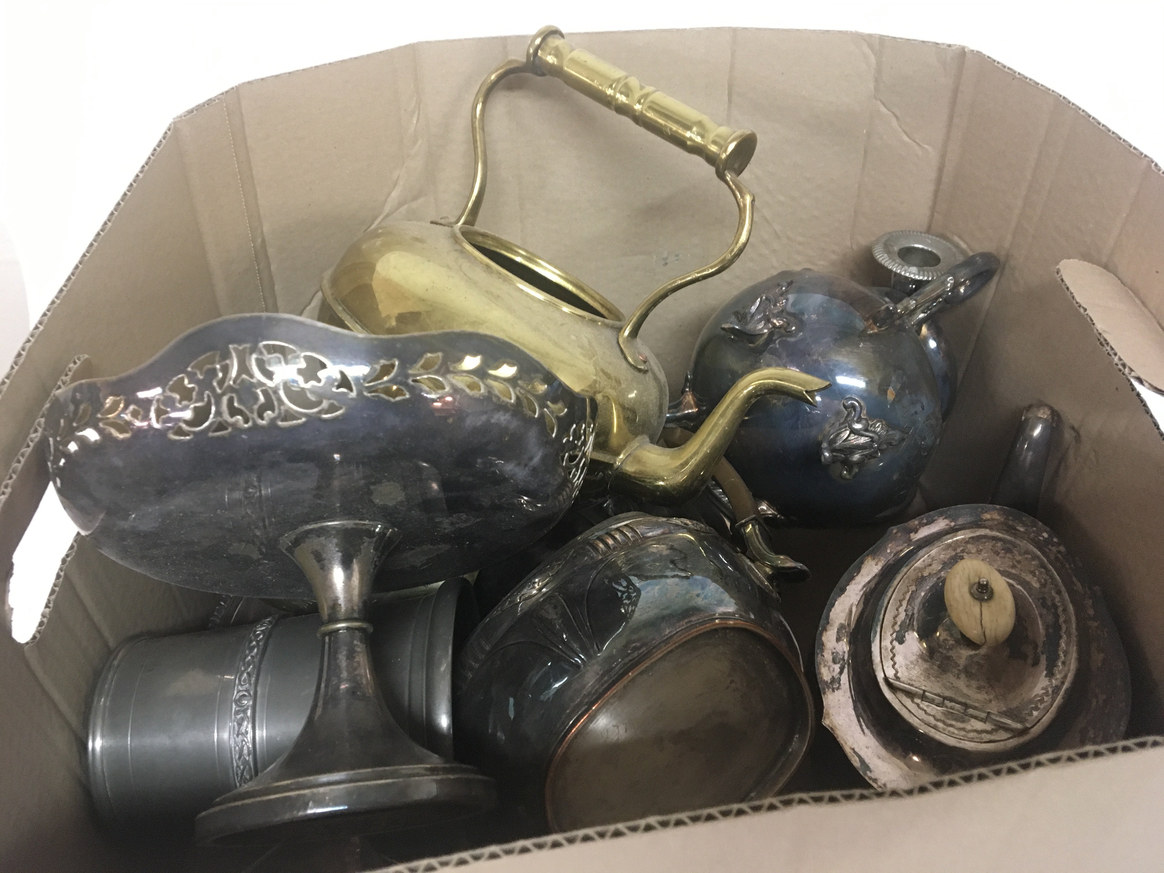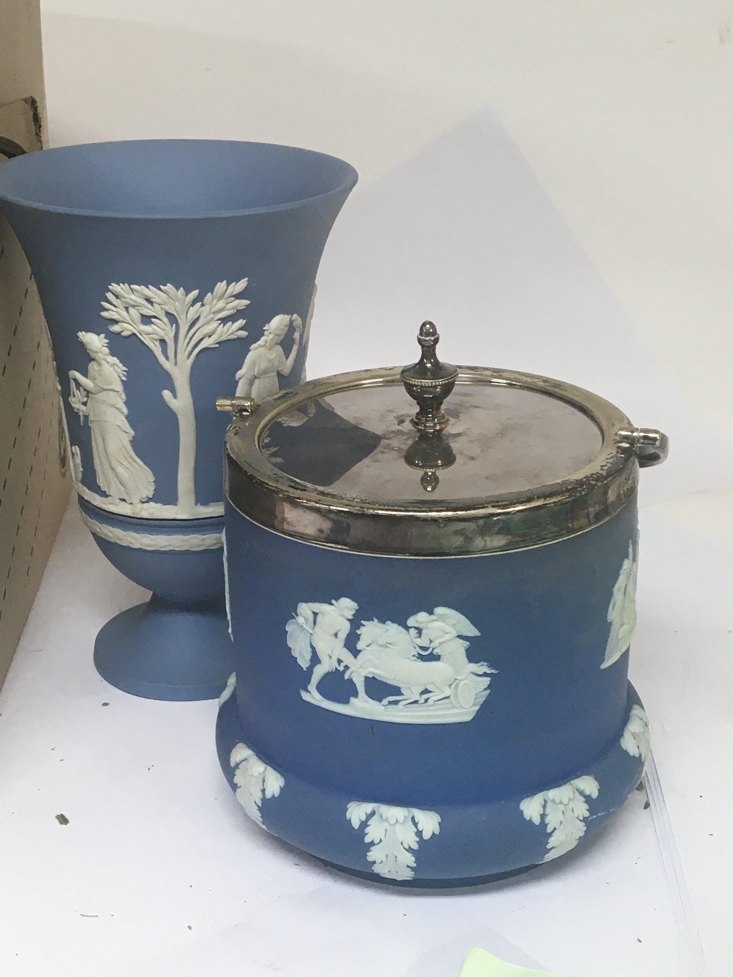 A Wedgwood blue Jasperware biscuit barrel and vase and a box containing silver plate and brassware.