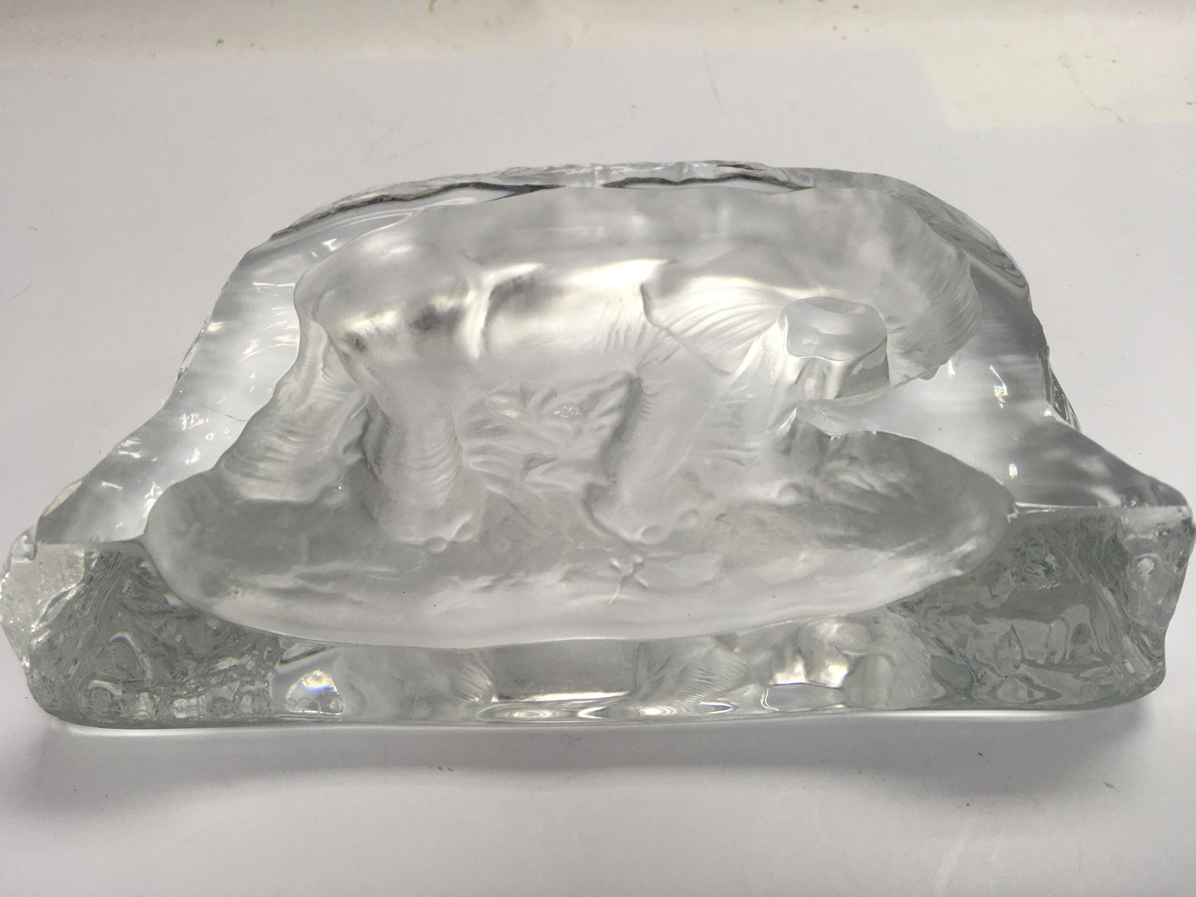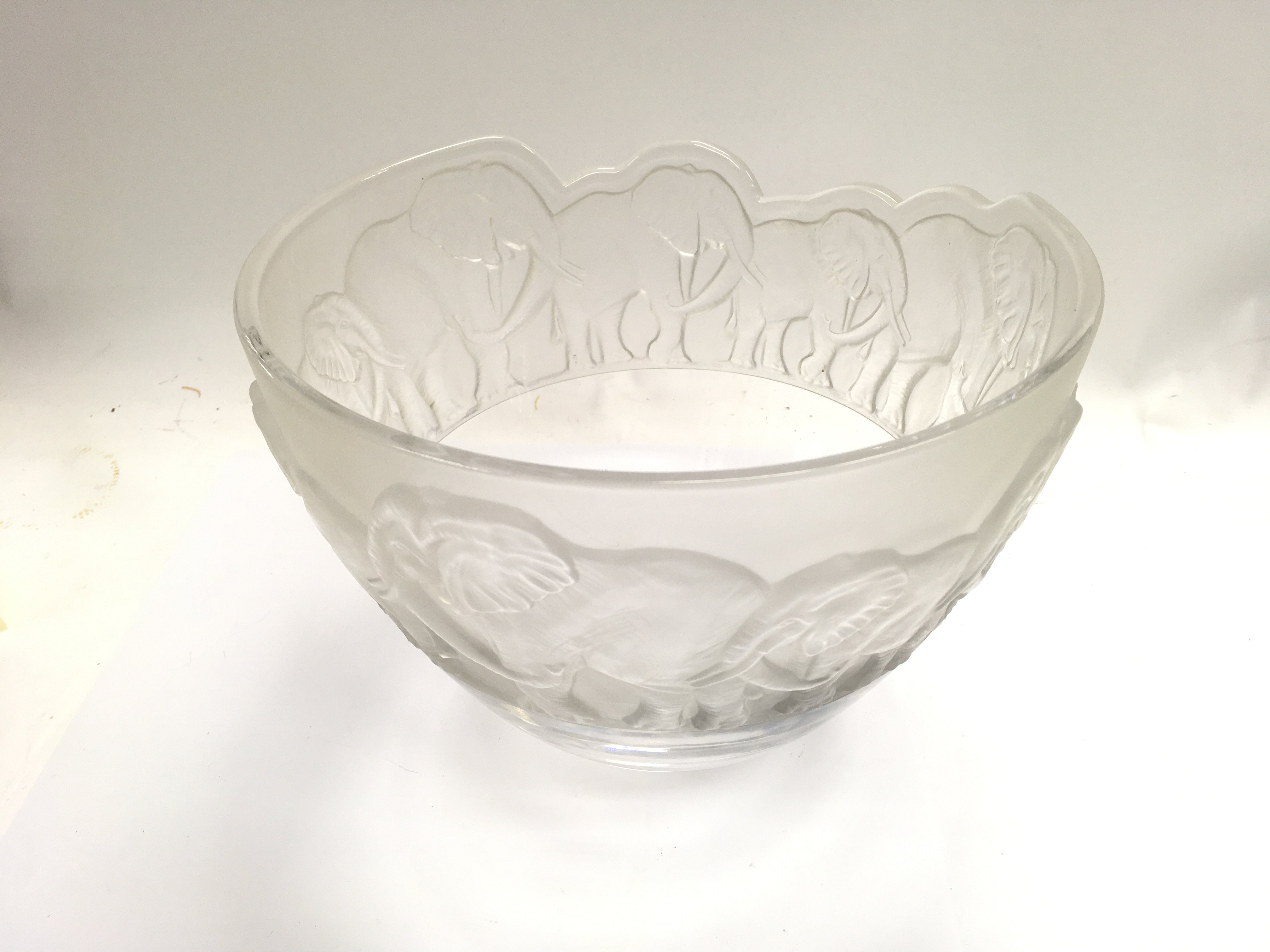 An elephant fruit bowl and paper weight with another glass cut fruit bowl.