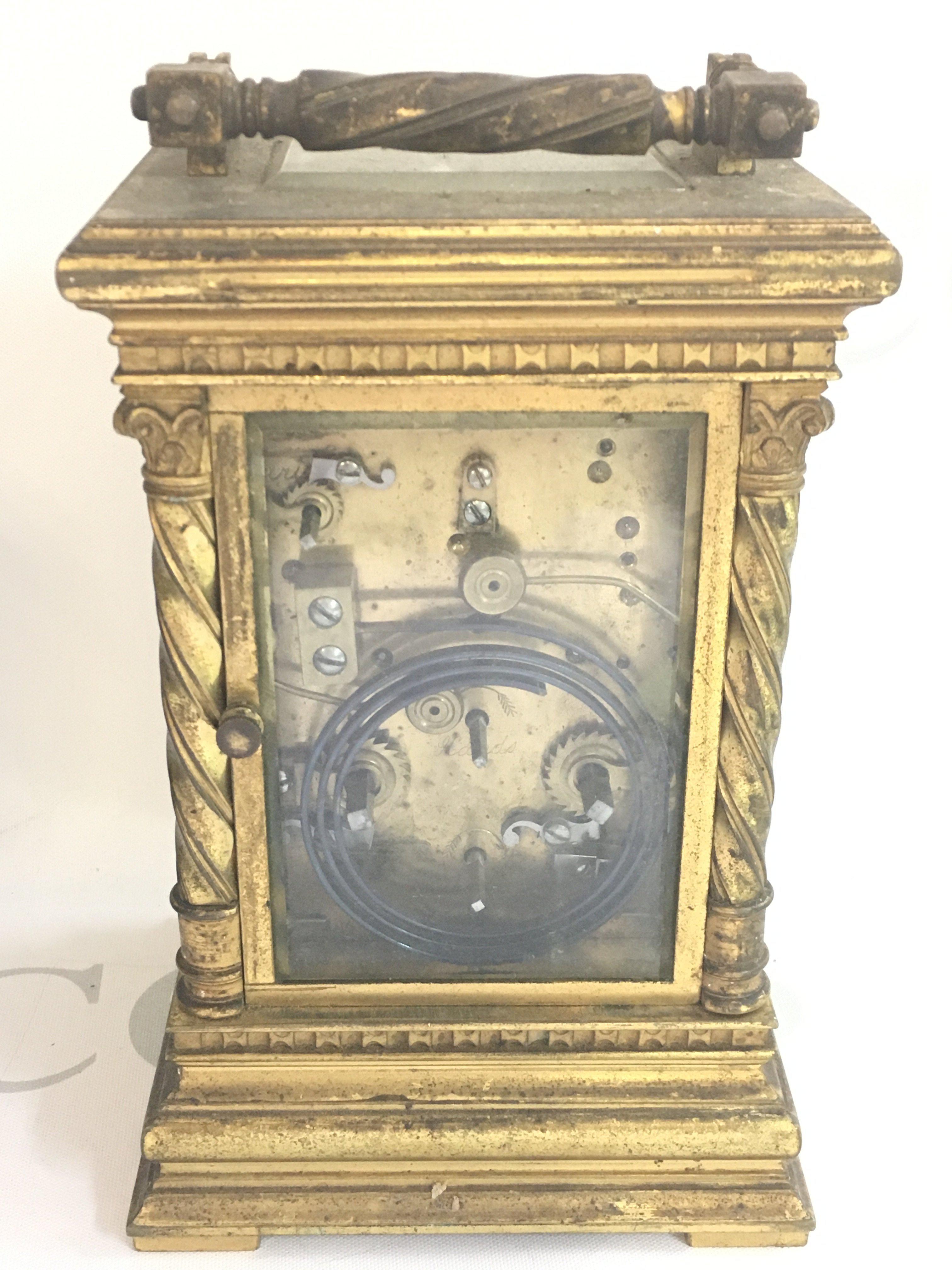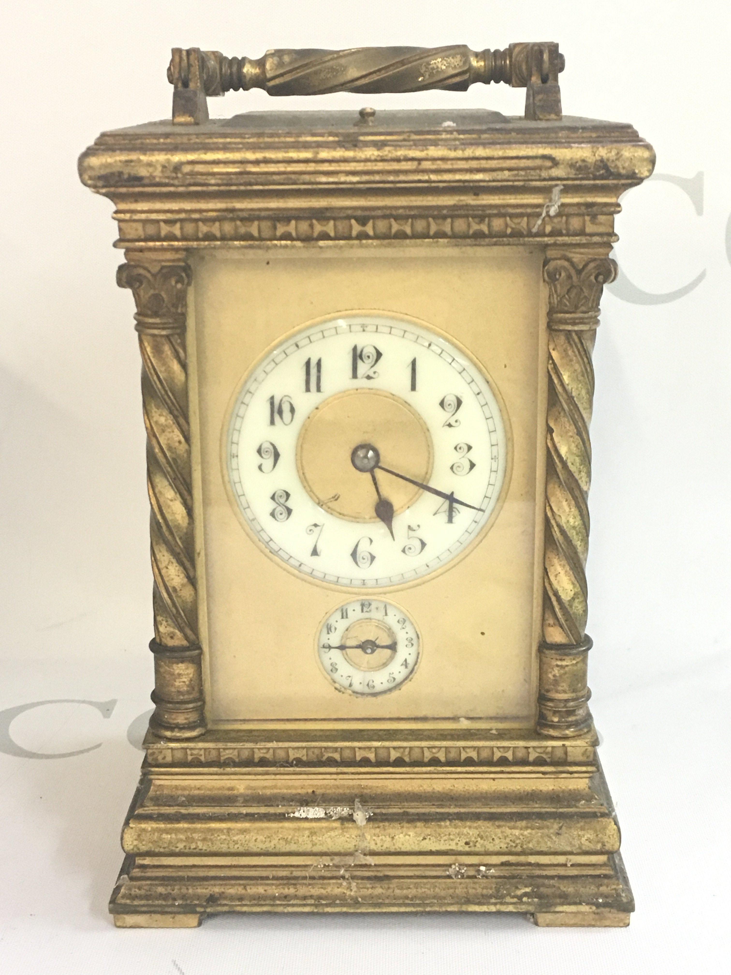 A late 19th century brass carriage clock with repeat strike movement. No key. In need of restoration. Dimensions 9.5x11x16.5cm This lot cannot be posted