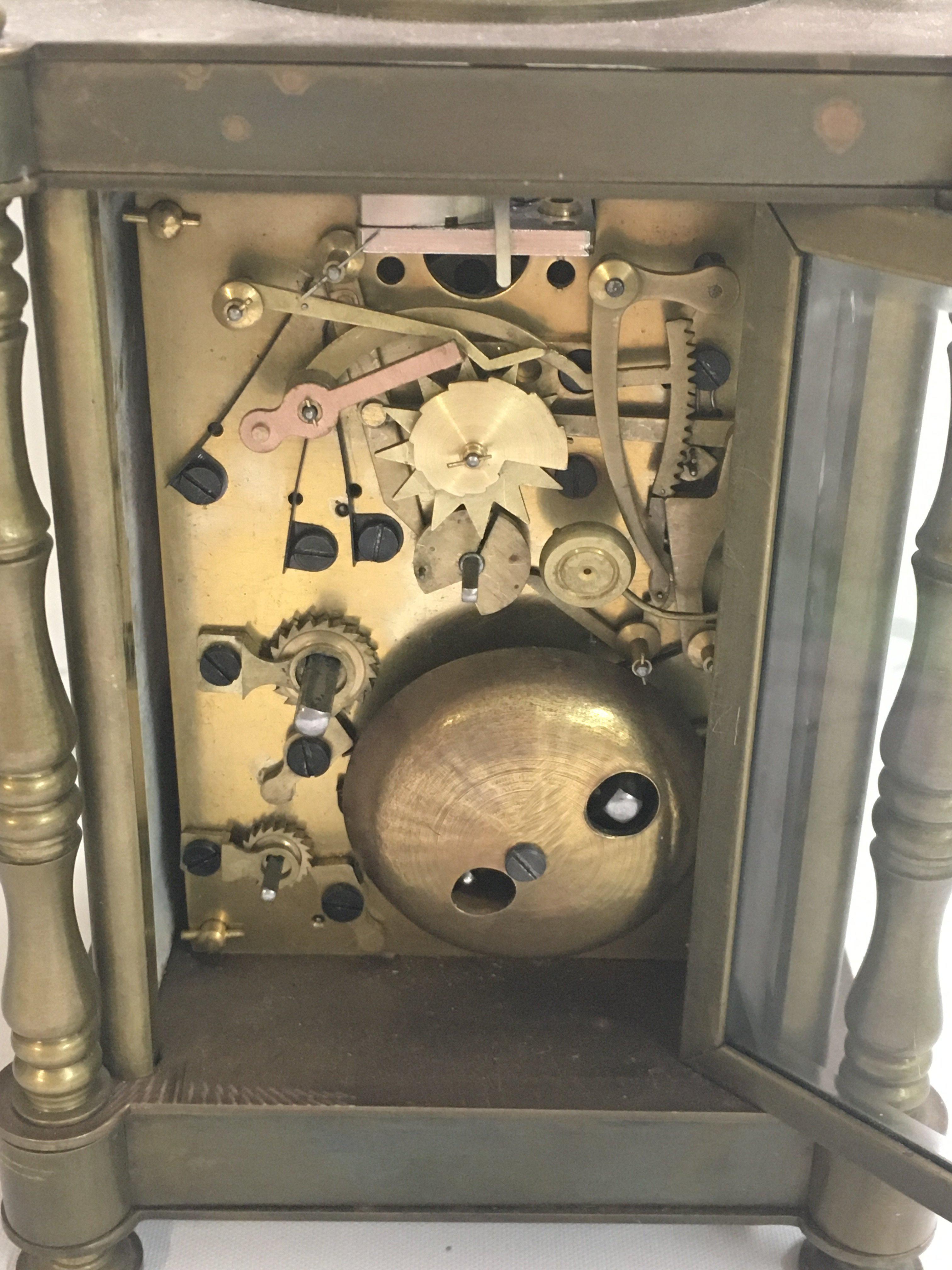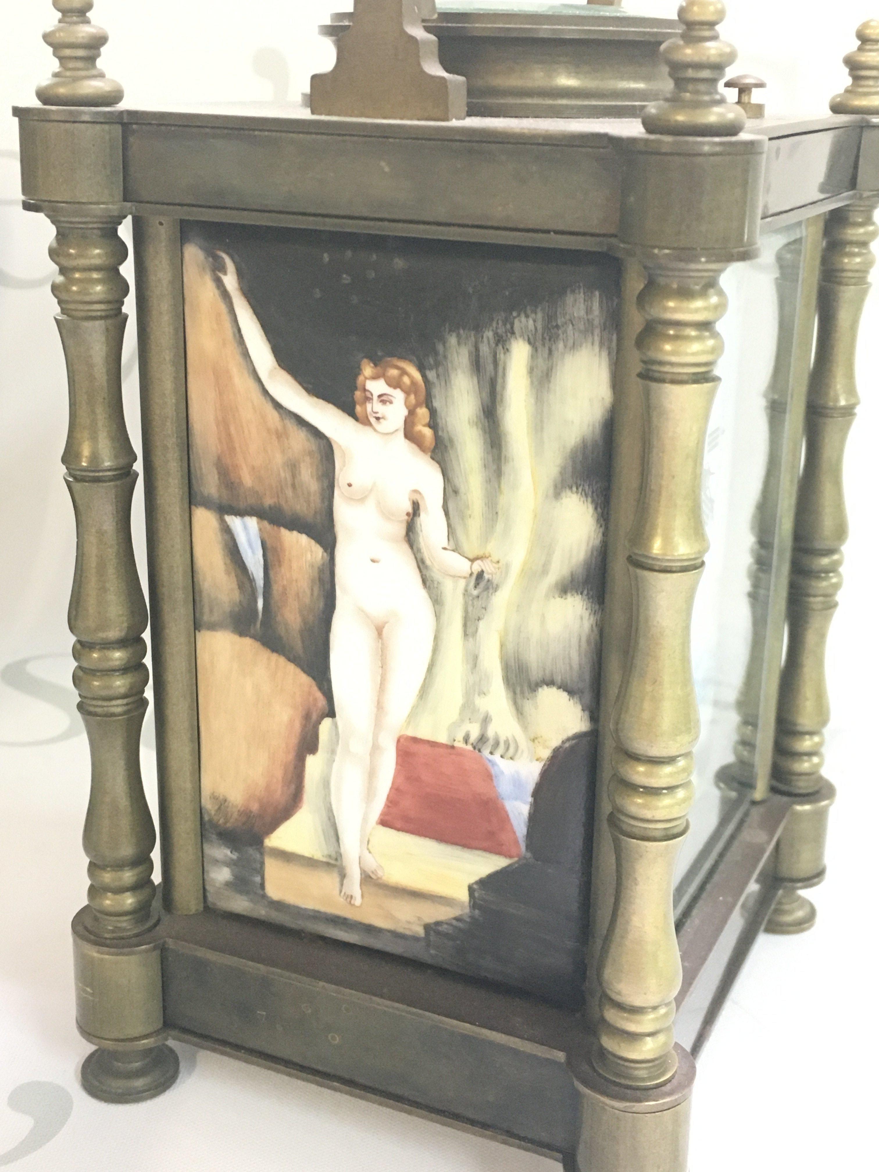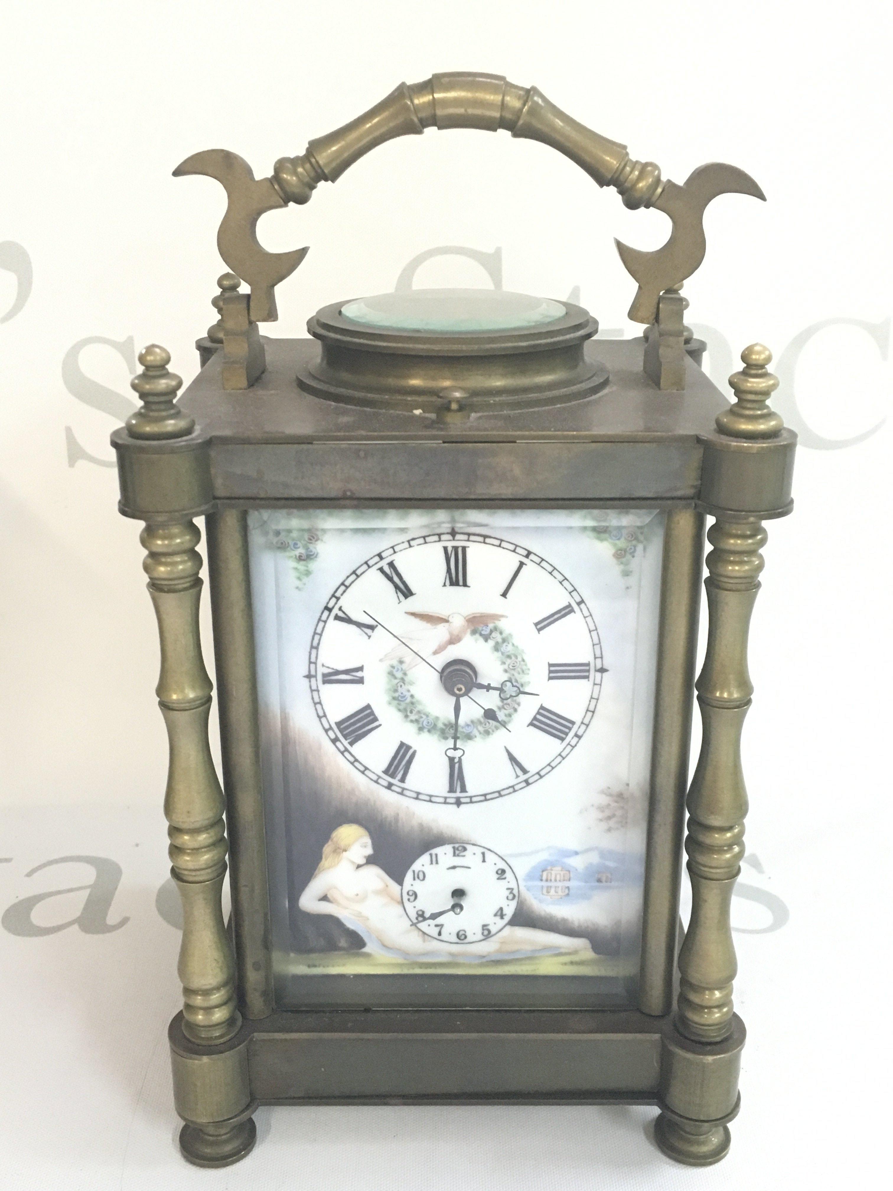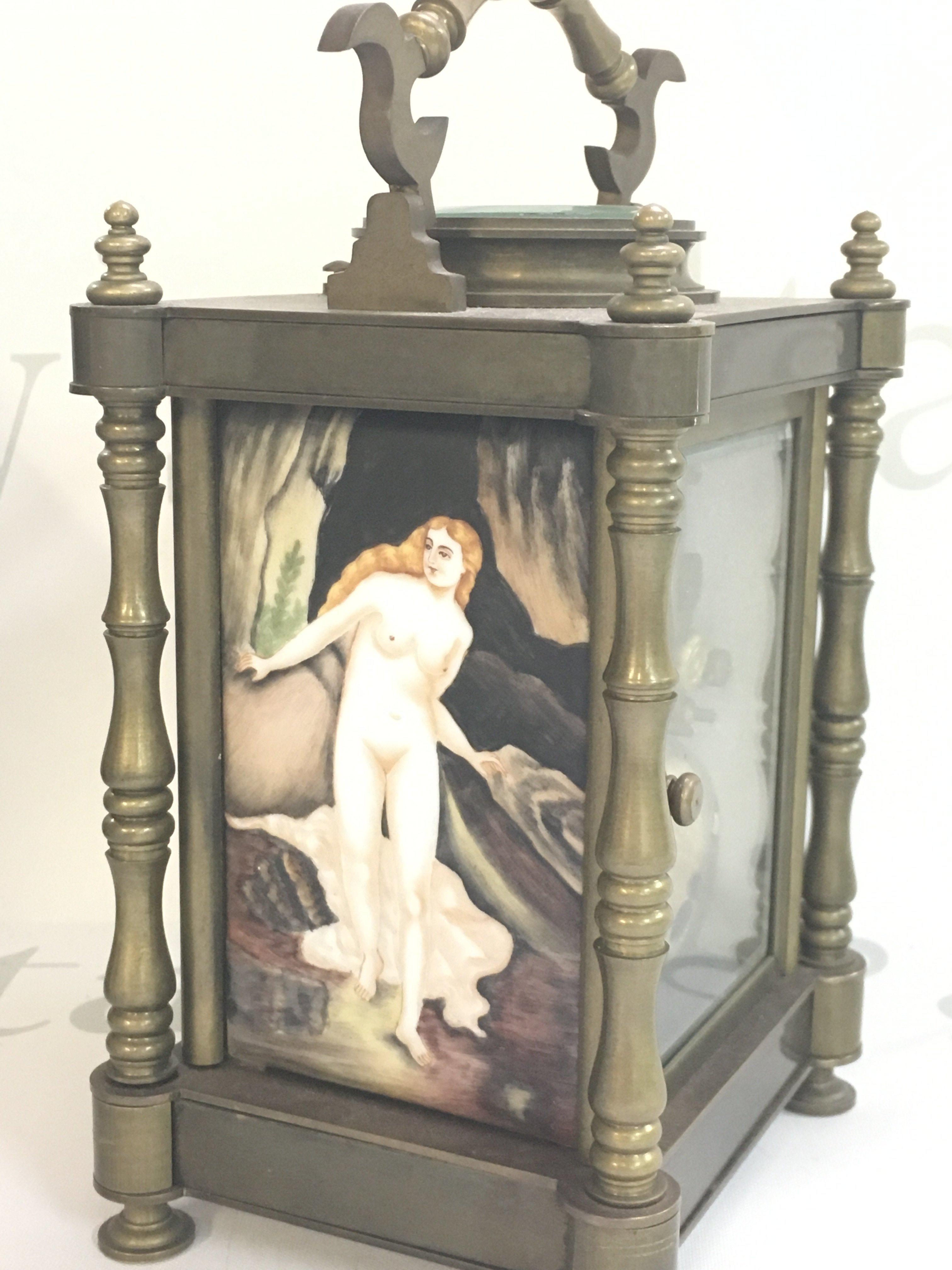 A mid 20th century carriage clock with porcelain panels decorated with nude women. This lot cannot be posted