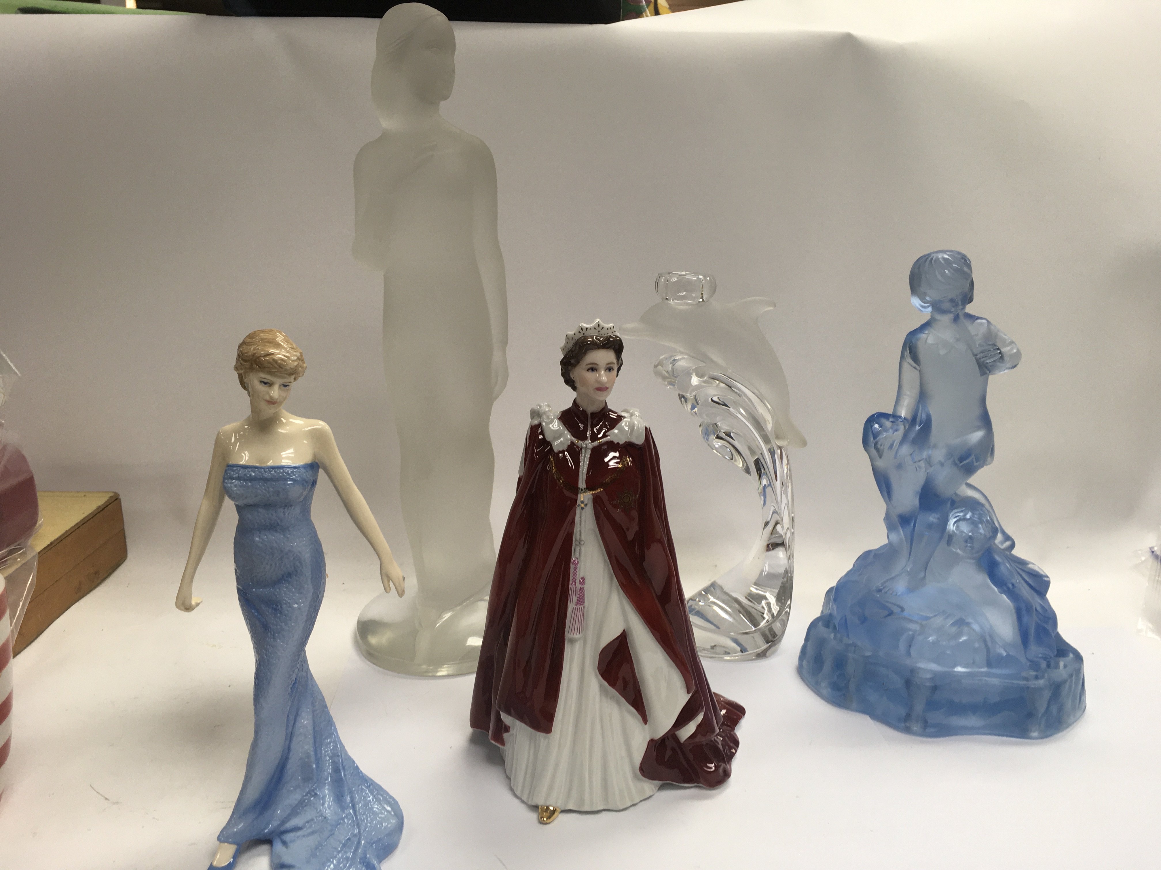A mixed lot including a royal Doulton lady Diana figure and a royal Worcester Queen Elizabeth figure along with some cut glass figures.