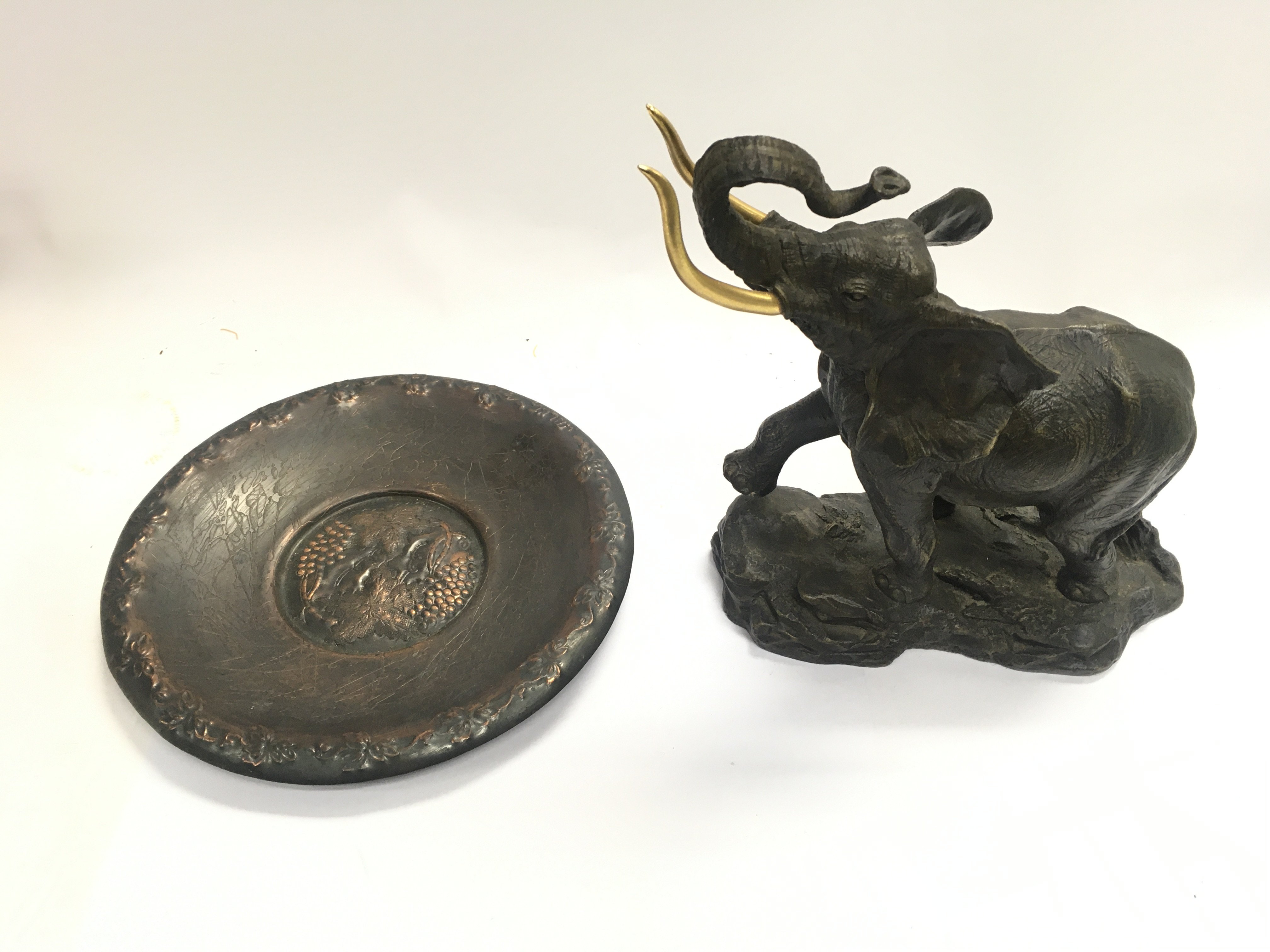 A bronze elephant with a hanging presentation plate.