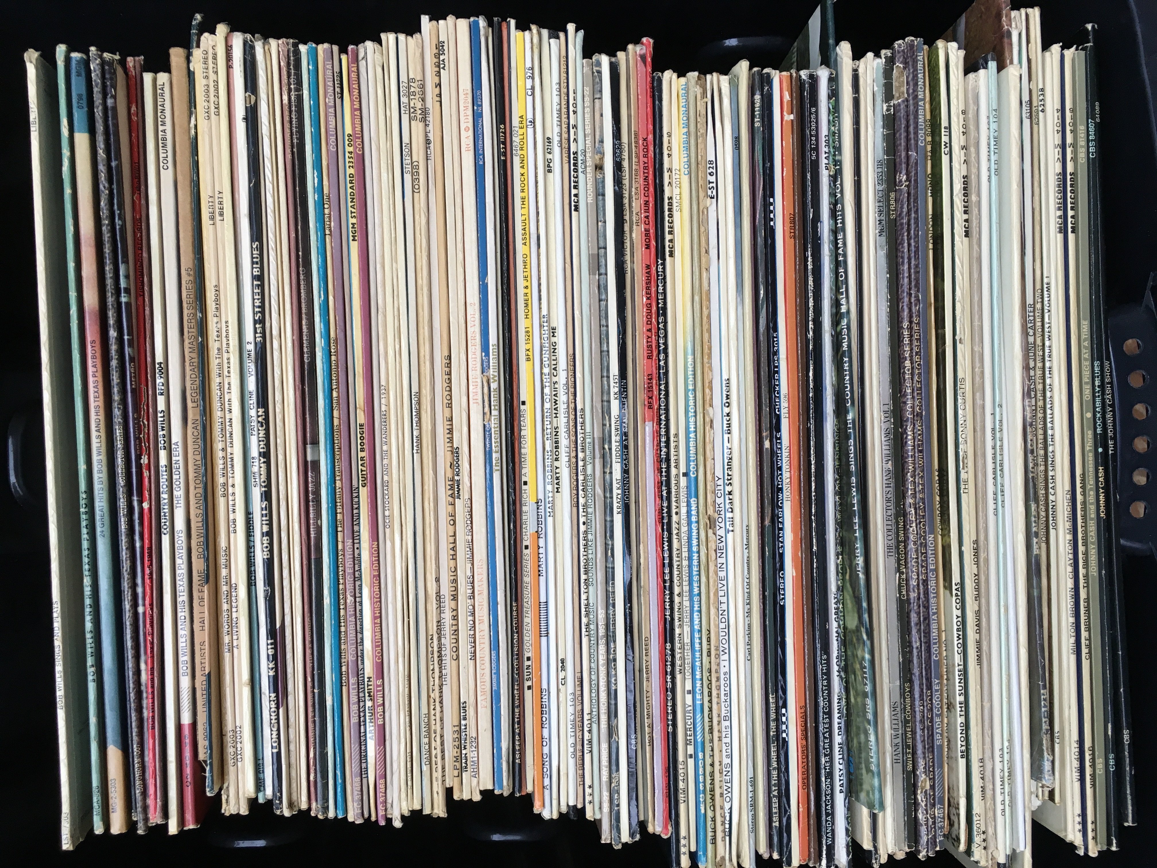 A crate of Western swing LPs by various artists including Johnny Cash, Hank Williams, Carl Perkins and others.