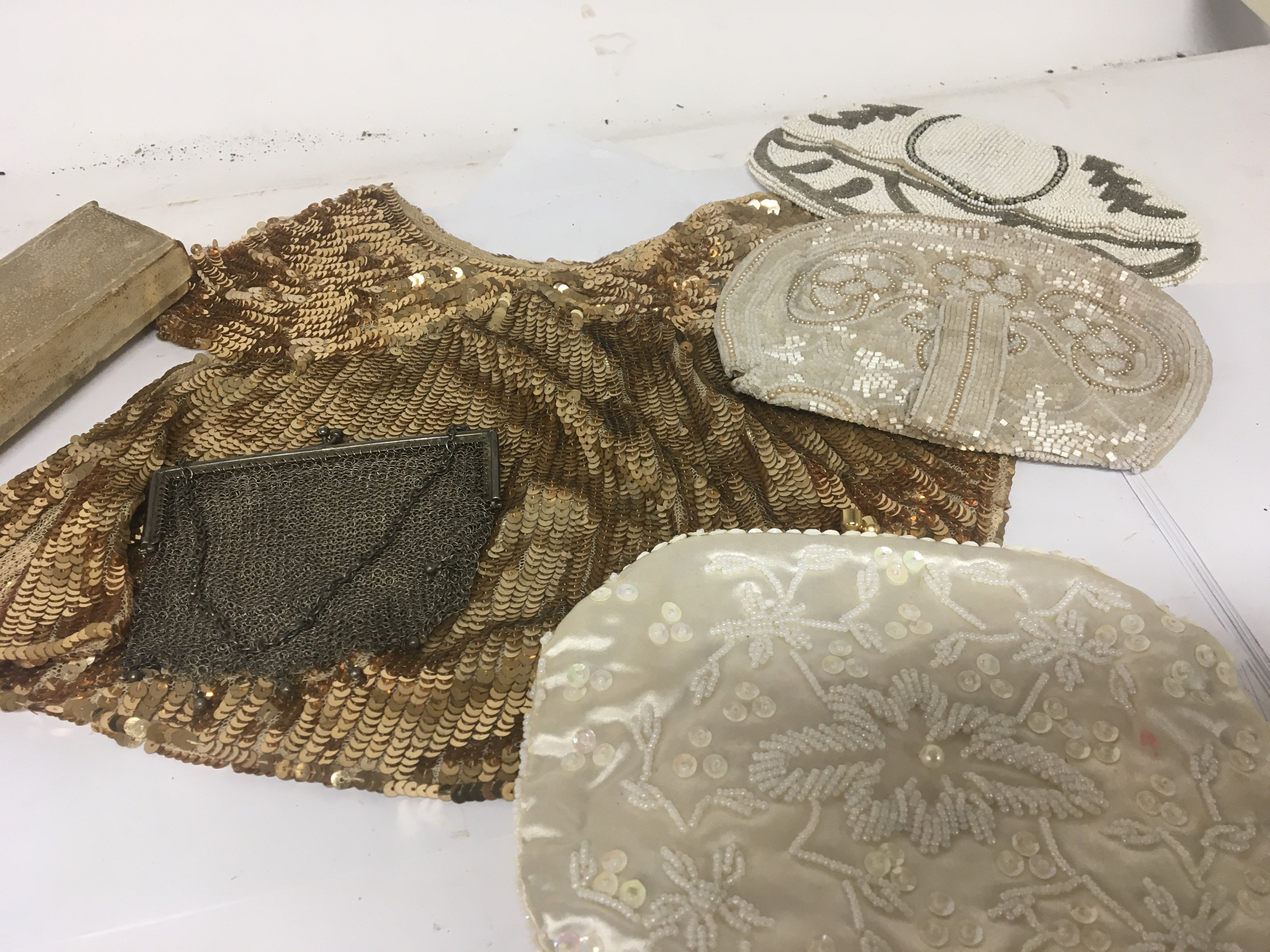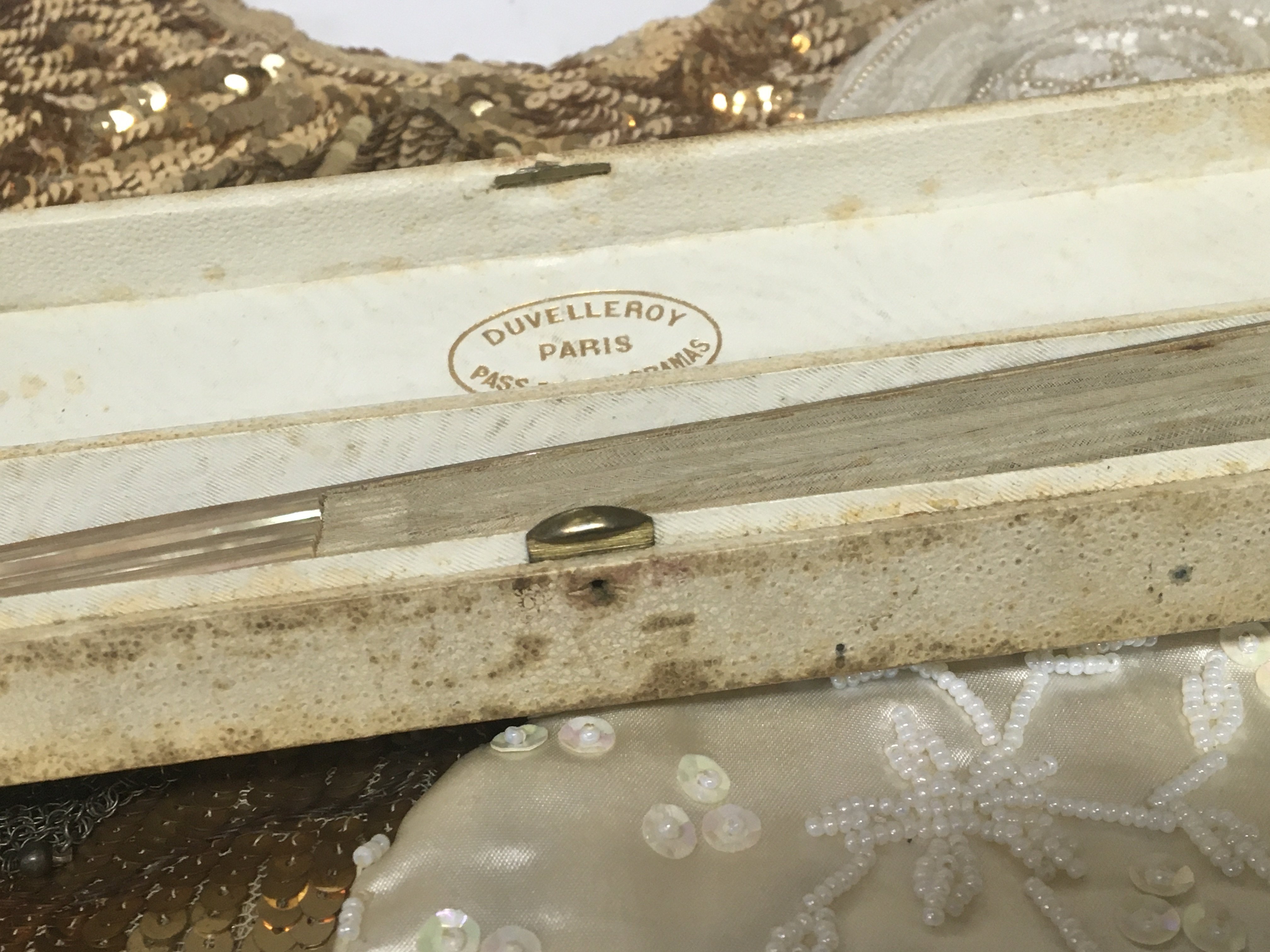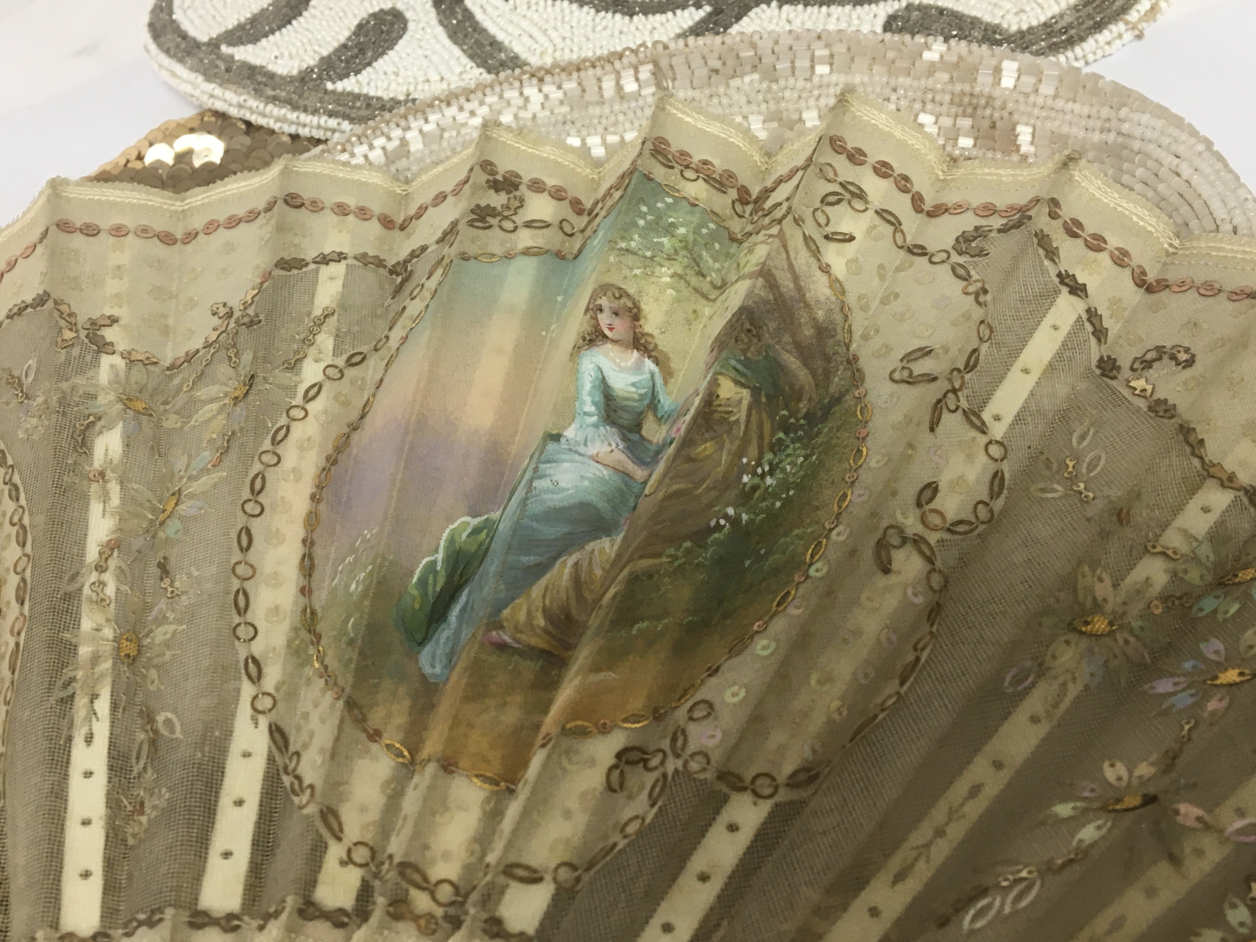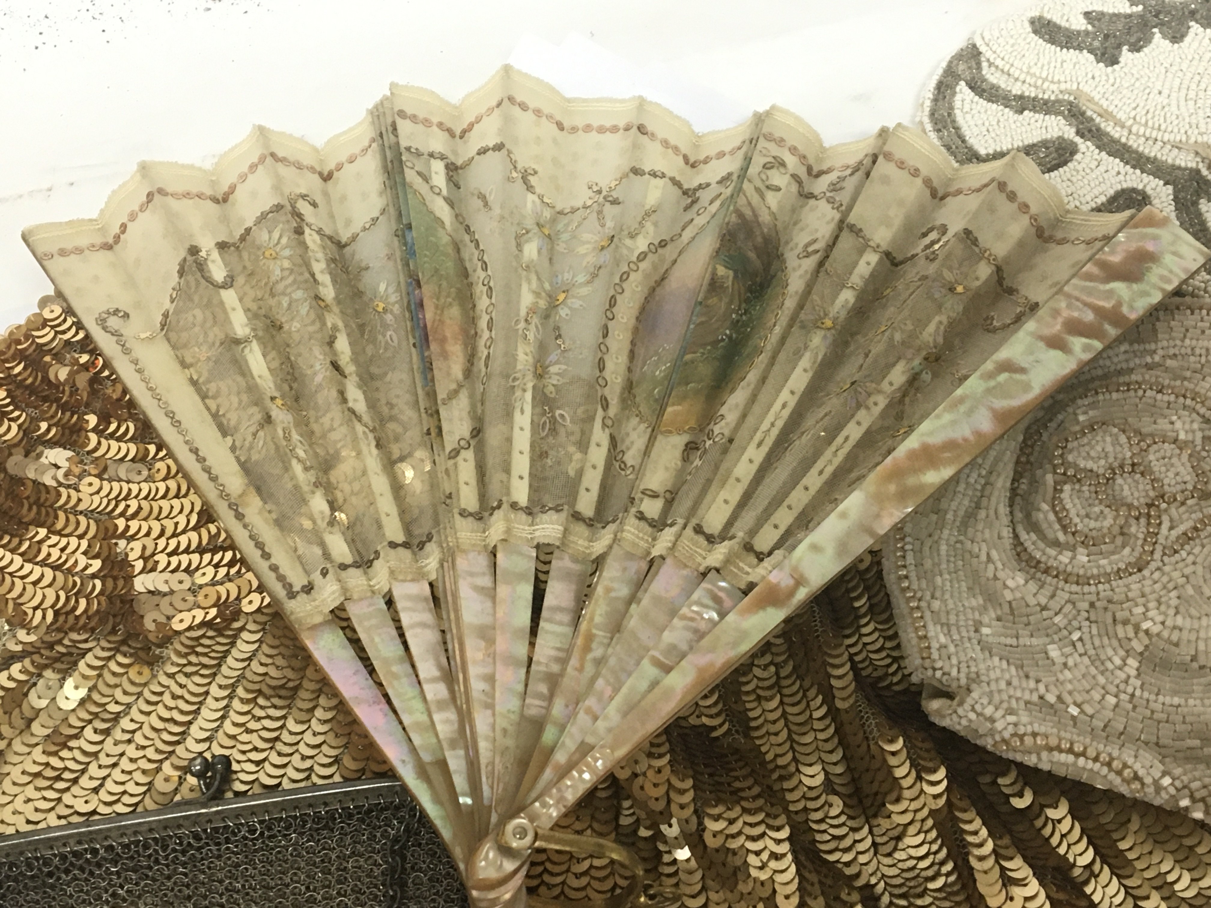 A French fan hand painted ovals on a fine fabric and mother of pearl supports vintage ladies bead work evening bags.