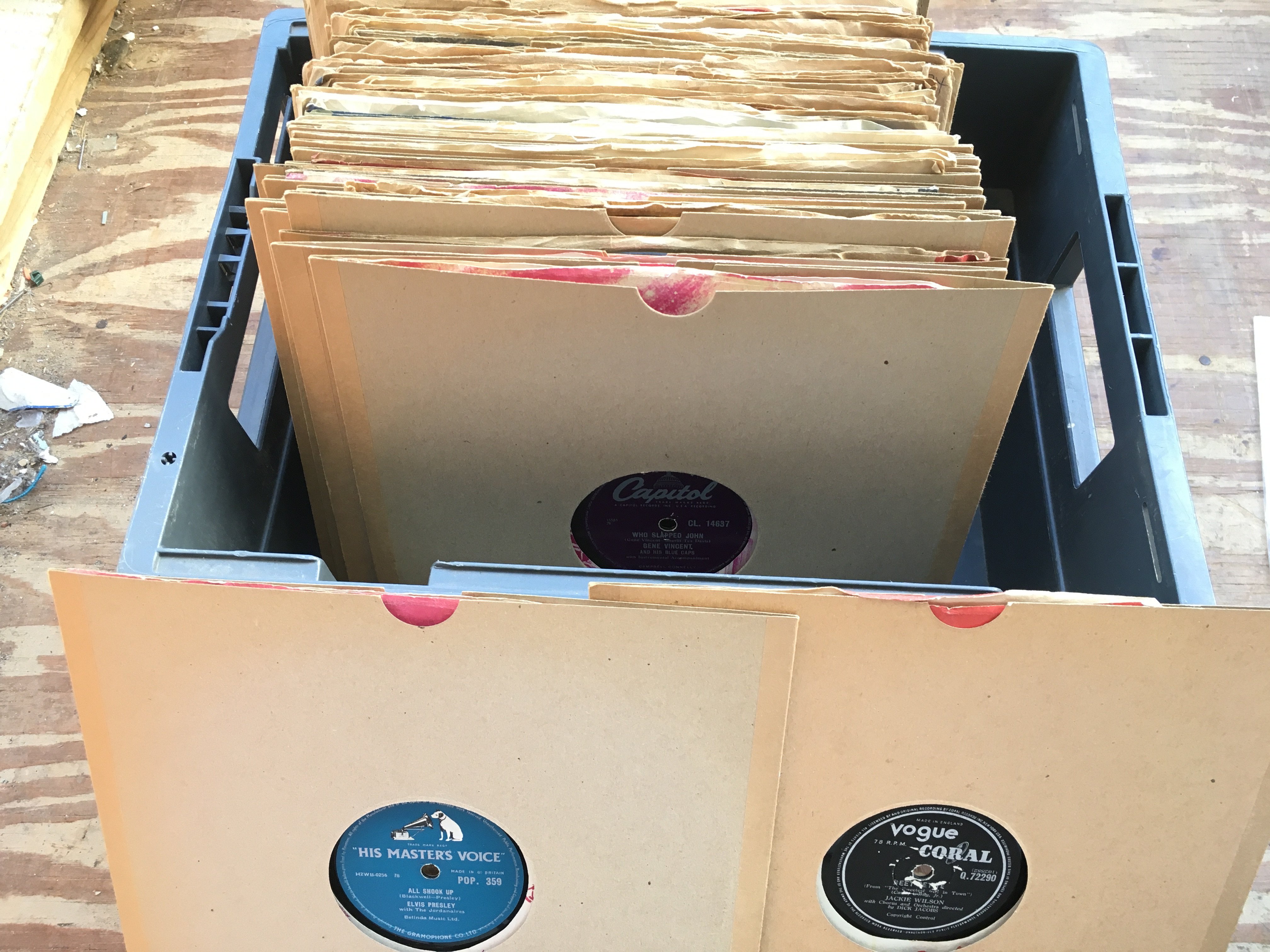 A box of 78s by various artists including Elvis Presley, Gene Vincent, Everly Brothers and others.