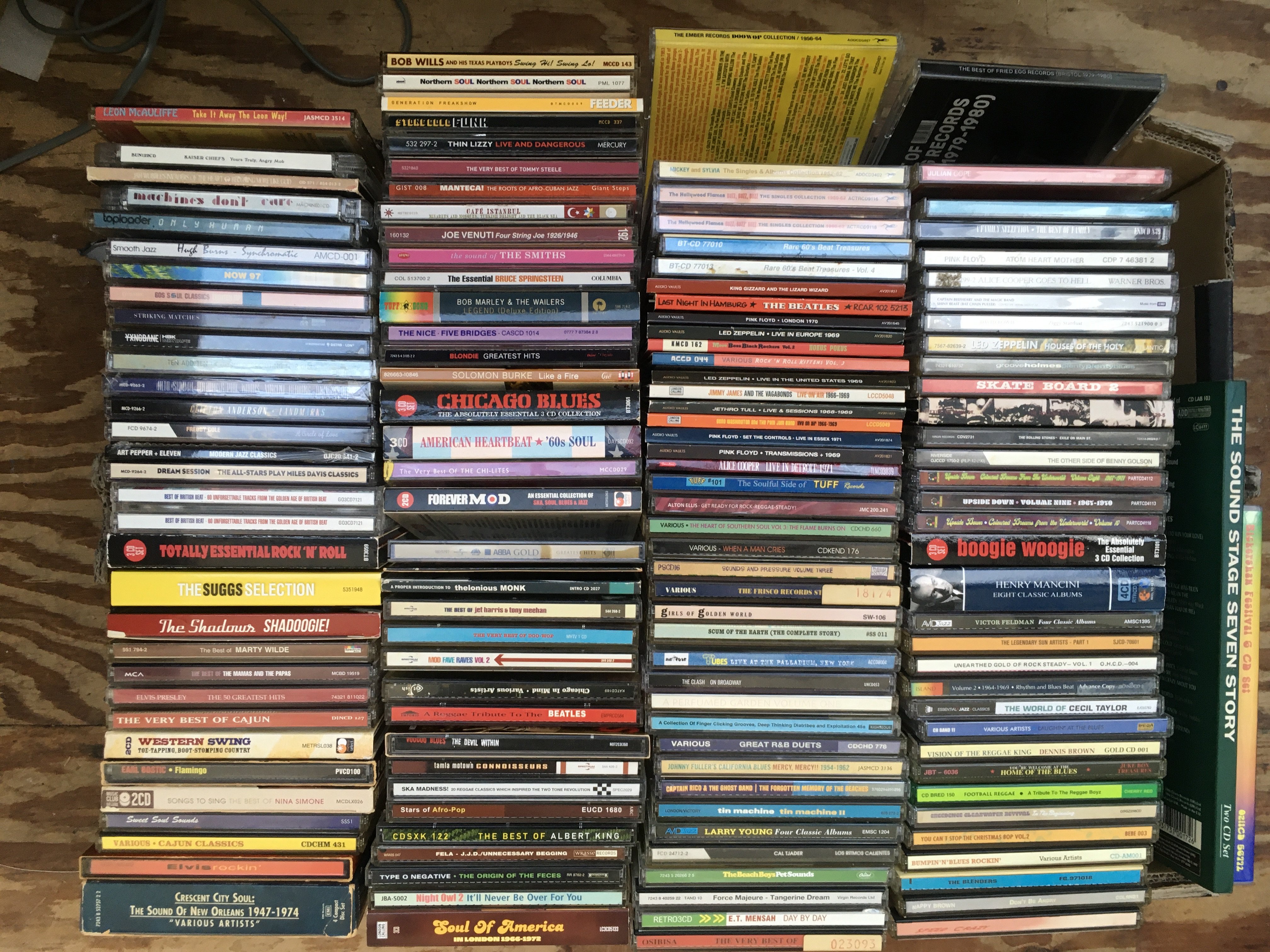 A box of over 140 CDs by various artists including The Beatles, Rolling Stones, Led Zeppelin and others.