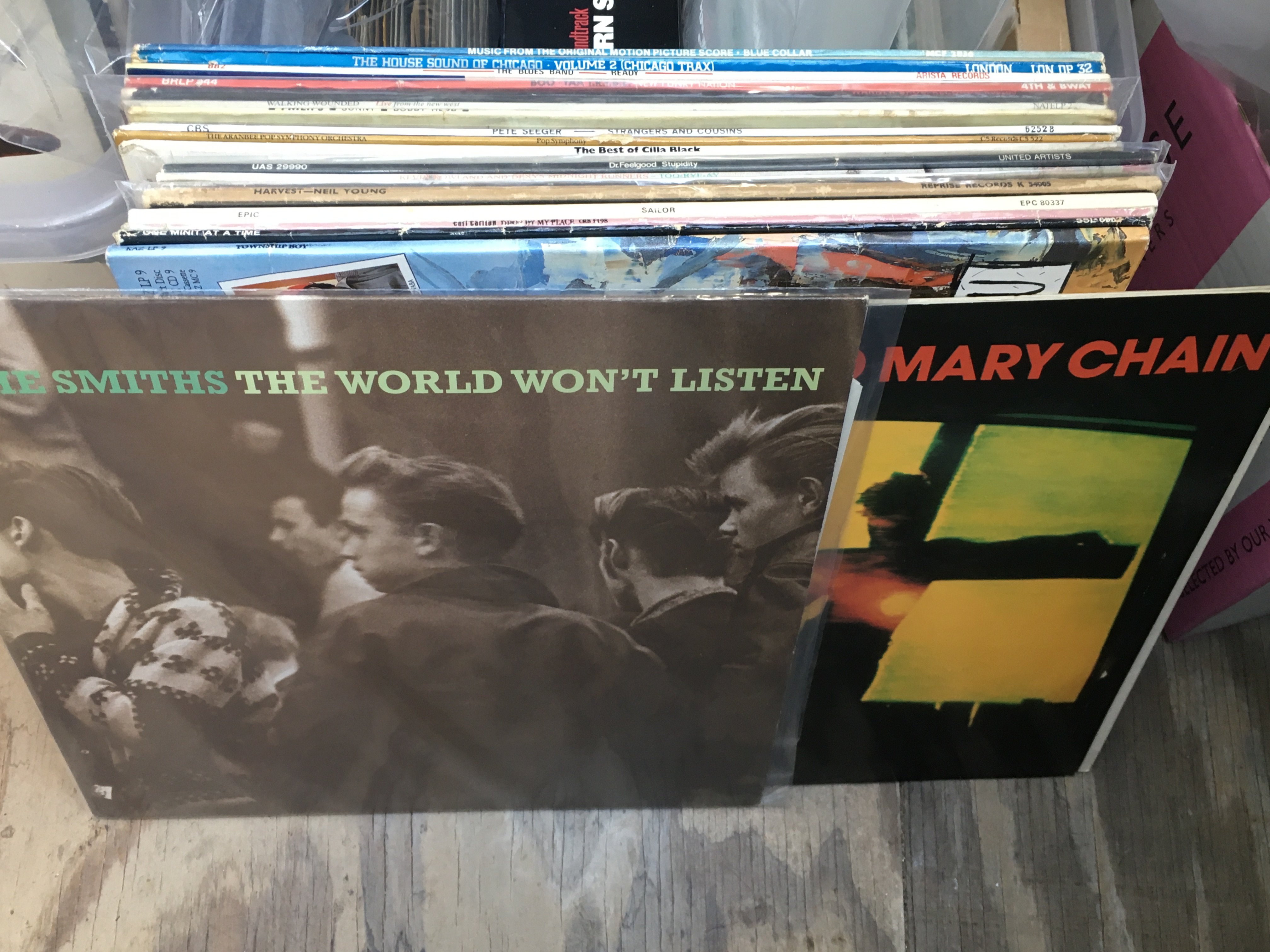 A bag of LPs and 12" singles by various artists including The Smiths, Jesus And Mary Chain and others.