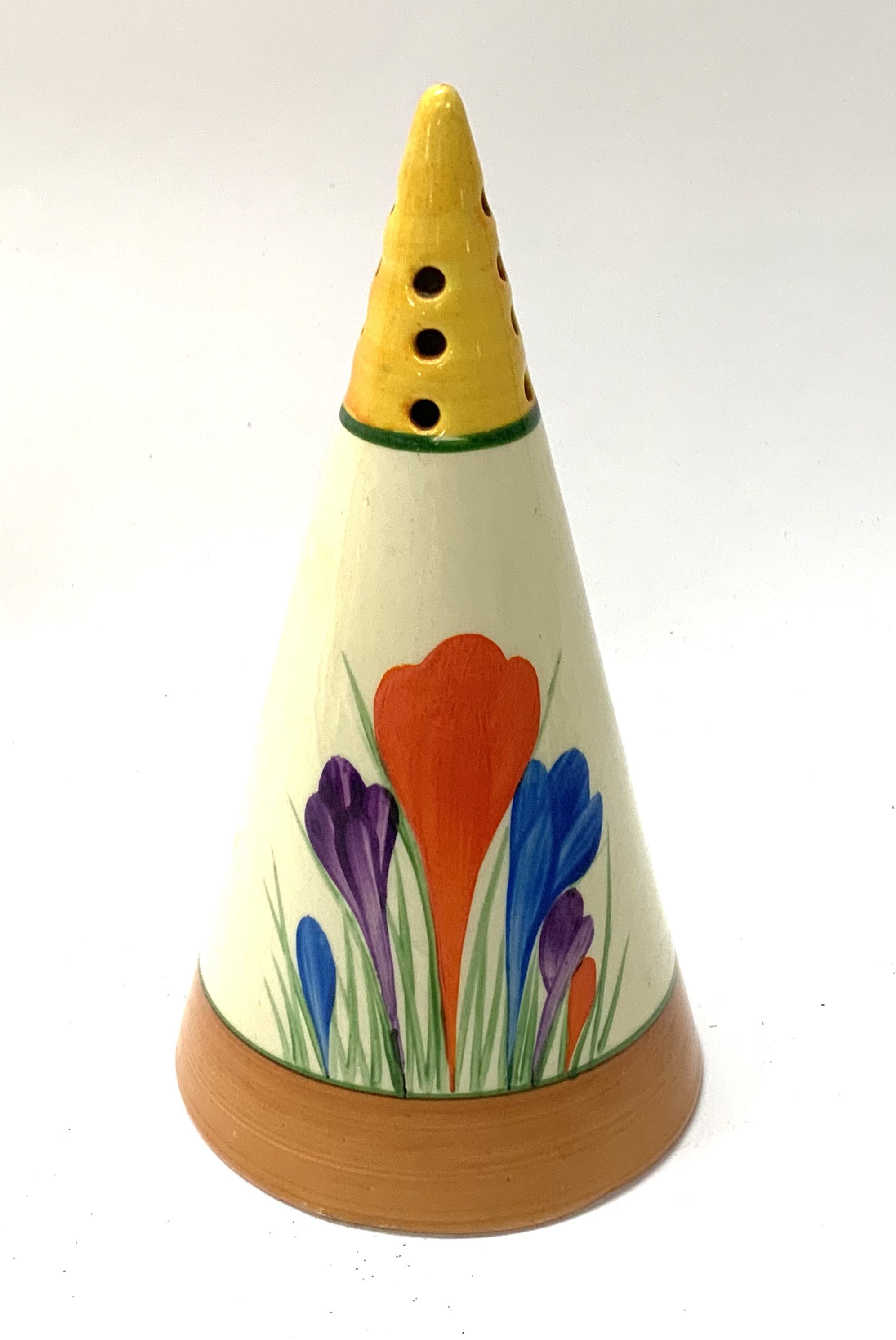 A Clarice Cliff Bonjour sugar sifter decorated in the 'Spring Crocus' pattern, painted.