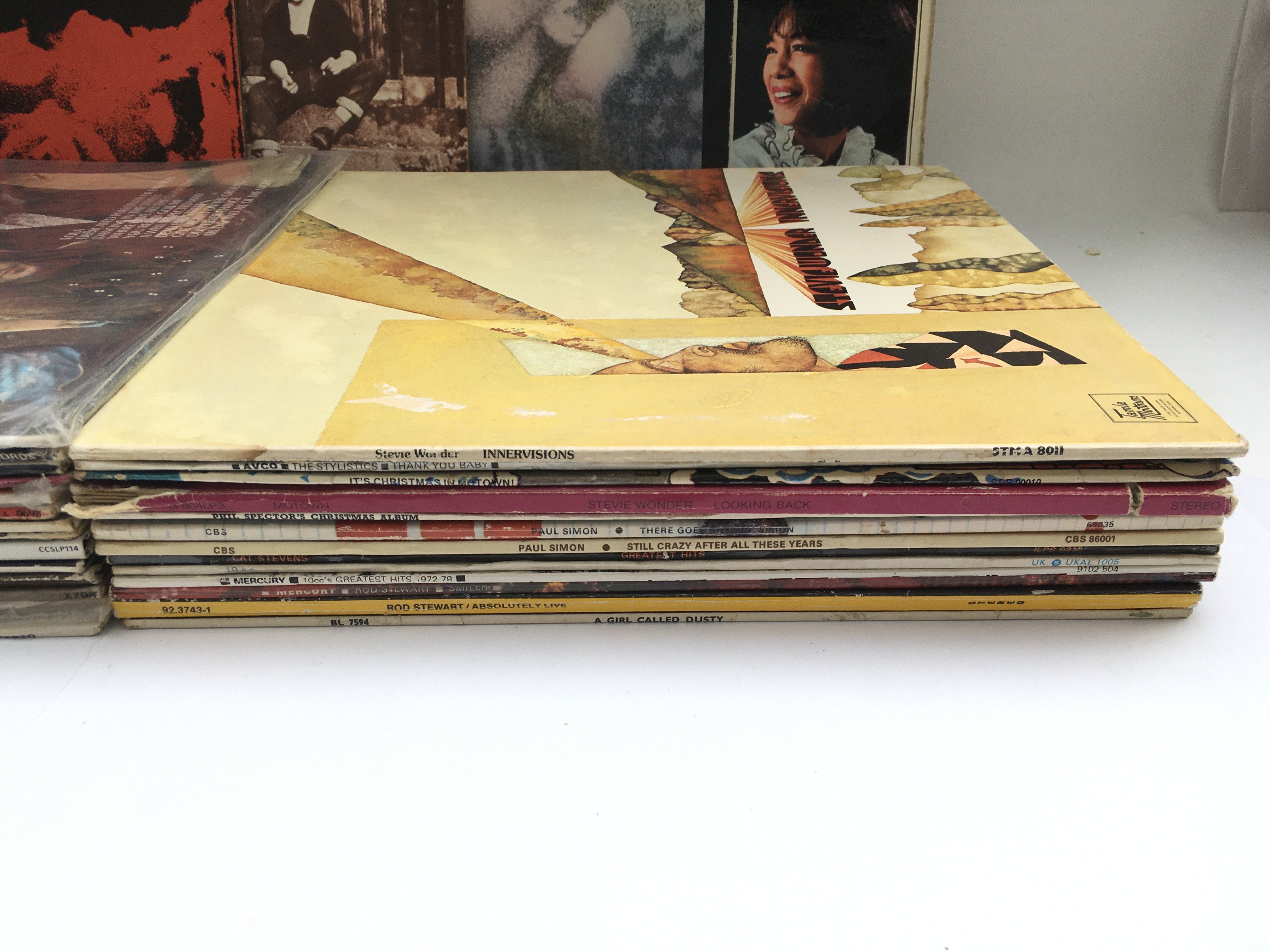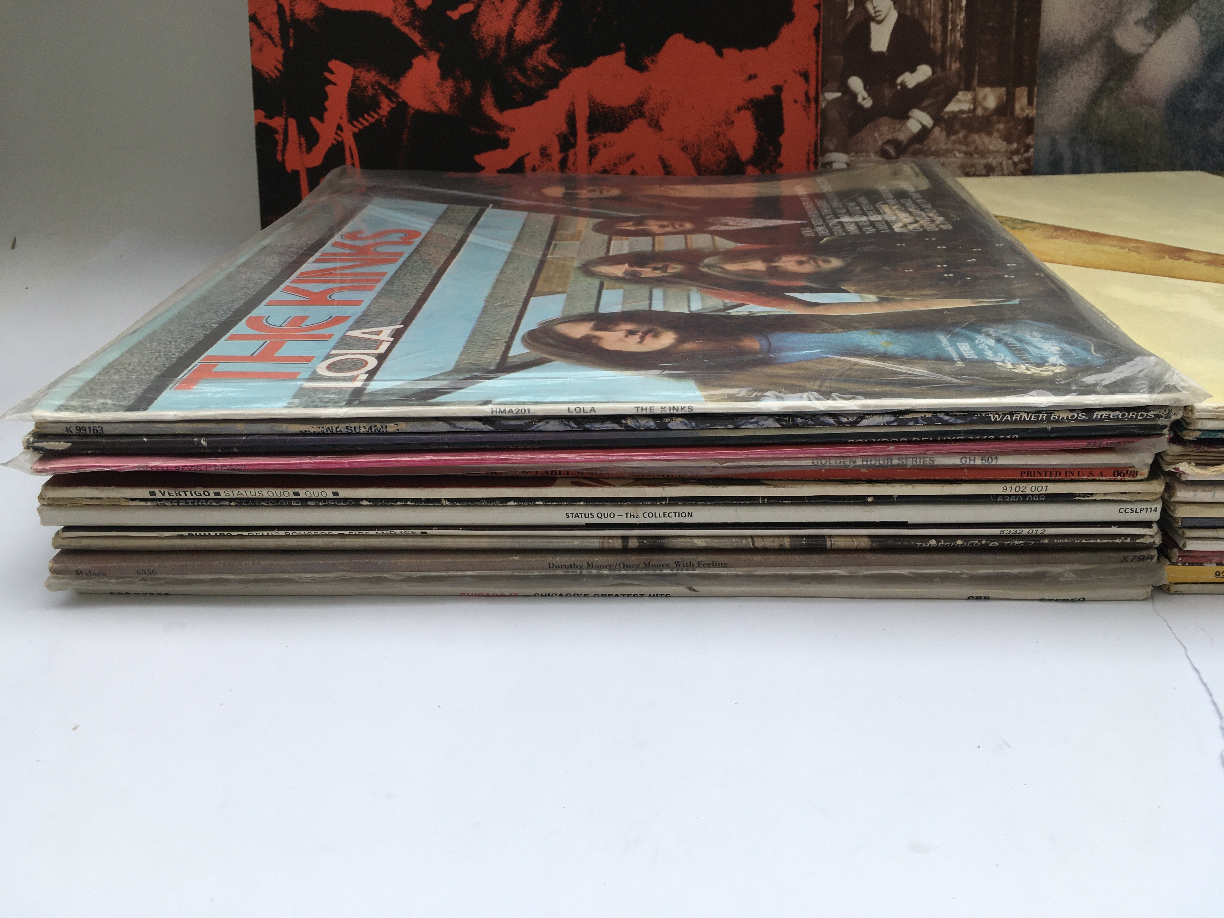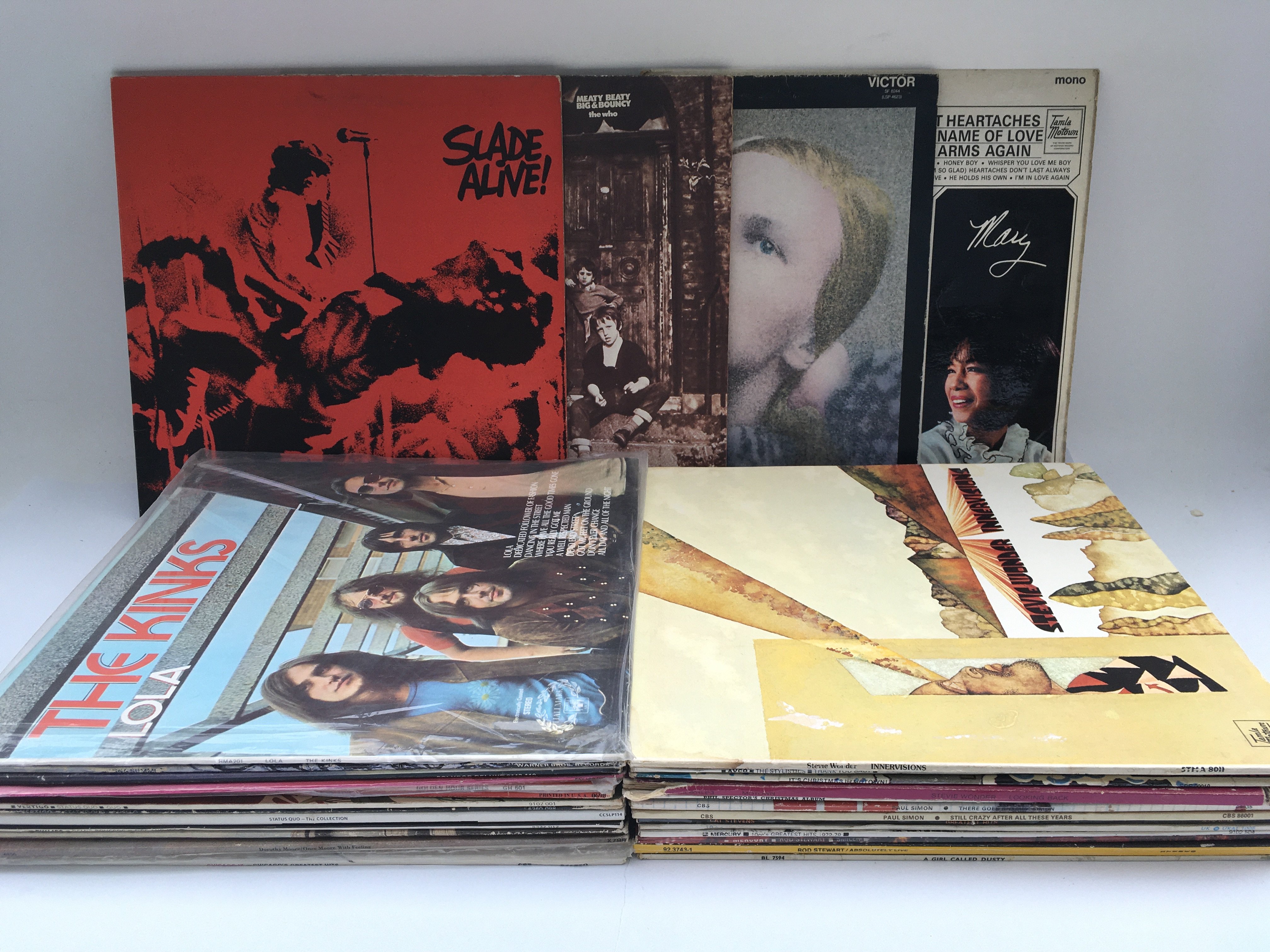 A collection of LPs by various artists including David Bowie, The Who, The Kinks and others.
