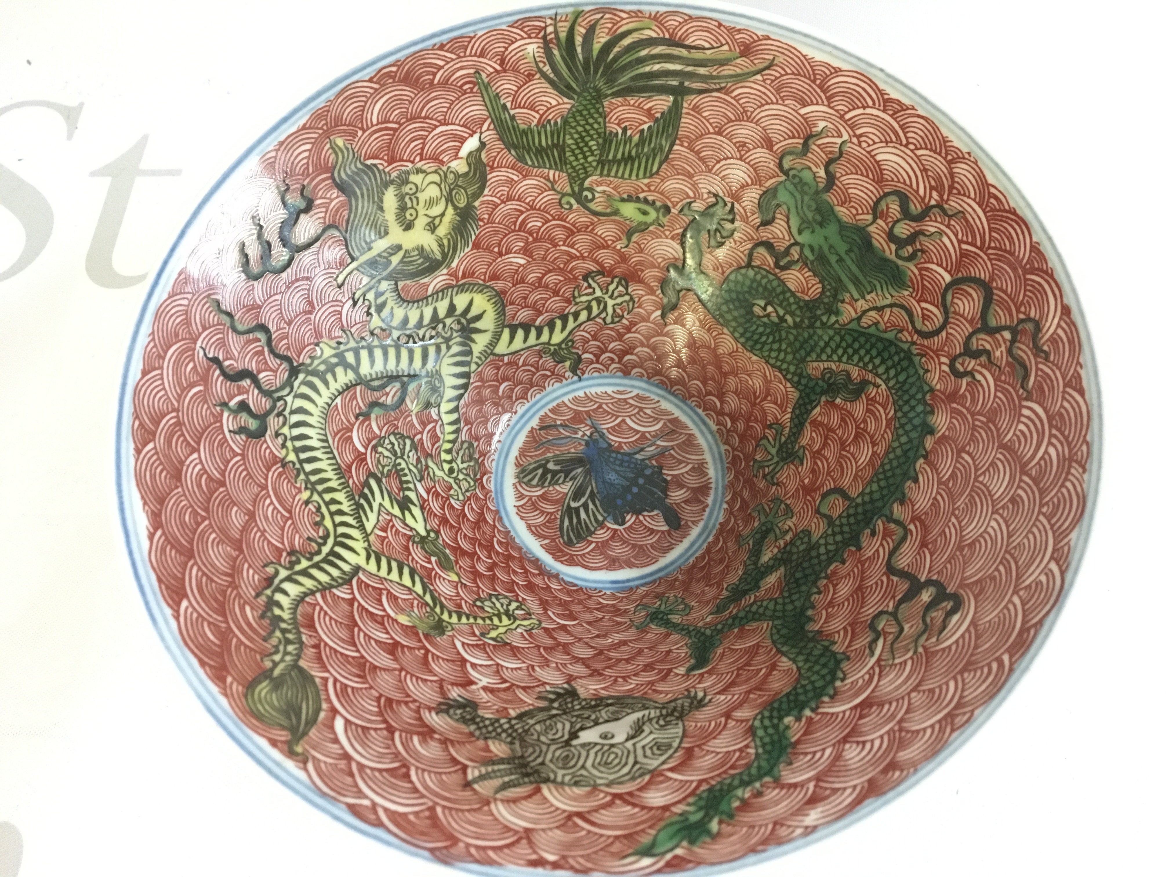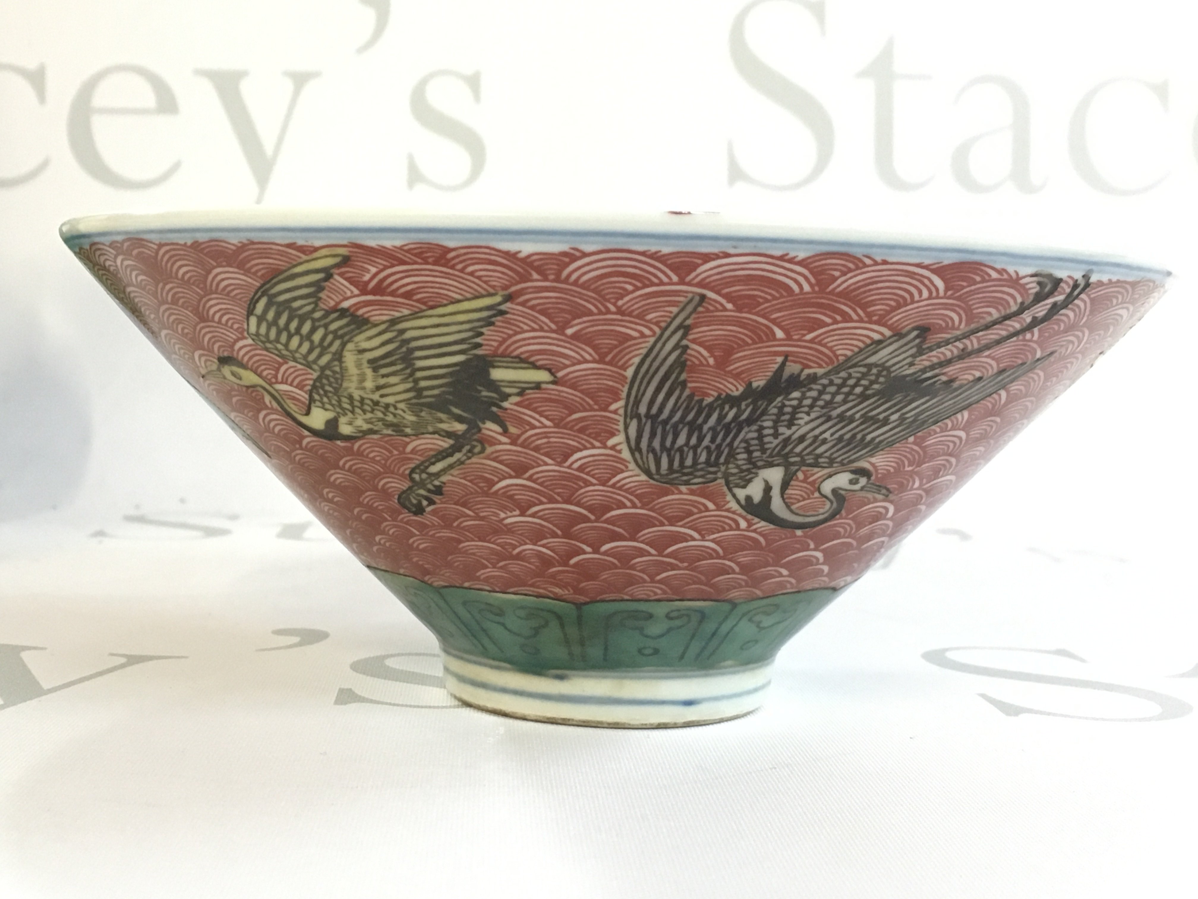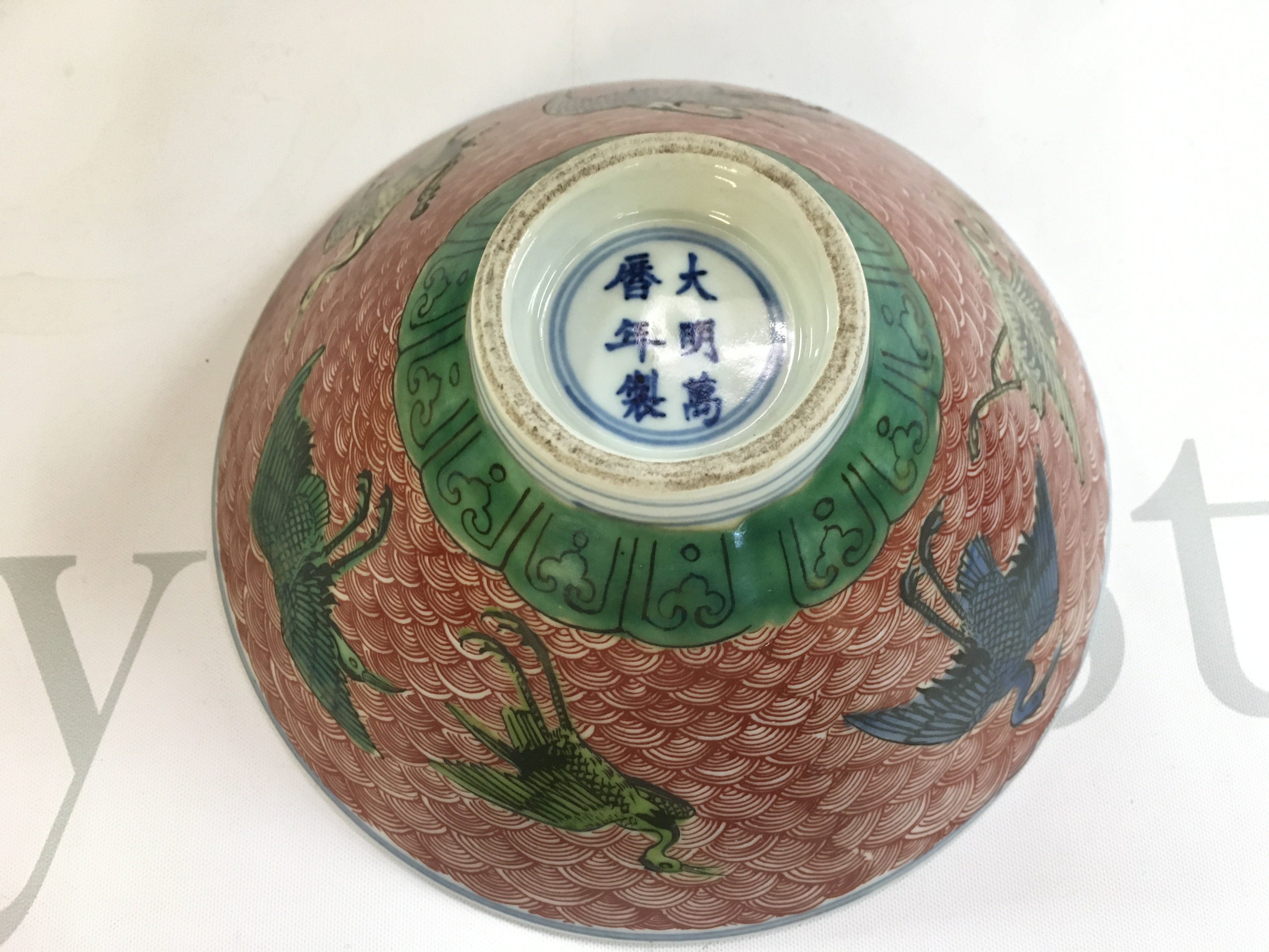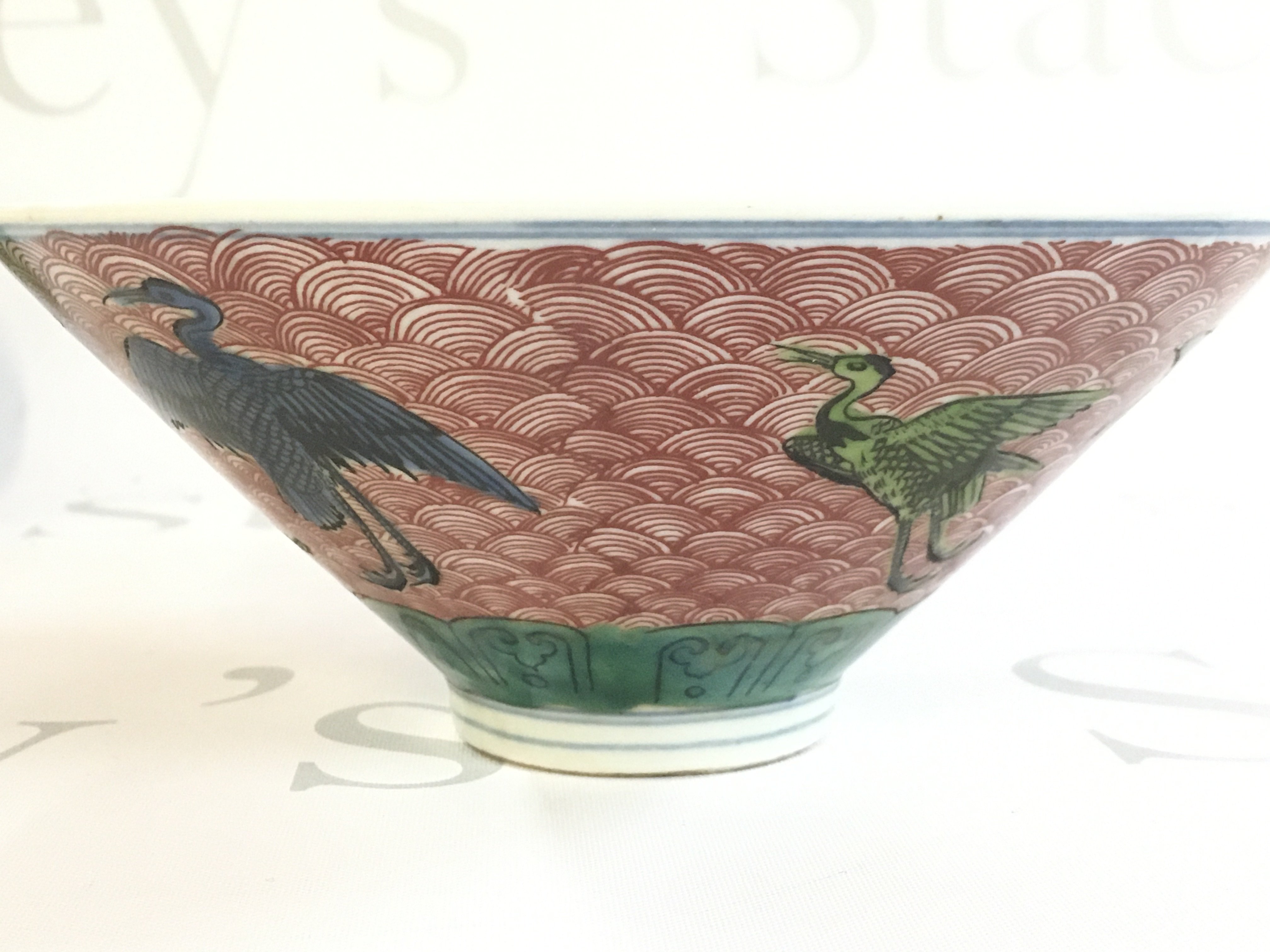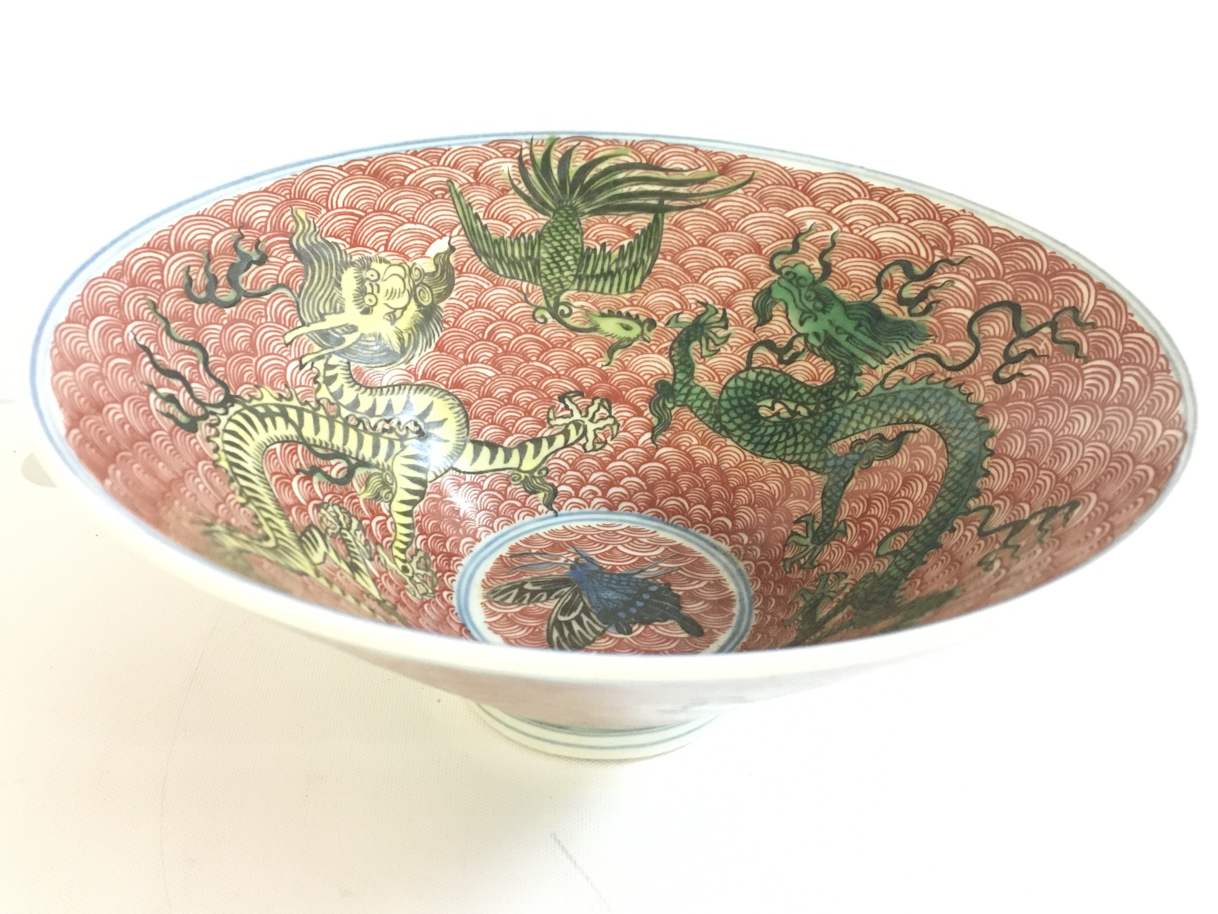 A Chinese Dragon and Crane porcelain bowl . Six figure mark at the base. 7cm tall, 16cm wide. This lot cannot be posted