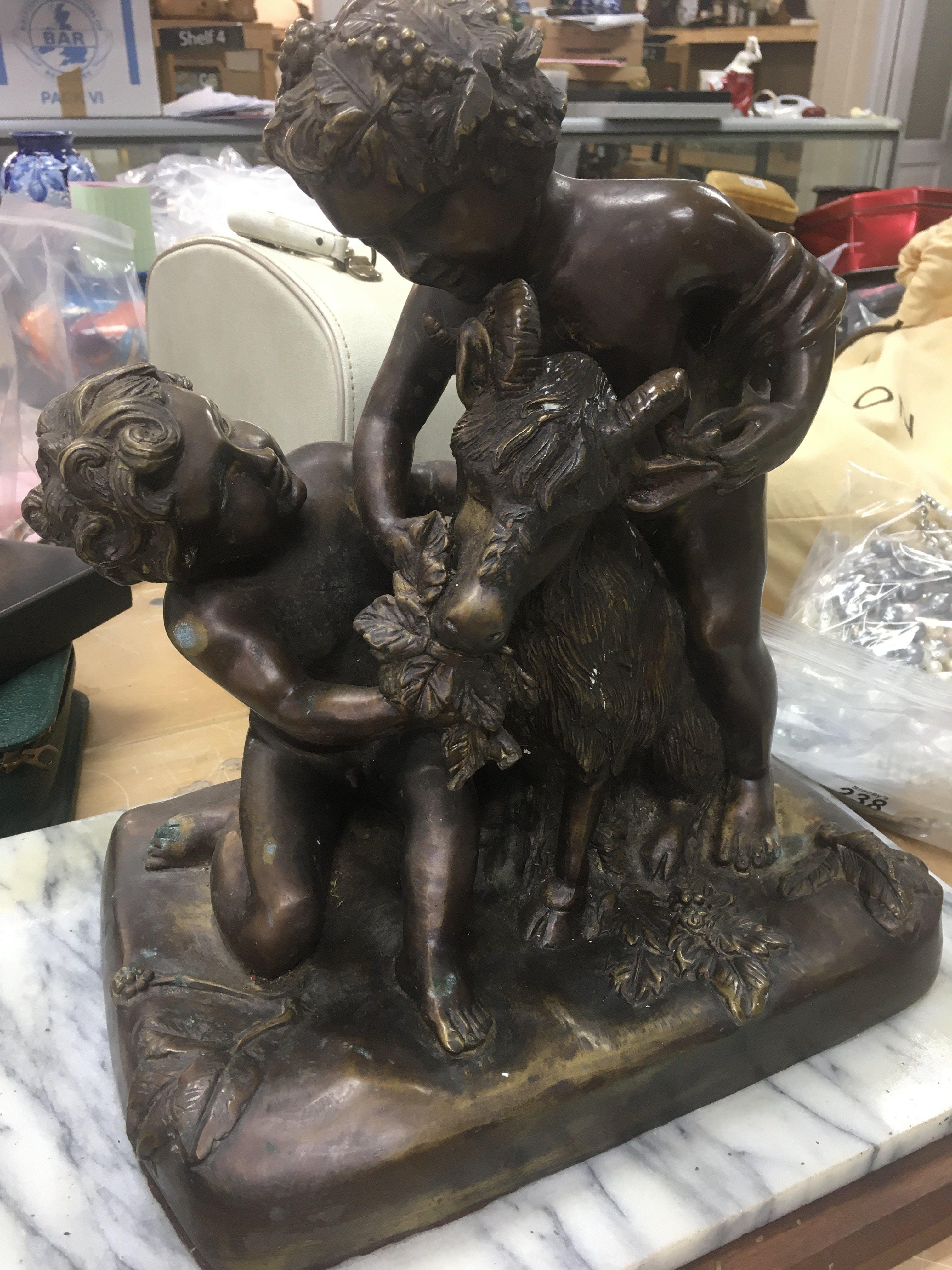 A bronze classical figure group depicting cherubs and goat .