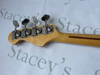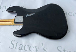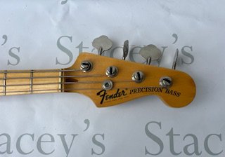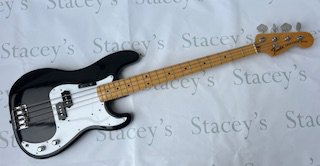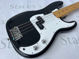 A 1974 Fender USA Precision Bass Guitar in black. Body only refinish with nice patina. Changed pick guard and controls. Original pickups and pots and internals have been checked. Wear to back exposes grey primer, nice patina to body so early refinish. Tarnishing to brightwork. Very light wear to frets. Comes with non original case.