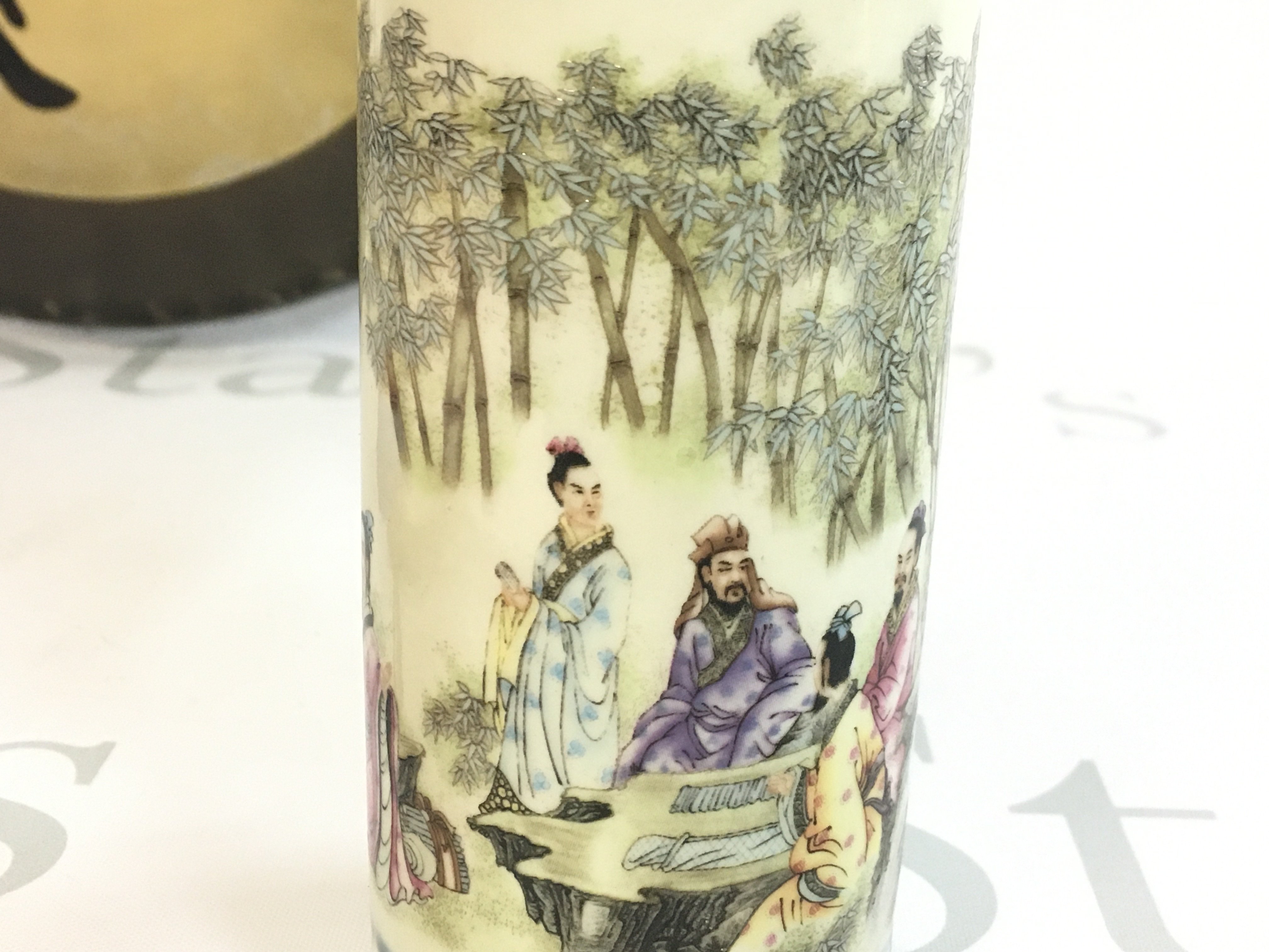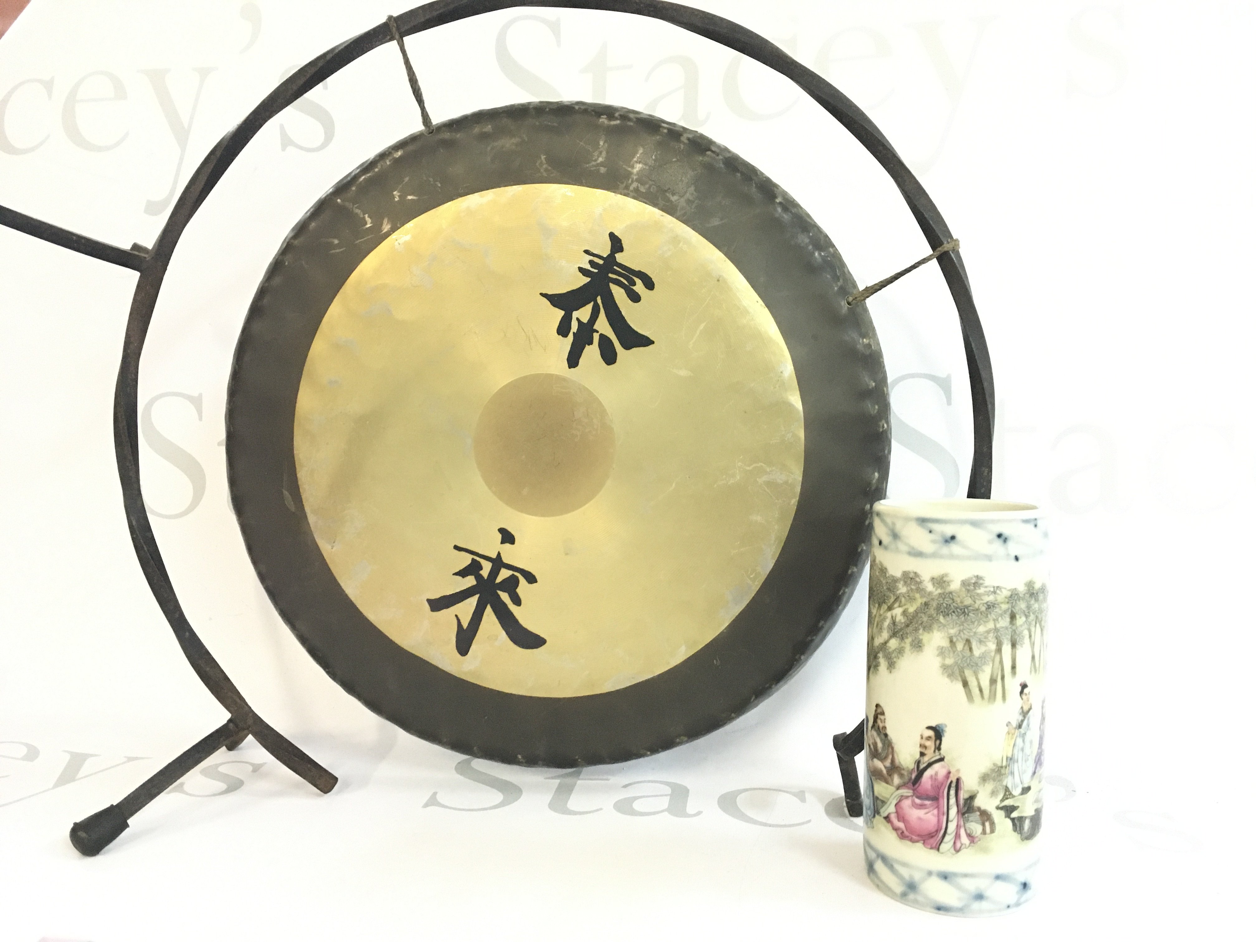 A Chinese bronze gong with an iron frame (30cm tall) and a small Chinese porcelain brush pot 12cm tall. This lot cannot be posted